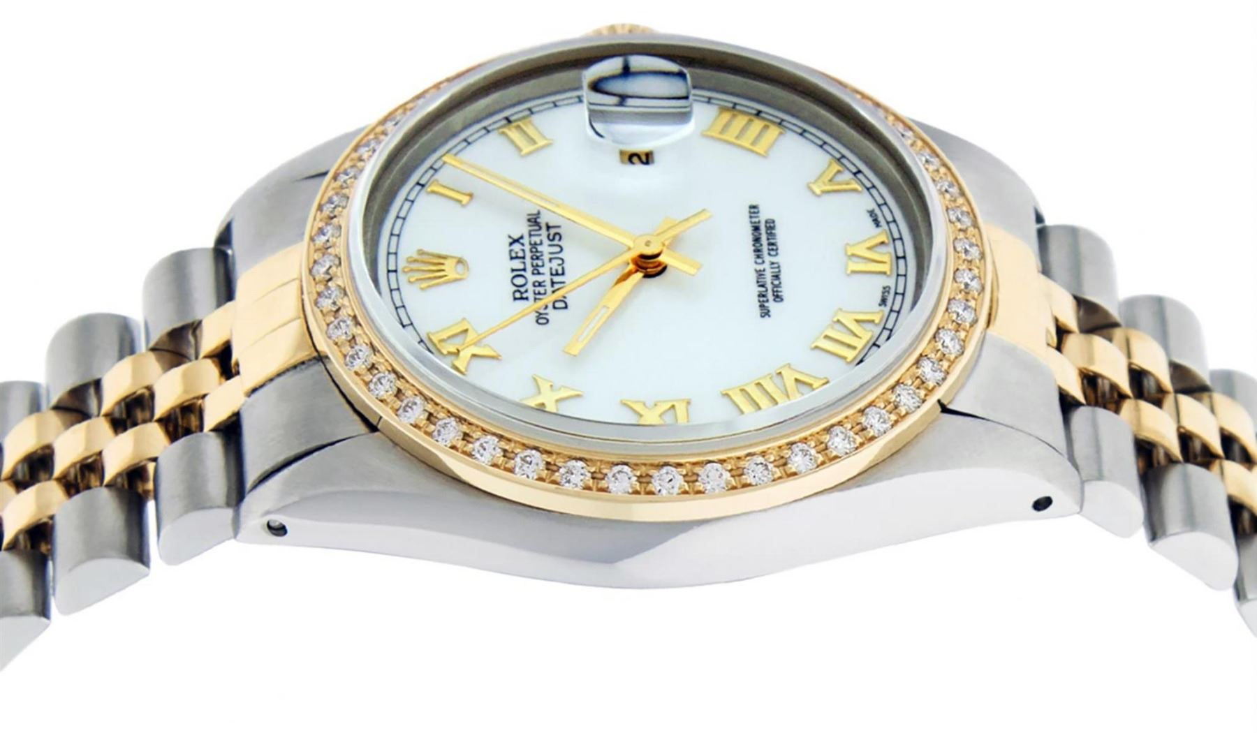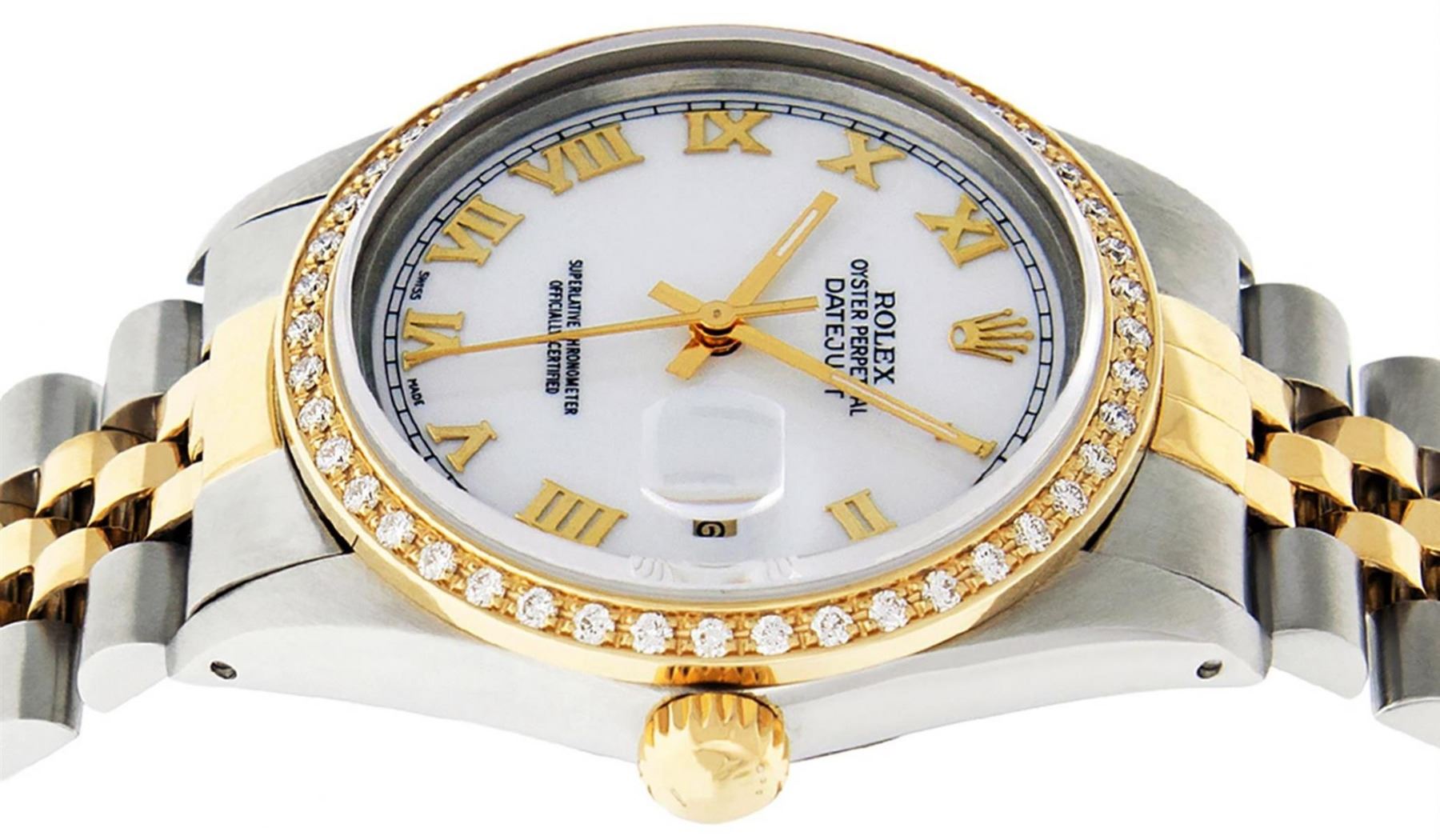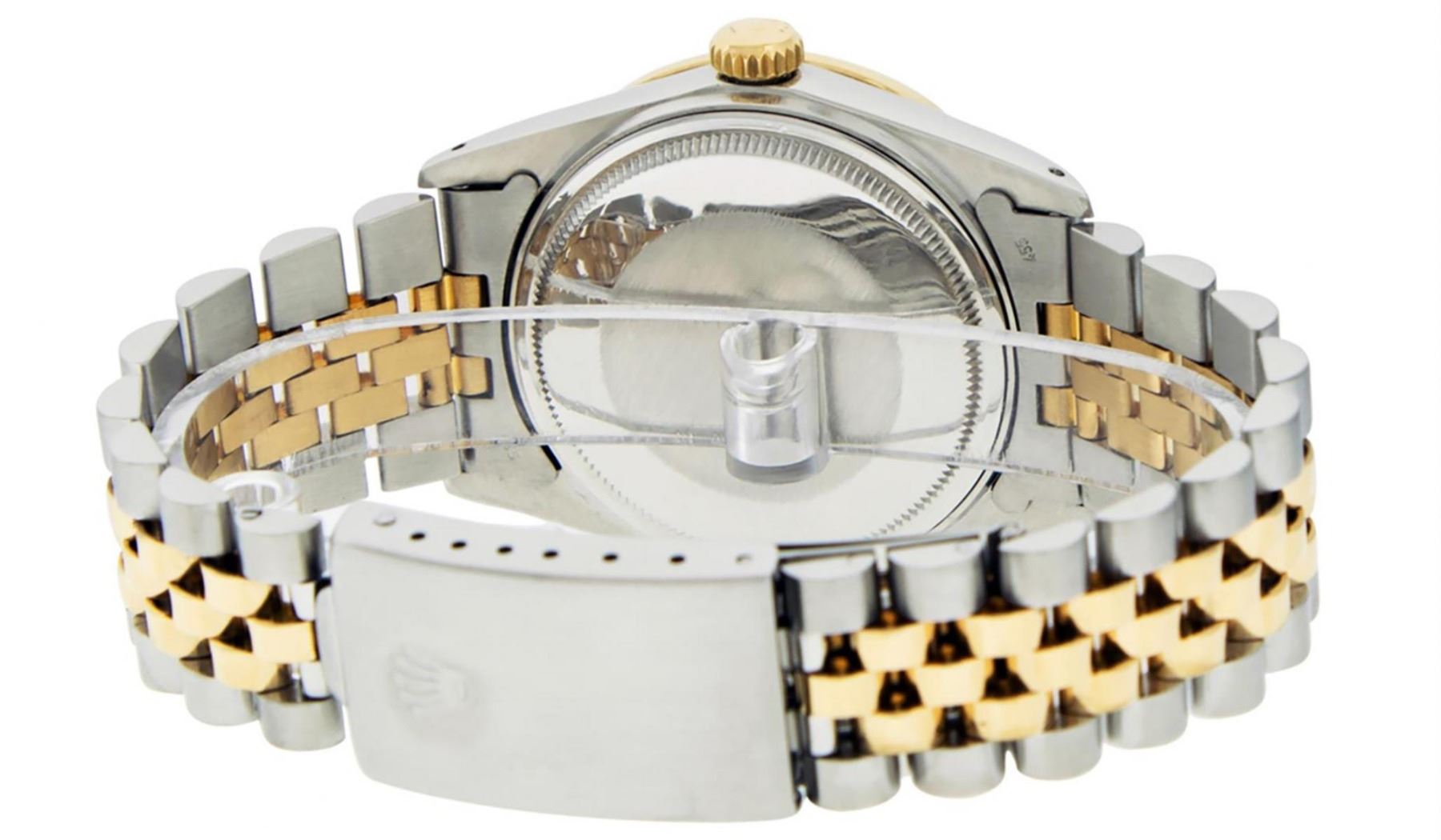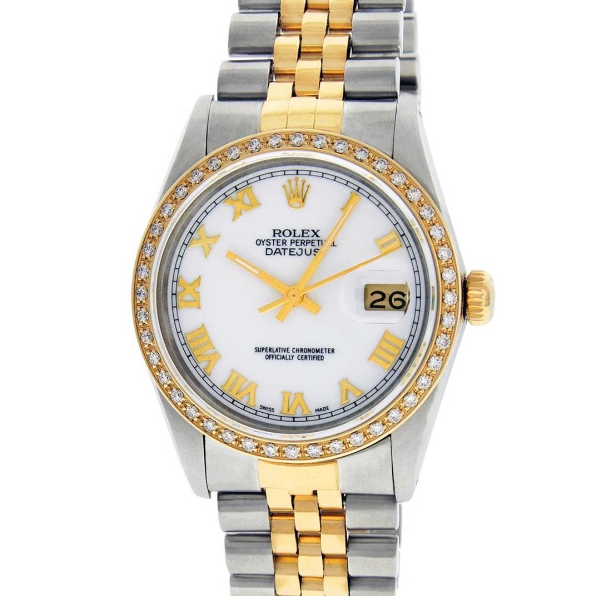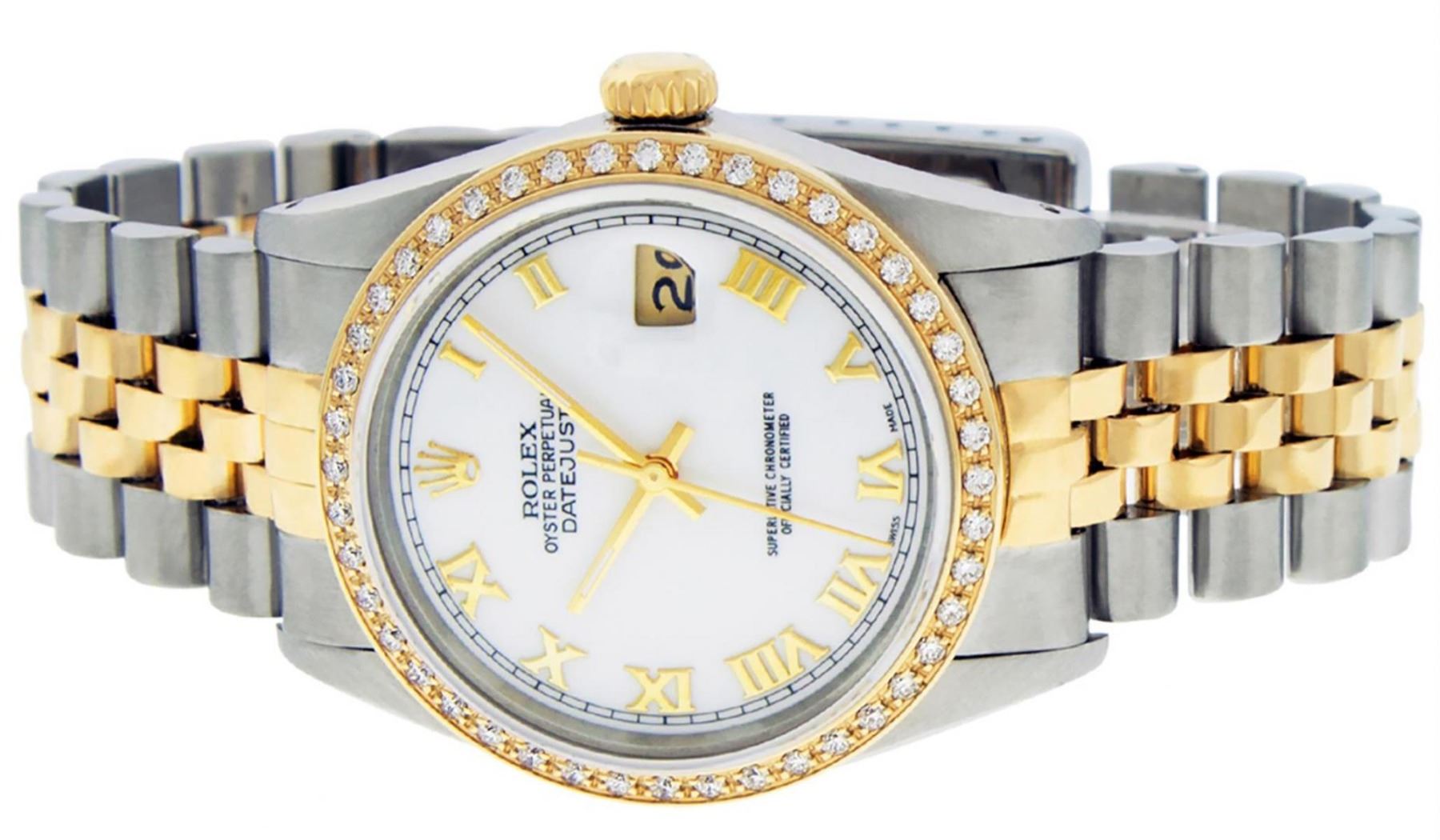 One Mens Pre Owned Yellow Gold and Stainless Steel Two Tone Rolex Datejust Polished, Serviced & Electronically Tested, Rolex Yellow Gold & Stainless Steel Case: 36mm, Rolex Yellow Gold Crown, Custom Bezel: New 18K Yellow Gold Beadset Diamond Bezel, Diamond Count: 44 Diamonds, Total Weight 1.00 Carat, Clarity: SI-VS, Color: G to H. Custom Crystal: New Sapphire With Magnified Lens. Custom Hands: New Luminecent Hands. Rolex Movement: Automatic Winding Movement. Custom Dial: Refinished White With Custom Diamonds. Date Window: 3 O'Clock Position Date Display, Quickset, Model: Condition: G-6 Extra Fine. Rolex Bracelet: Two Tone Yellow Gold & Stainless Steel Jubilee Band. Bright Polish. 7.0 Inch Length, Adjustable. Standard Clasp, With Rolex Logo. This Watch Has Been Serviced Time Tested And Is In Excellent Condition It Is Free Of All Scratches And Dents.
