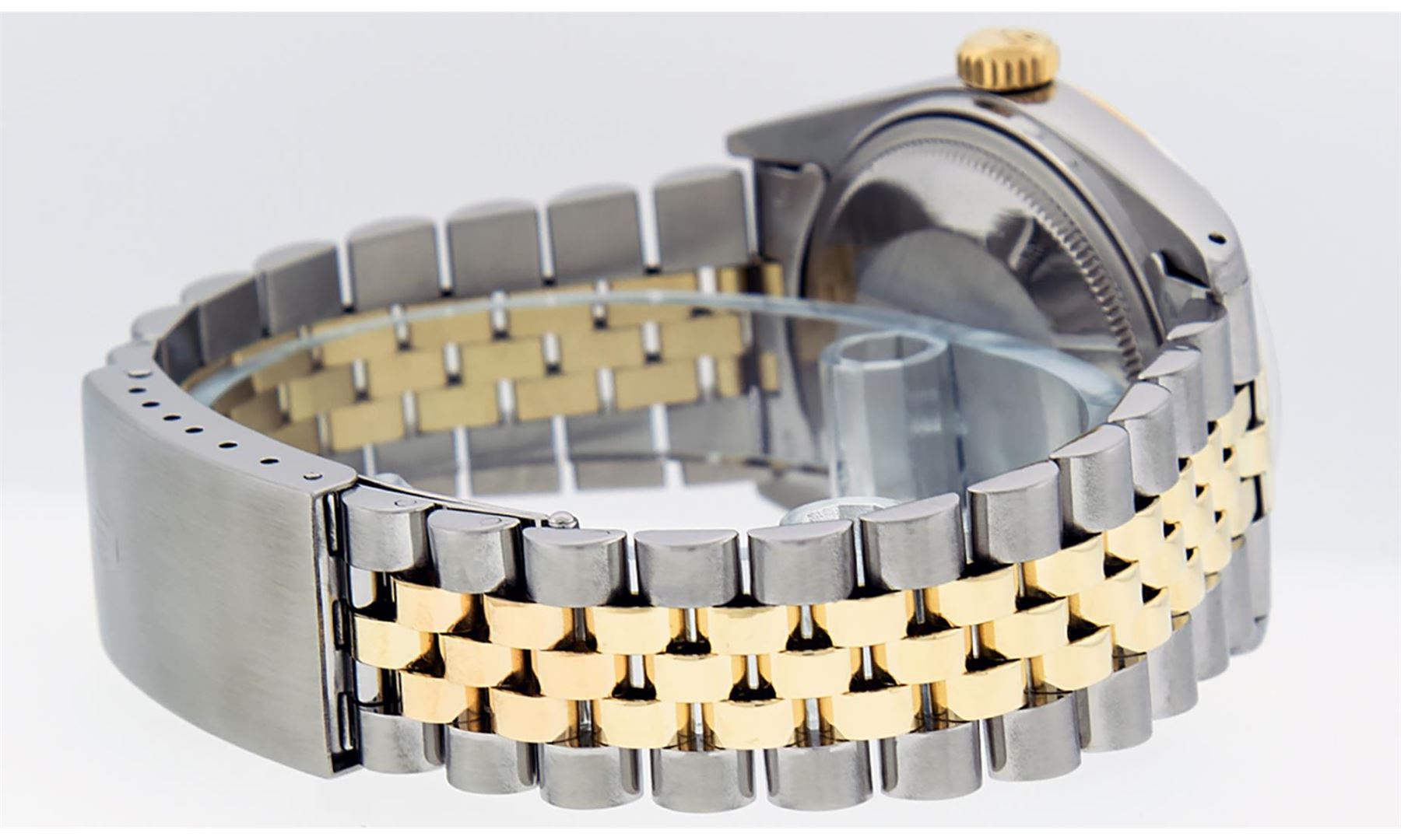 One Mens Pre Owned Yellow Gold Two Tone Rolex Datejust Polished, Serviced And Electronically Tested, Rolex Yellow Gold And Stainless Steel Case: 36mm, Rolex Yellow Gold Crown, Rolex Bezel: Yellow Gold Fluted Bezel. Custom Crystal: New Acrylic With Magnified Date Window. Custom Hands: New Luminescent Hands. Rolex Movement: Automatic Winding Movement 3035. Custom Dial: Custom White Roman Dial With Square Track. Date Window: 3 O'Clock Position Date Display, Quickset, Model: Quickset Datejust. Condition: G-6 Extra Fine. Rolex Bracelet: Two Tone Yellow Gold And Stainless Steel Jubilee Band. Bright Polish. 7.0 Inch Length, Adjustable. Standard Clasp, With Rolex Logo. This Watch Has Been Serviced Time Tested And Is In Excellent Condition It Is Free Of All Scratches And Dents.