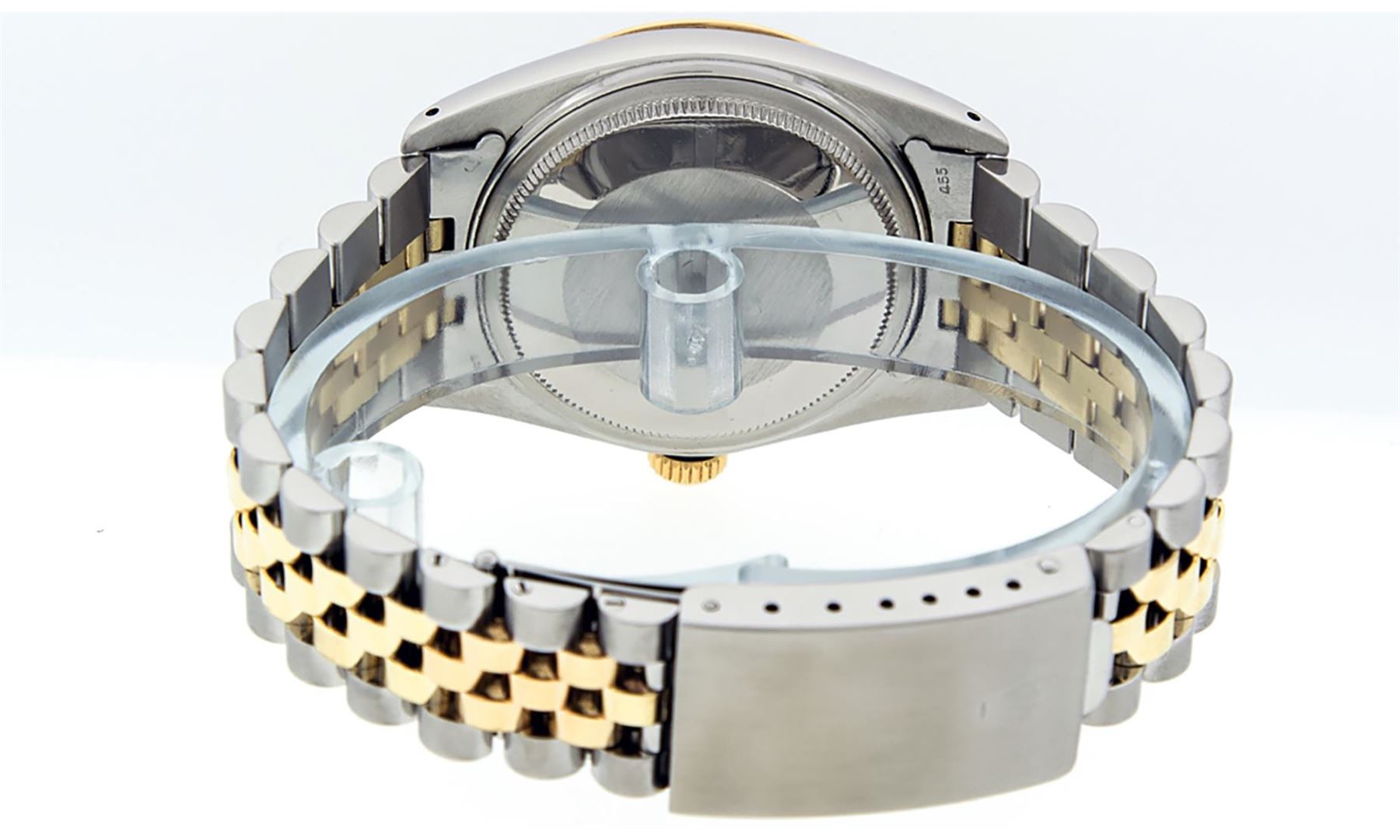 One Mens Pre Owned Yellow Gold Two Tone Rolex Datejust Polished, Serviced And Electronically Tested, Rolex Yellow Gold And Stainless Steel Case: 36mm, Rolex Yellow Gold Crown, Rolex Bezel: Yellow Gold Fluted Bezel. Custom Crystal: New Acrylic With Magnified Date Window. Custom Hands: New Luminescent Hands. Rolex Movement: Automatic Winding Movement 3035. Custom Dial: Custom White Roman Dial With Square Track. Date Window: 3 O'Clock Position Date Display, Quickset, Model: Quickset Datejust. Condition: G-6 Extra Fine. Rolex Bracelet: Two Tone Yellow Gold And Stainless Steel Jubilee Band. Bright Polish. 7.0 Inch Length, Adjustable. Standard Clasp, With Rolex Logo. This Watch Has Been Serviced Time Tested And Is In Excellent Condition It Is Free Of All Scratches And Dents.