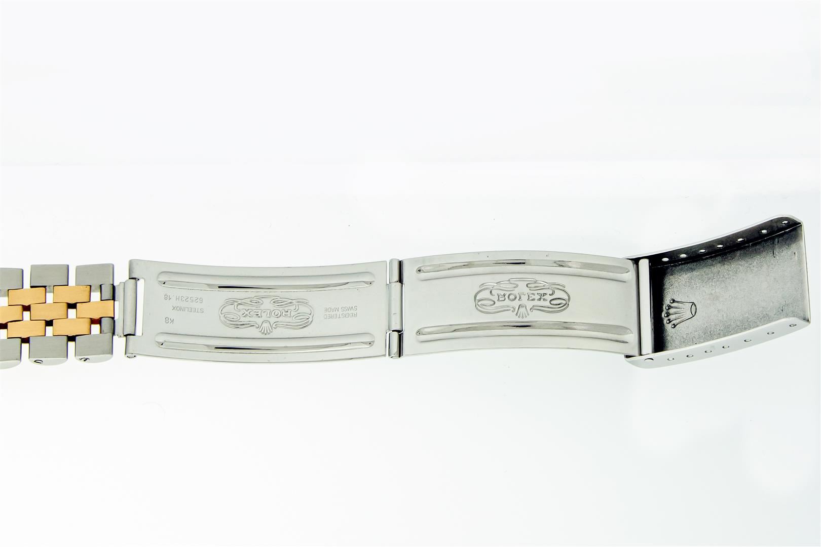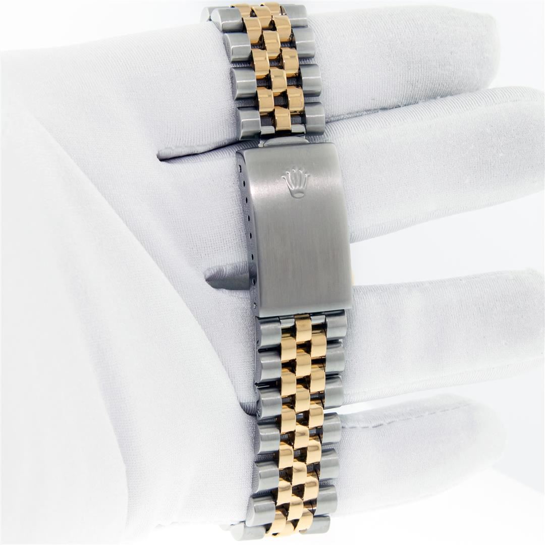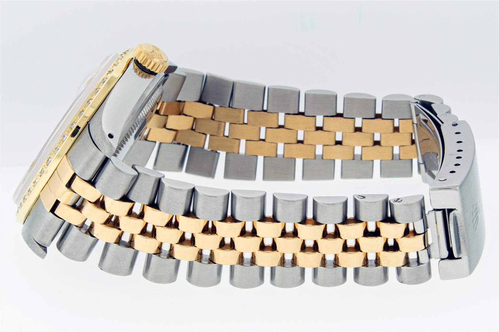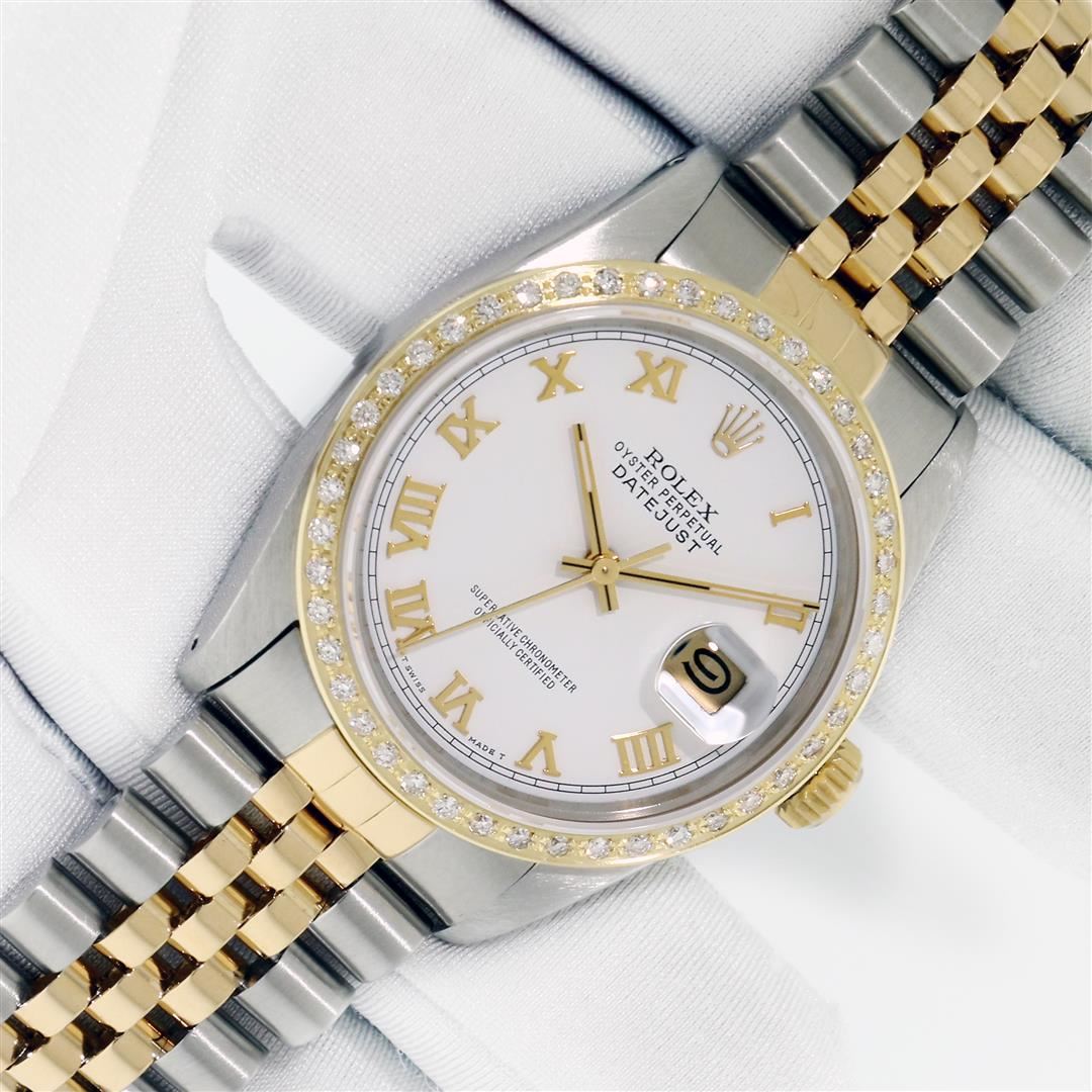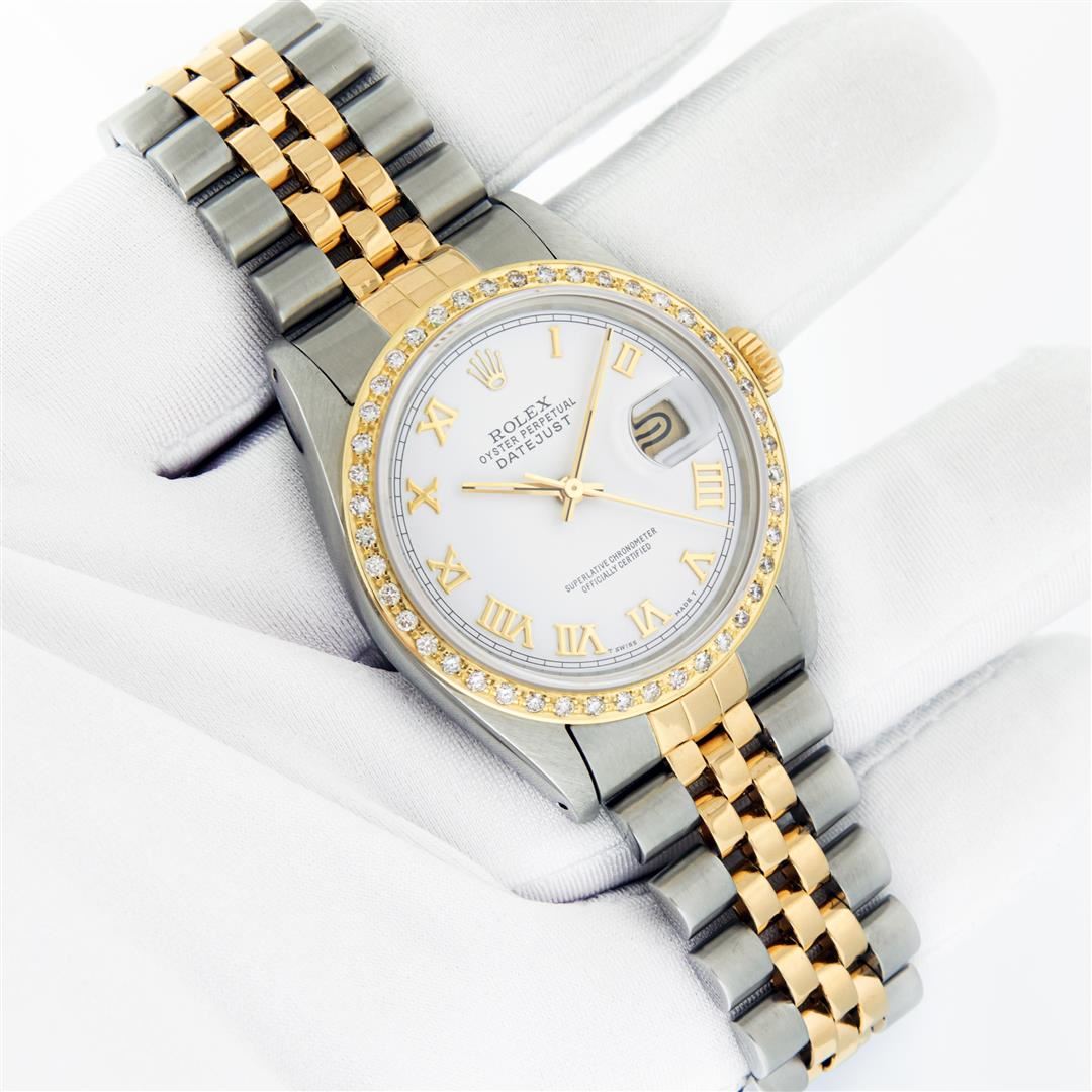 One Mens Pre Owned Yellow Gold and Stainless Steel Two Tone Rolex Datejust Polished, Serviced & Electronically Tested, Rolex Yellow Gold & Stainless Steel Case: 36mm, Rolex Yellow Gold Crown, Custom Bezel: New 18K Yellow Gold Bead-set Diamond Bezel, Diamond Count: 44 Diamonds, Total Weight 1.00 Carat, Clarity: SI-VS, Color: G to H. Custom Crystal: New Sapphire With Magnified Date Window. Custom Hands: New Luminecent Hands. Rolex Movement: Automatic Winding Movement. Rolex Dial: White Roman Dial With Square Track. Date Window: 3 O'Clock Position Date Display, Quickset, Model: Condition: G-6 Extra Fine. Rolex Bracelet: Two Tone Yellow Gold & Stainless Steel Jubilee Band. Bright Polish. 7.0 Inch Length, Adjustable. Standard Clasp, With Rolex Logo. This Watch Has Been Serviced Time Tested And Is In Excellent Condition It Is Free Of All Scratches And Dents. This Watch Comes With A Rolex Box.