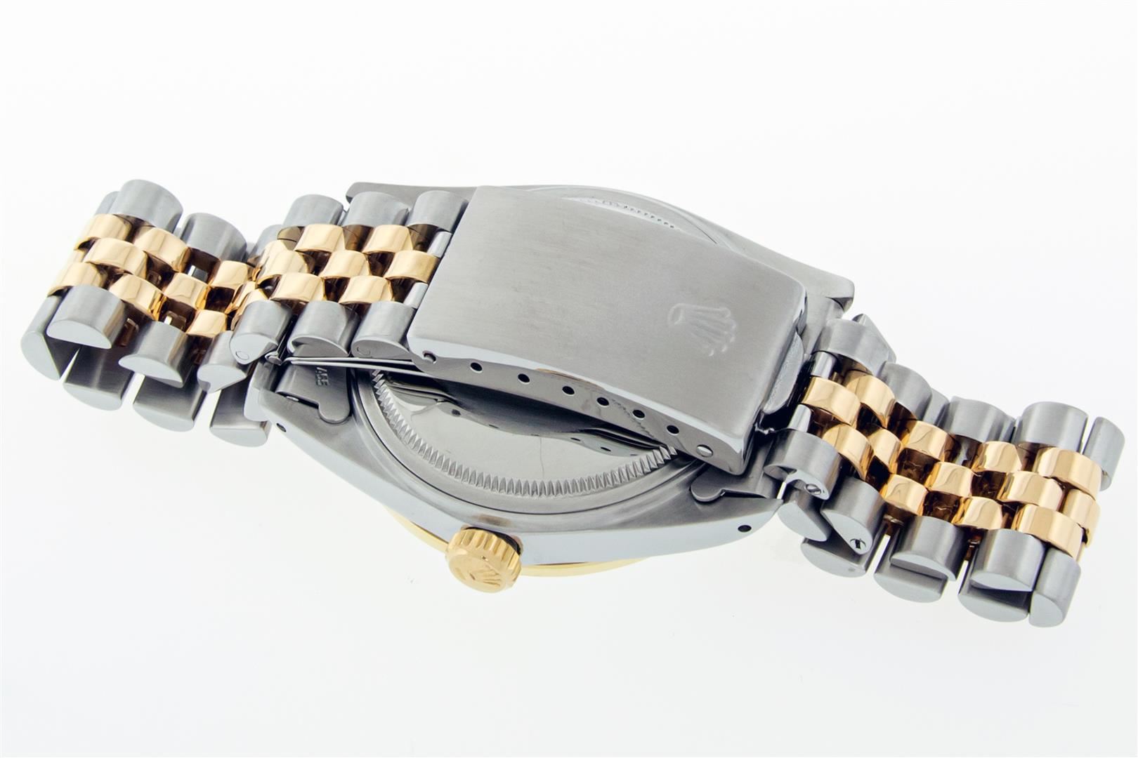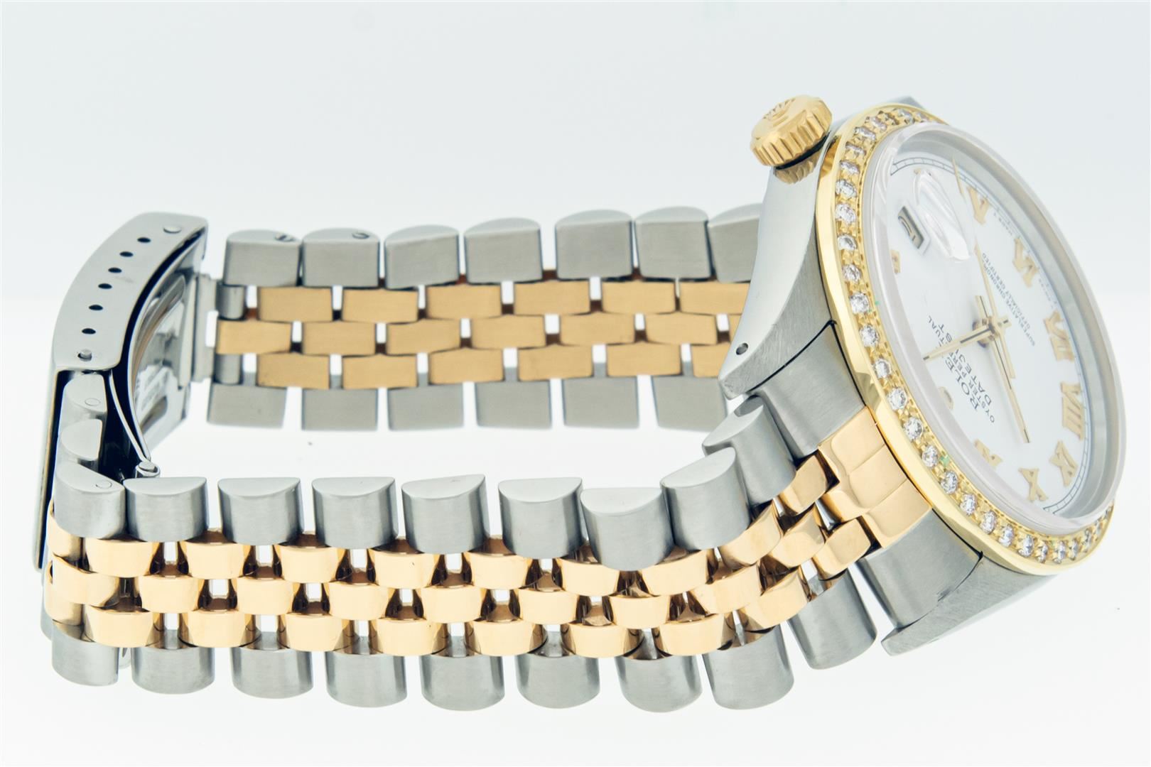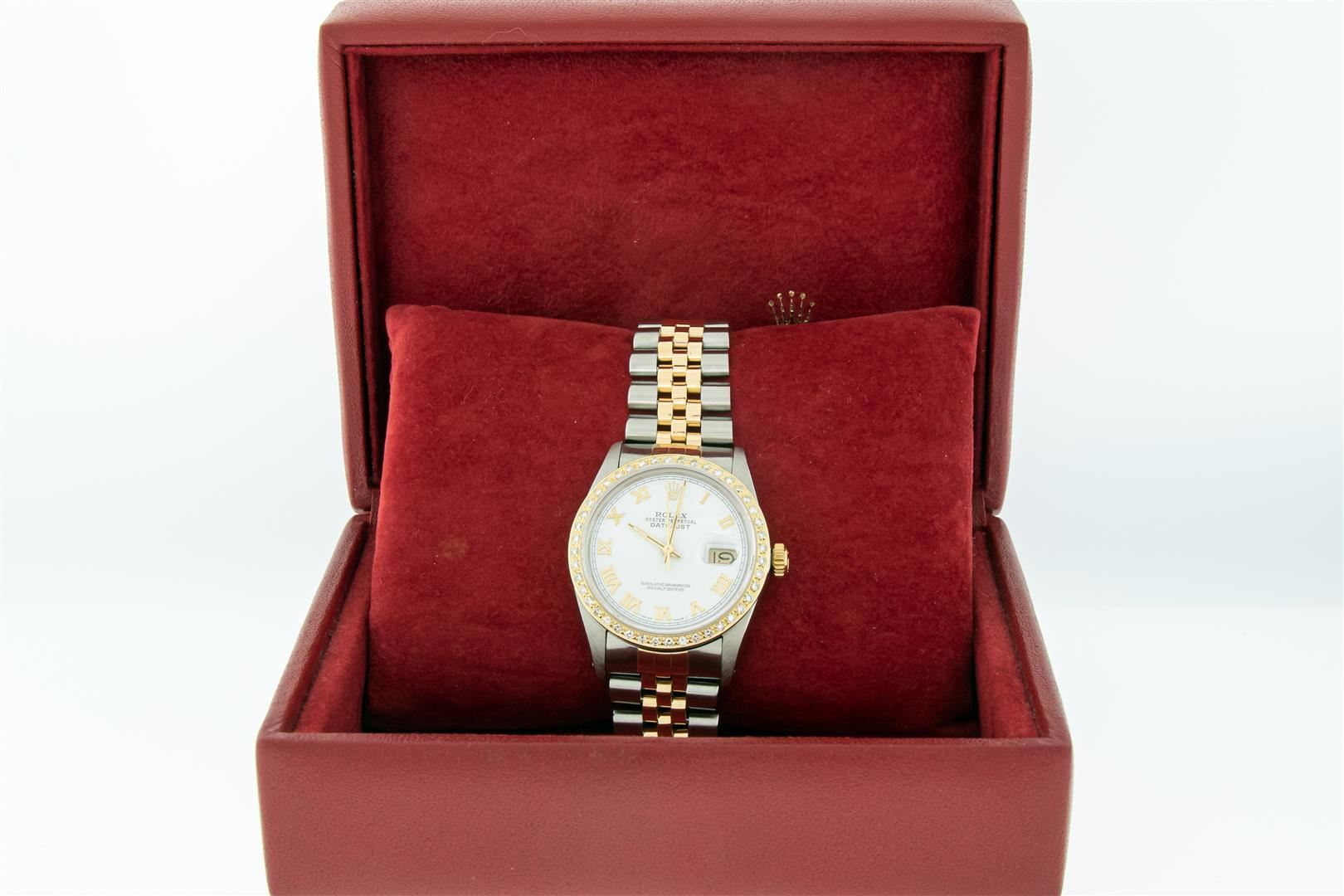 One Mens Pre Owned Yellow Gold and Stainless Steel Two Tone Rolex Datejust Polished, Serviced & Electronically Tested, Rolex Yellow Gold & Stainless Steel Case: 36mm, Rolex Yellow Gold Crown, Custom Bezel: New 18K Yellow Gold Bead-set Diamond Bezel, Diamond Count: 44 Diamonds, Total Weight 1.00 Carat, Clarity: SI-VS, Color: G to H. Custom Crystal: New Sapphire With Magnified Date Window. Custom Hands: New Luminecent Hands. Rolex Movement: Automatic Winding Movement. Rolex Dial: White Roman Dial With Square Track. Date Window: 3 O'Clock Position Date Display, Quickset, Model: Condition: G-6 Extra Fine. Rolex Bracelet: Two Tone Yellow Gold & Stainless Steel Jubilee Band. Bright Polish. 7.0 Inch Length, Adjustable. Standard Clasp, With Rolex Logo. This Watch Has Been Serviced Time Tested And Is In Excellent Condition It Is Free Of All Scratches And Dents. This Watch Comes With A Rolex Box.