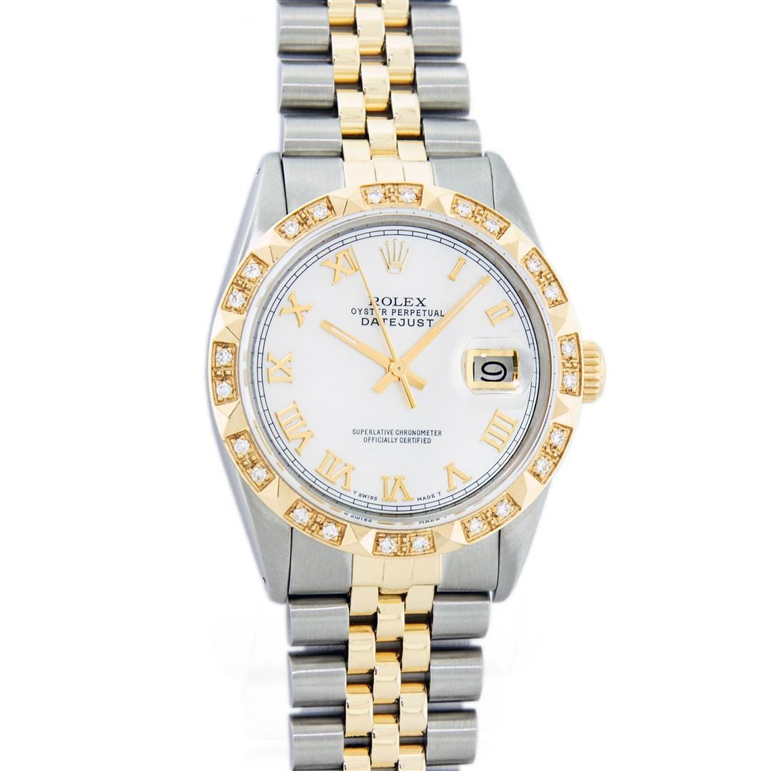 One Mens Rolex Pre Owned Yellow Gold And Stainless Steel Datejust Polished Bright with Satin Finish, Serviced & Electronically Tested, Rolex Stainless Steel Case: 36mm, Rolex Yellow Gold Crown, Custom Bezel: New 18K Yellow Gold Pyramid Diamond Bezel, Diamond Count: 24 Diamonds, Clarity: SI-VS, Color: G to H. Custom Crystal: New Sapphire With Magnified Date. Custom Hands: New Luminescent Hands. Rolex Movement: Automatic Winding Movement 3035. Rolex Dial: White Dial With Roman Hour Markers And Square Track. Date Window: 3 O'Clock Position Date Display, Quickset, Model: Datejust. Condition: G-6 Extra Fine. Rolex Bracelet: 14K Yellow Gold And Stainless Steel Jubilee Band. Bright Polish & Satin Finish. 7.0 Inch Length, Adjustable. Standard Clasp, With Rolex Logo. This Watch Has Been Serviced And Polished It Is Free Of All Scratches And Dents.