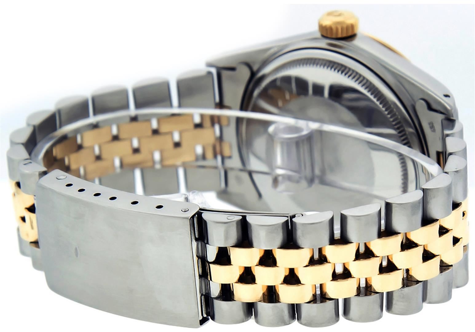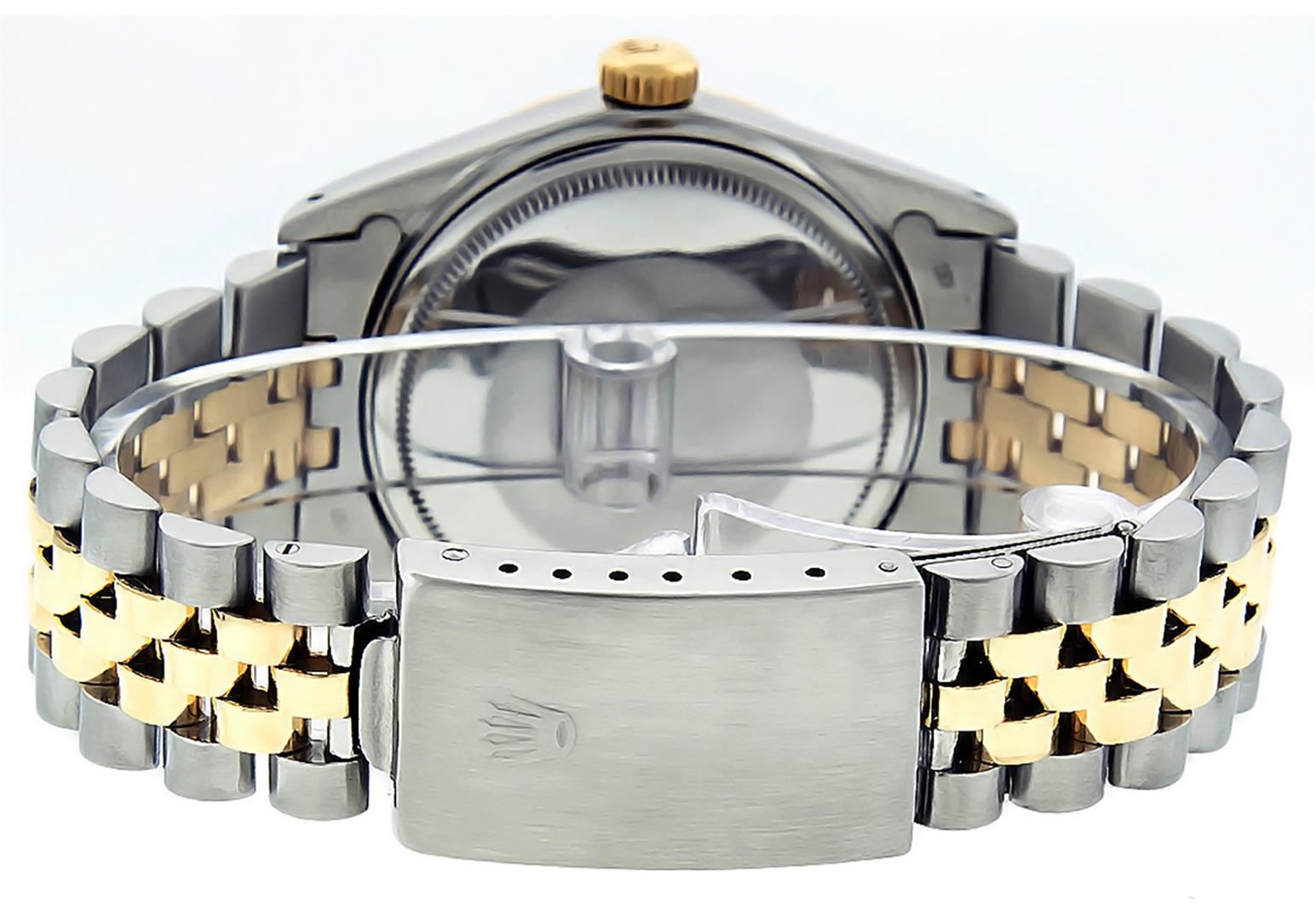 One Mens Rolex Pre Owned 14K Two Tone Yellow Gold And Stainless Steel Datejust Polished, Serviced & Electronically Tested, Rolex Yellow Gold & Stainless Steel Case: 36mm, Rolex Yellow Gold Crown, Rolex Bezel: 14K Yellow Gold Fluted Bezel. Custom Crystal: New Acrylic With Magnified Date Window. Custom Hands: New Luminescent Hands. Rolex Movement: Automatic Winding Movement 3035. Rolex Dial: Champagne Tapestry Index Dial With Roman Square Track. Date Window: 3 O'Clock Position Date Display, Quickset, Model: Datejust. Condition: G-6 Extra Fine. Rolex Bracelet: Two Tone 14K Yellow Gold & Stainless Steel Jubilee Band. Bright Polish. 7.0 Inch Length, Adjustable. Standard Clasp, With Rolex Logo. This Watch Has Been Serviced Time Tested And Is In Excellent Condition It Is Free Of All Scratches And Dents.
