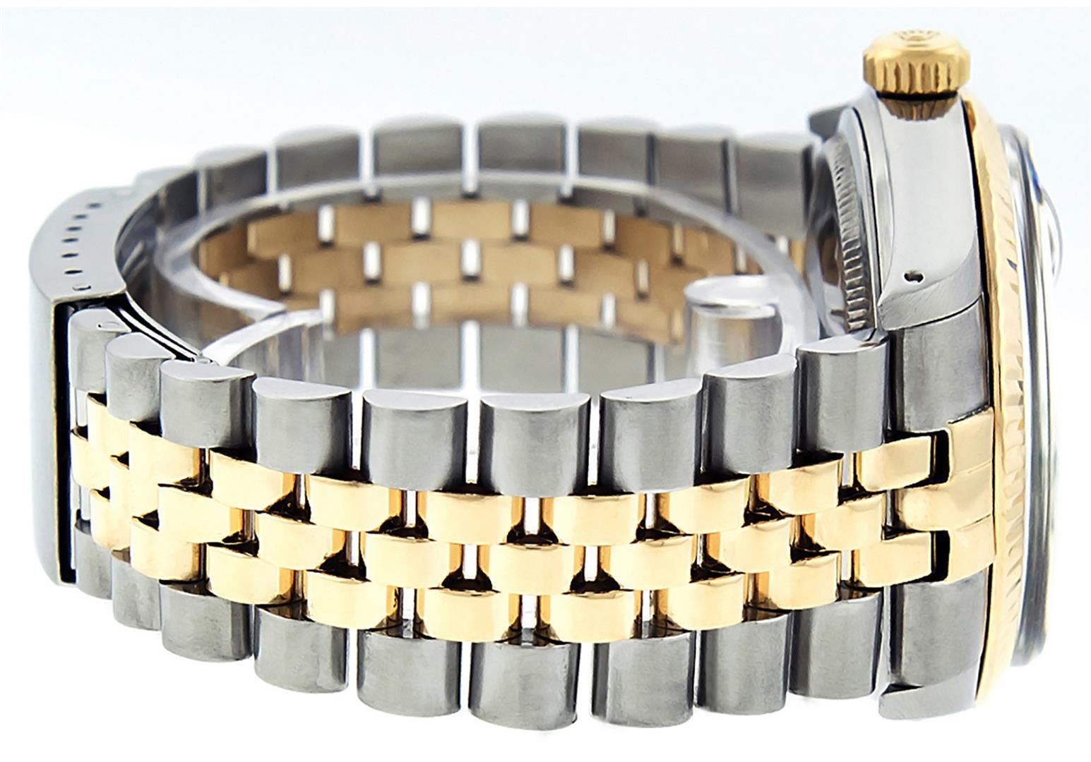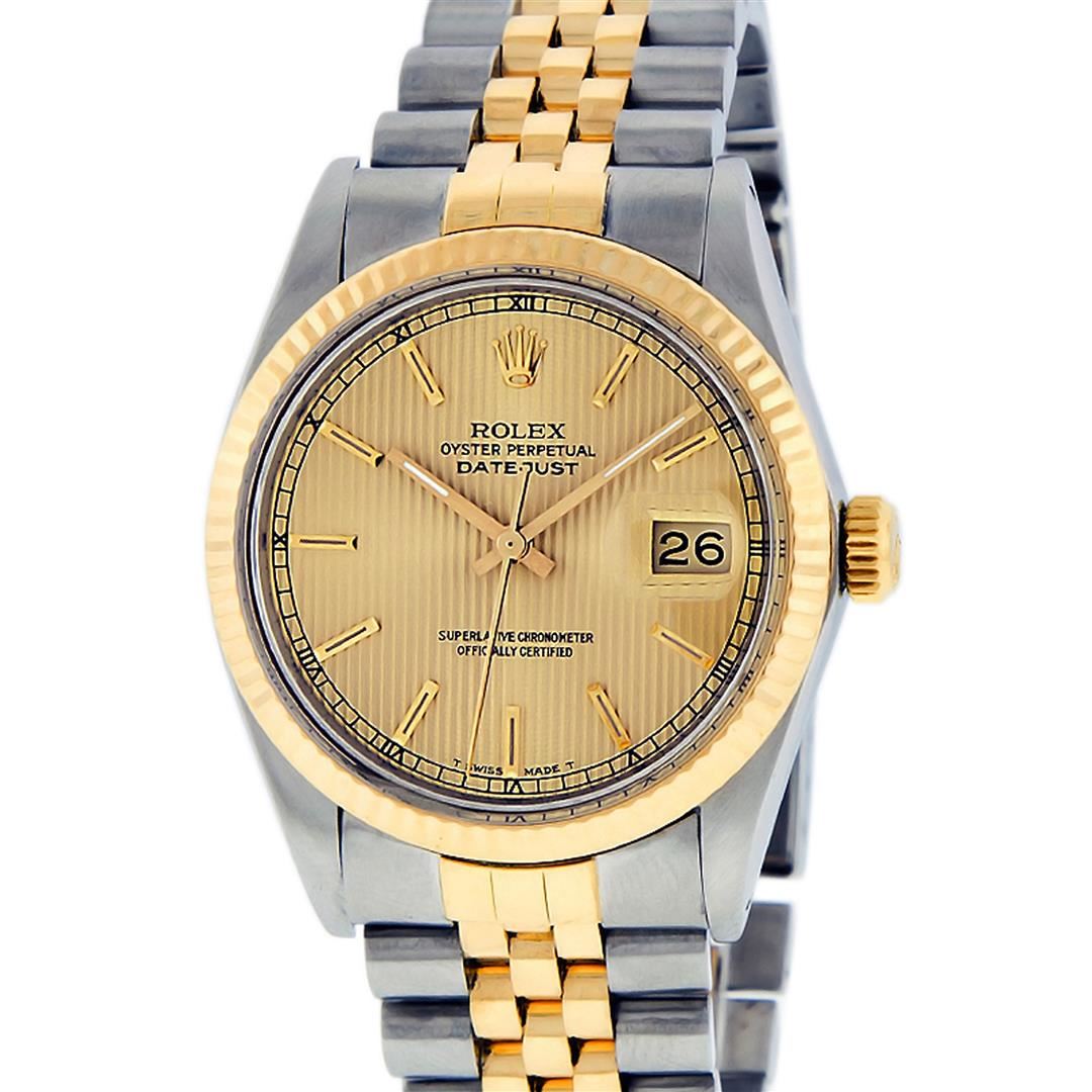 One Mens Rolex Pre Owned 14K Two Tone Yellow Gold And Stainless Steel Datejust Polished, Serviced & Electronically Tested, Rolex Yellow Gold & Stainless Steel Case: 36mm, Rolex Yellow Gold Crown, Rolex Bezel: 14K Yellow Gold Fluted Bezel. Custom Crystal: New Acrylic With Magnified Date Window. Custom Hands: New Luminescent Hands. Rolex Movement: Automatic Winding Movement 3035. Rolex Dial: Champagne Tapestry Index Dial With Roman Square Track. Date Window: 3 O'Clock Position Date Display, Quickset, Model: Datejust. Condition: G-6 Extra Fine. Rolex Bracelet: Two Tone 14K Yellow Gold & Stainless Steel Jubilee Band. Bright Polish. 7.0 Inch Length, Adjustable. Standard Clasp, With Rolex Logo. This Watch Has Been Serviced Time Tested And Is In Excellent Condition It Is Free Of All Scratches And Dents.
