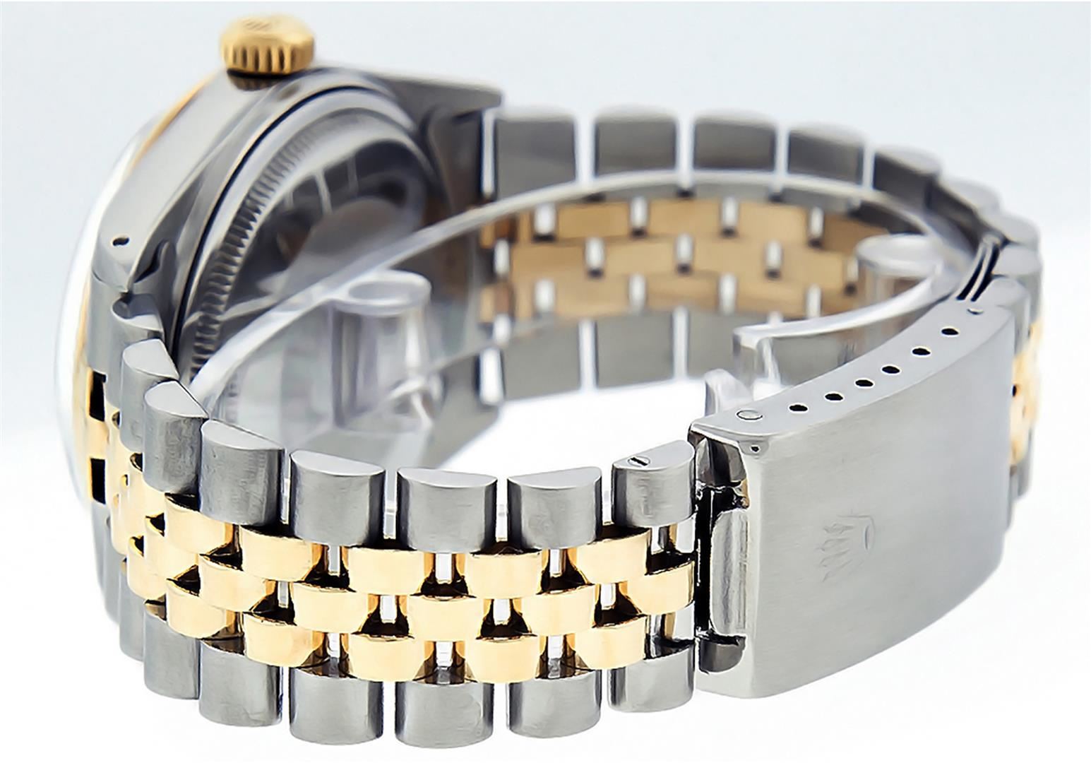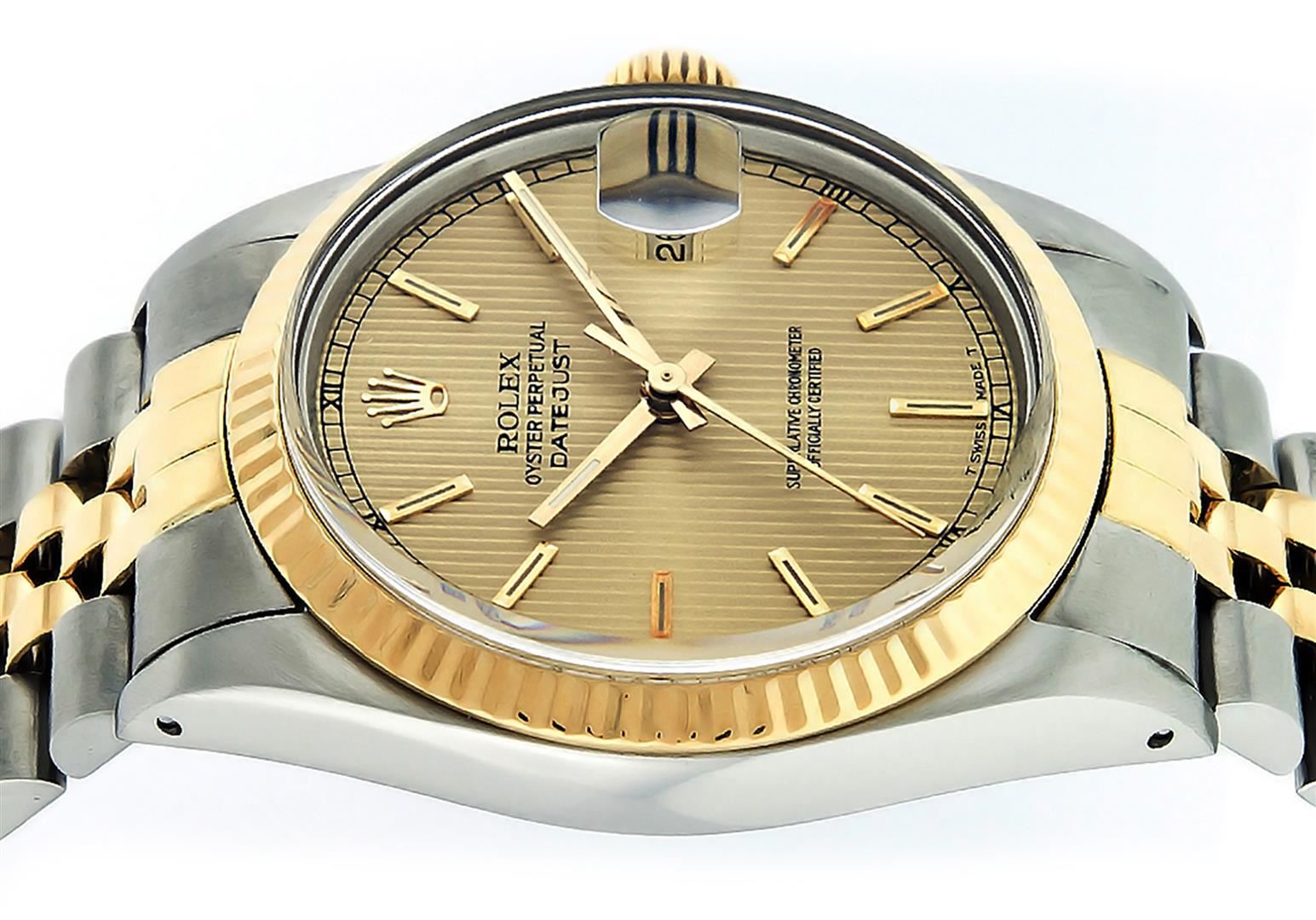 One Mens Rolex Pre Owned 14K Two Tone Yellow Gold And Stainless Steel Datejust Polished, Serviced & Electronically Tested, Rolex Yellow Gold & Stainless Steel Case: 36mm, Rolex Yellow Gold Crown, Rolex Bezel: 14K Yellow Gold Fluted Bezel. Custom Crystal: New Acrylic With Magnified Date Window. Custom Hands: New Luminescent Hands. Rolex Movement: Automatic Winding Movement 3035. Rolex Dial: Champagne Tapestry Index Dial With Roman Square Track. Date Window: 3 O'Clock Position Date Display, Quickset, Model: Datejust. Condition: G-6 Extra Fine. Rolex Bracelet: Two Tone 14K Yellow Gold & Stainless Steel Jubilee Band. Bright Polish. 7.0 Inch Length, Adjustable. Standard Clasp, With Rolex Logo. This Watch Has Been Serviced Time Tested And Is In Excellent Condition It Is Free Of All Scratches And Dents.