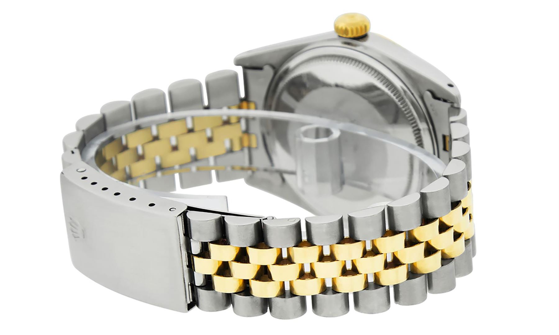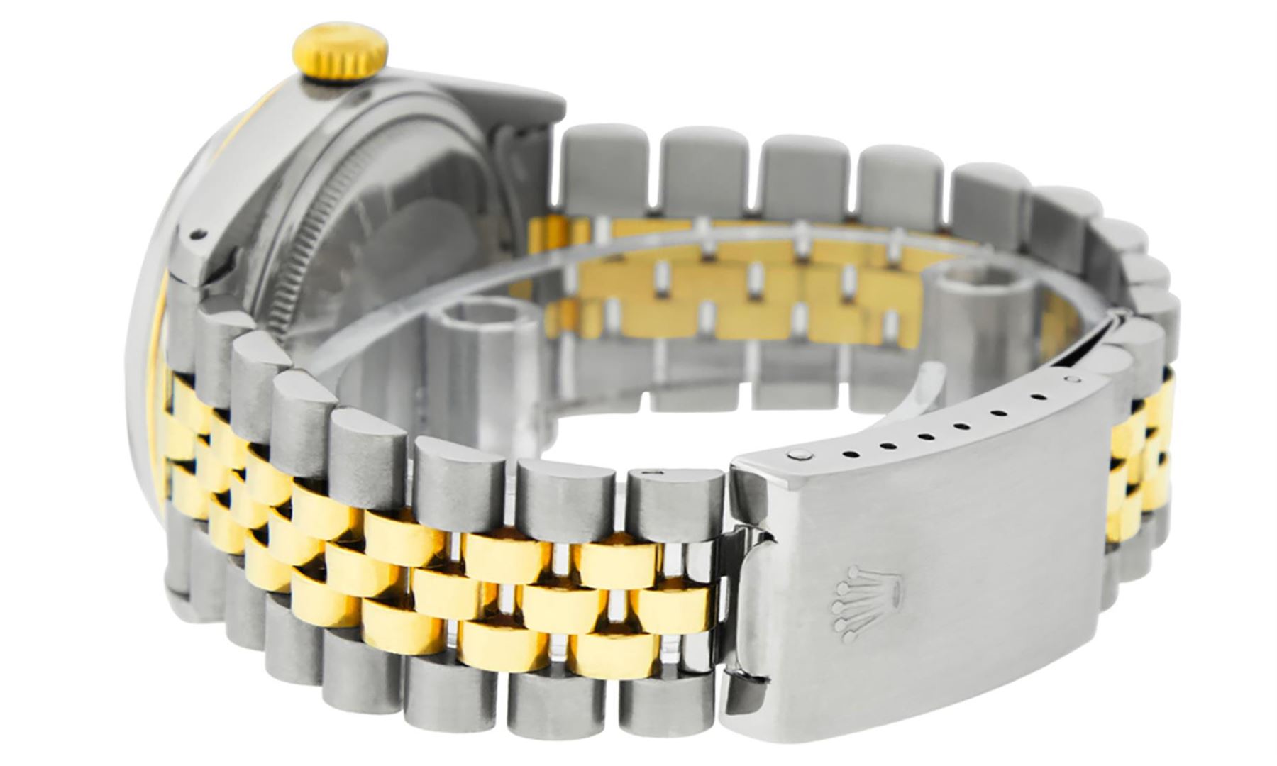 One Mens Pre Owned Yellow Gold Two Tone Rolex Datejust Polished, Serviced & Electronically Tested, Rolex Yellow Gold & Stainless Steel Case: 36mm, Rolex Yellow Gold Crown, Rolex Bezel: Yellow Gold Fluted Bezel. Custom Crystal: New Acrylic Cyclops Lens. Custom Hands: New Luminescent Hands. Rolex Movement: Automatic Winding Movement. Custom Dial: Mother Of Pearl Diamond Dial, Stone Count: 8 Diamonds + 2 Baguette Diamonds in Dial, G To H In Color, SI-VS Clarity. Date Window: 3 O'Clock Position Date Display, Quickset, Model: Datejust. Condition: G-6 Extra Fine. Rolex Bracelet: Two Tone Yellow Gold & Stainless Steel Jubilee Band. Bright Polish. 7.0 Inch Length, Adjustable. Standard Clasp, With Rolex Logo. This Watch Has Been Serviced And Polished It Is Free Of All Scratches And Dents.