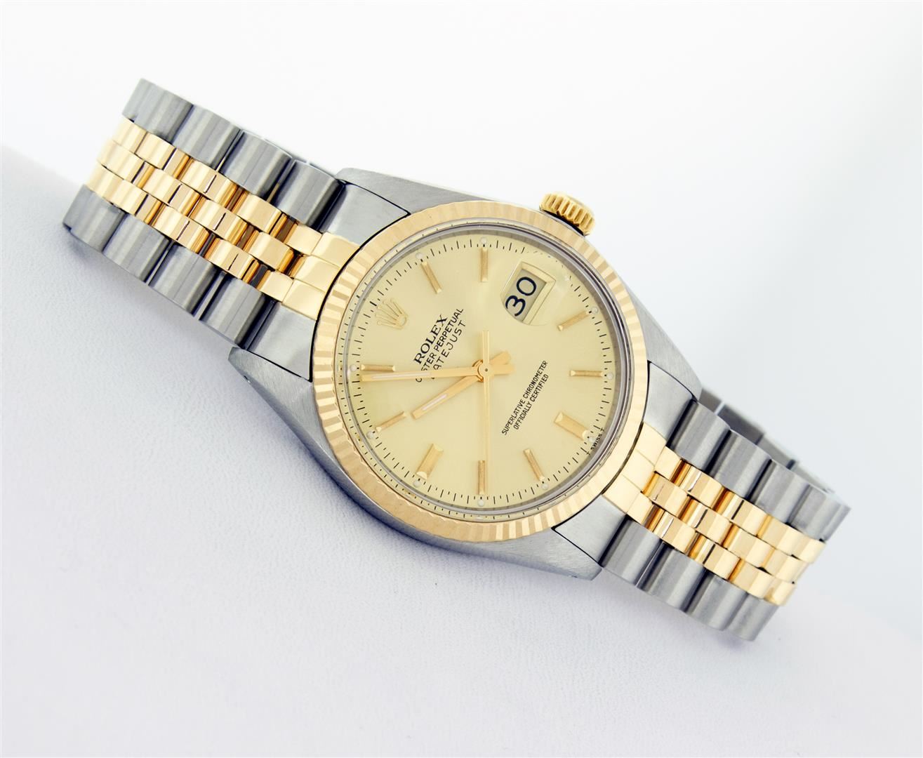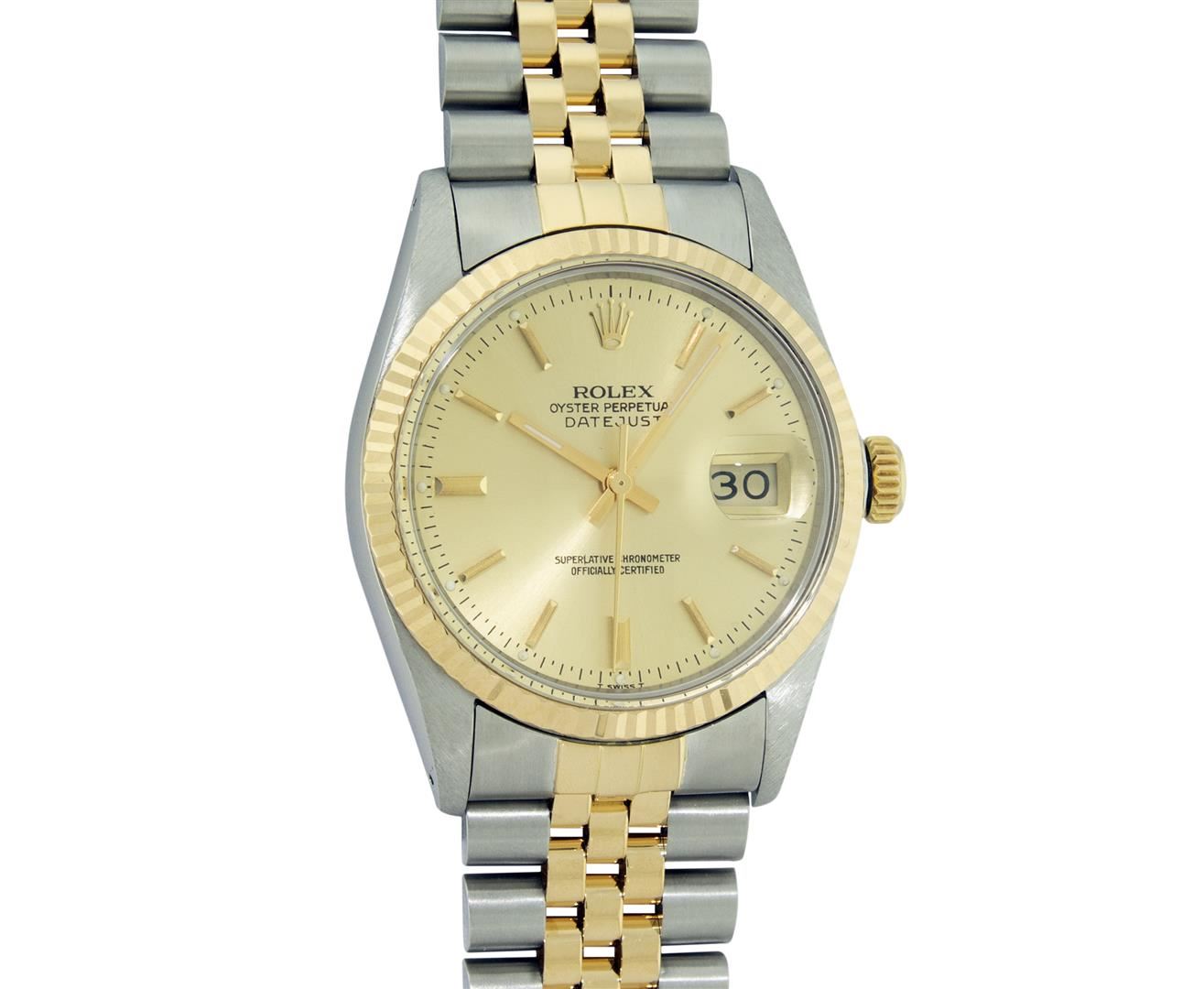 One Mens Rolex Pre Owned 14K Two Tone Yellow Gold And Stainless Steel Datejust Polished, Serviced & Electronically Tested, Yellow Gold & Stainless Steel Case: 36mm, Yellow Gold Crown, Rolex Bezel: 14K Yellow Gold Fluted Bezel. Custom Crystal: New Acrylic With Magnified Date Window. Custom Hands: New Luminescent Hands. Rolex Movement: Automatic Winding Movement 3035. Rolex Dial: Champagne Index Dial With Dash Track & Lumi Dots. Date Window: 3 O'Clock Position Date Display, Quickset, Model: Datejust. Condition: G-6 Extra Fine. Rolex Bracelet: Two Tone 14K Yellow Gold And Stainless Steel Jubilee Band. Bright Polish. 7.0 Inch Length, Adjustable. Standard Clasp, With Rolex Logo. This Watch Has Been Serviced Time Tested And Is In Excellent Condition It Is Free Of All Scratches And Dents.