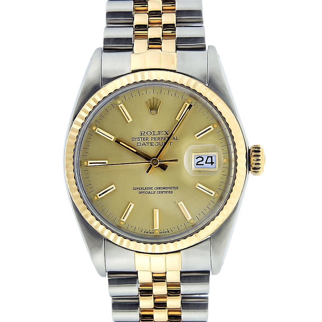 One Mens Rolex Pre Owned 14K Two Tone Yellow Gold And Stainless Steel Datejust Polished, Serviced & Electronically Tested, Yellow Gold & Stainless Steel Case: 36mm, Yellow Gold Crown, Rolex Bezel: 14K Yellow Gold Fluted Bezel. Custom Crystal: New Acrylic With Magnified Date Window. Hands: Luminescent Hands. Rolex Movement: Automatic Winding Movement 3035. Rolex Dial: Champagne Index Dial With Dash Track & Lumi Dots. Date Window: 3 O'Clock Position Date Display, Quickset, Model: Datejust. Condition: G-6 Extra Fine. Rolex Bracelet: Two Tone 14K Yellow Gold And Stainless Steel Jubilee Band. Bright Polish. 7.0 Inch Length, Adjustable. Standard Clasp, With Rolex Logo. This Watch Has Been Serviced Time Tested And Is In Excellent Condition It Is Free Of All Scratches And Dents.