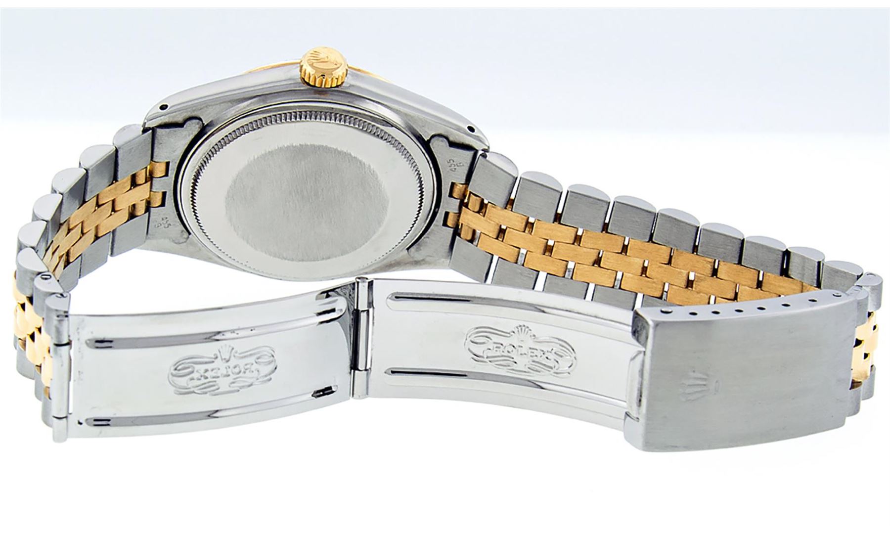 One Mens Rolex Pre Owned 14K Two Tone Yellow Gold And Stainless Steel Datejust Polished, Serviced & Electronically Tested, Yellow Gold & Stainless Steel Case: 36mm, Yellow Gold Crown, Rolex Bezel: 14K Yellow Gold Fluted Bezel. Custom Crystal: New Acrylic With Magnified Date Window. Hands: Luminescent Hands. Rolex Movement: Automatic Winding Movement 3035. Rolex Dial: Champagne Index Dial With Dash Track & Lumi Dots. Date Window: 3 O'Clock Position Date Display, Quickset, Model: Datejust. Condition: G-6 Extra Fine. Rolex Bracelet: Two Tone 14K Yellow Gold And Stainless Steel Jubilee Band. Bright Polish. 7.0 Inch Length, Adjustable. Standard Clasp, With Rolex Logo. This Watch Has Been Serviced Time Tested And Is In Excellent Condition It Is Free Of All Scratches And Dents.