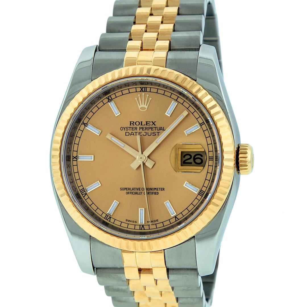 One Mens Rolex Two Tone 18K Yellow Gold And Stainless Steel Datejust, Polished Bright with Satin Finish, Serviced & Electronically Tested, Stainless Steel Case: 36mm, Rolex Yellow Gold Crown, Rolex Bezel: 18K Yellow Gold Fluted Bezel. Crystal: Sapphire With Cyclops Lens. Rolex Movement: Automatic Winding Movement Caliber 3135. Rolex Dial: Champagne Index With Square Roman Track. Date Window: 3 O'Clock Position Date Display, Quickset, Model: Quickset Datejust 116233. Condition: G-6 Extra Fine. Rolex Bracelet: 18K Yellow Gold And Stainless Steel Jubilee Band. Bright Polish & Satin Finish. 7.0 Inch Length, Adjustable. Standard Clasp, With Rolex Logo. This Pre Owned Watch Has Been Serviced Time Tested And Is In Excellent Condition It Is Free Of All Scratches And Dents.