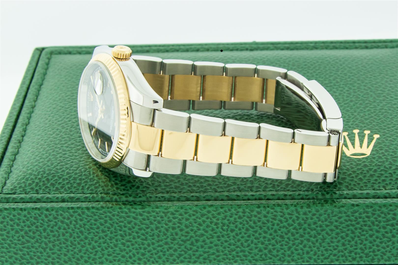 One Mens Pre Owned 18K Yellow Gold and Stainless Steel Two Tone Rolex Datejust Polished, Serviced & Electronically Tested, Rolex Yellow Gold & Stainless Steel Case: 36mm, Rolex Yellow Gold Crown, Rolex Bezel: Rolex 18K Yellow Gold Fluted Bezel. Crystal: Sapphire With Cyclops Lens. Hands: Lumi Hands. Rolex Dial: Black Dial With Square Roman Track, Date Window: 3 O'Clock Position Date Display, Quickset, Model: Quickset Datejust 116233. Condition: G-6 Extra Fine. Rolex Bracelet: 18K Yellow Gold and Stainless Steel Oyster Band. Bright Polish & Satin Finish. 7.0 Inch Length, Adjustable. Standard Clasp, With Rolex Logo. This Watch Comes With A Rolex Box.