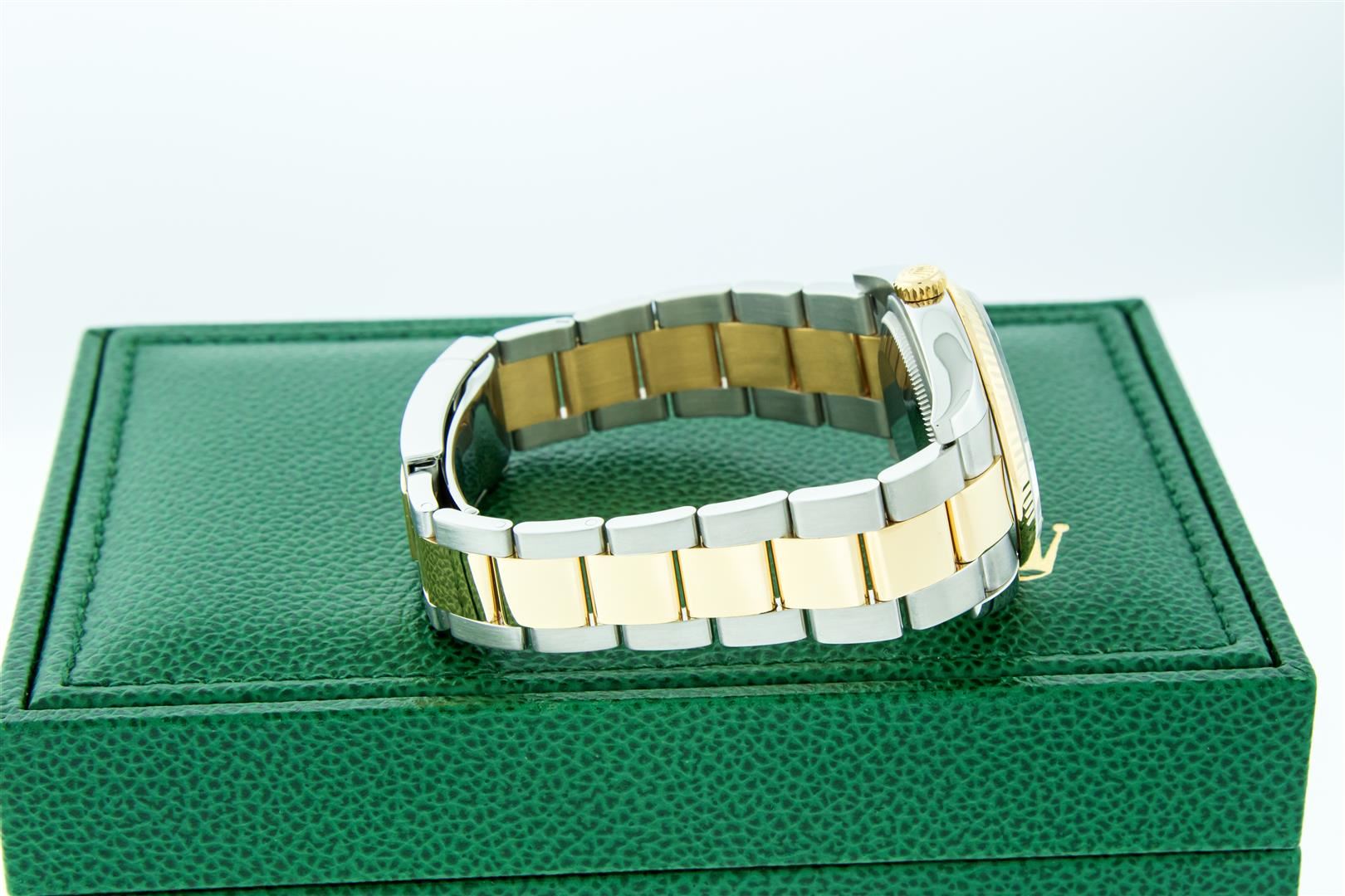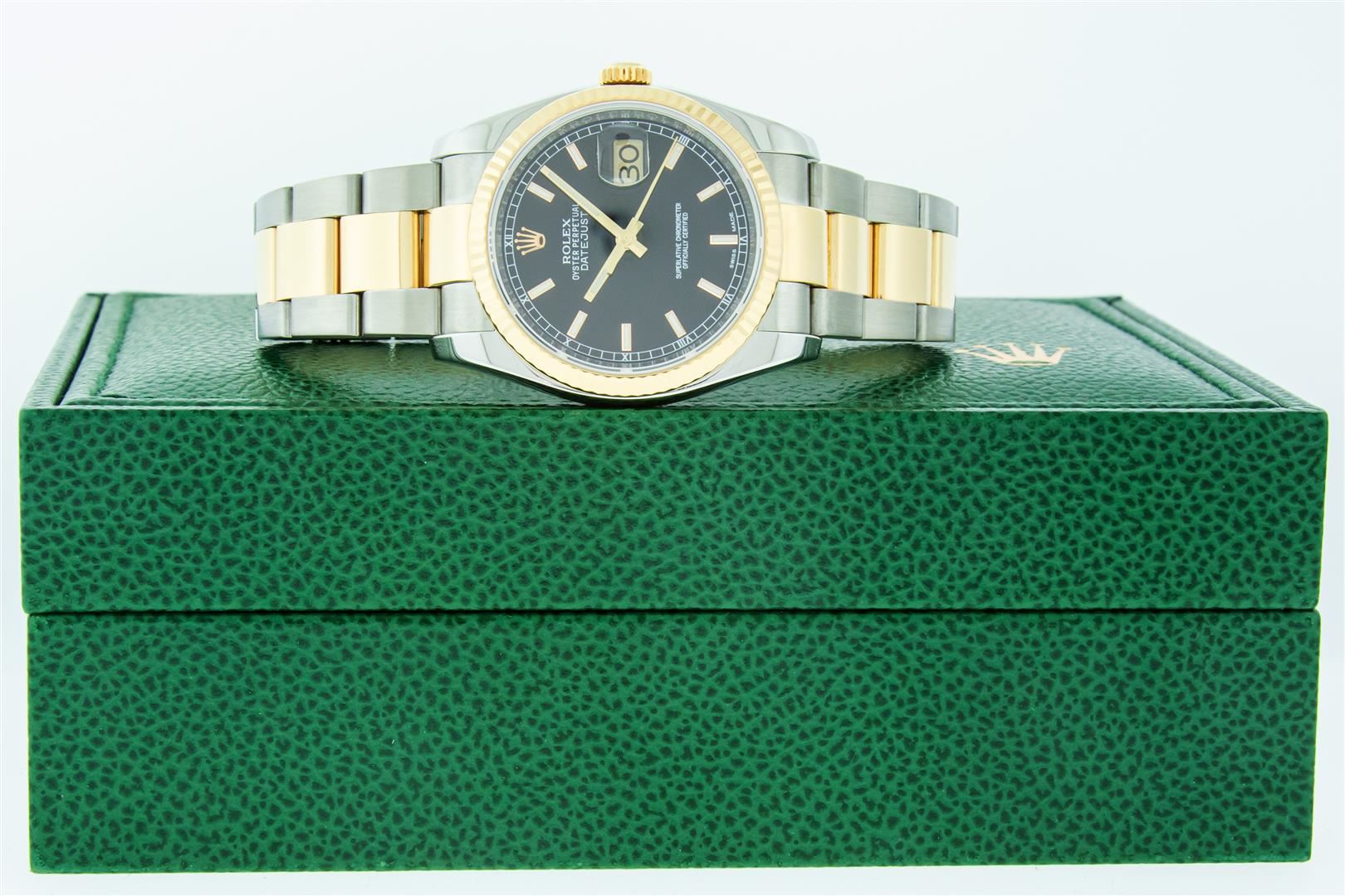 One Mens Pre Owned 18K Yellow Gold and Stainless Steel Two Tone Rolex Datejust Polished, Serviced & Electronically Tested, Rolex Yellow Gold & Stainless Steel Case: 36mm, Rolex Yellow Gold Crown, Rolex Bezel: Rolex 18K Yellow Gold Fluted Bezel. Crystal: Sapphire With Cyclops Lens. Hands: Lumi Hands. Rolex Dial: Black Dial With Square Roman Track, Date Window: 3 O'Clock Position Date Display, Quickset, Model: Quickset Datejust 116233. Condition: G-6 Extra Fine. Rolex Bracelet: 18K Yellow Gold and Stainless Steel Oyster Band. Bright Polish & Satin Finish. 7.0 Inch Length, Adjustable. Standard Clasp, With Rolex Logo. This Watch Comes With A Rolex Box.