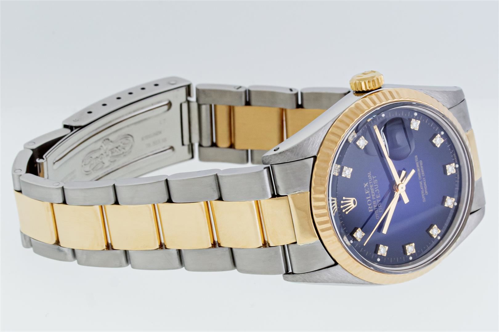 One Mens Pre Owned Yellow Gold And Stainless Steel Two Tone Rolex Datejust Polished, Serviced & Electronically Tested, Rolex Yellow Gold & Stainless Steel Case: 36mm, Rolex Yellow Gold Crown, Rolex Bezel: Yellow Gold Fluted Bezel. Custom Crystal: New Plastic With Magnified Date Window. Custom Hands: New Solid Hands. Rolex Movement: Automatic Winding Movement 3035. Custom Dial: Custom Blue Vignette Dial With Aftermarket Added Diamonds, Diamond Count: 10 Diamonds On Dial, Color: G to H. Date Window: 3 O'Clock Position Date Display, Quickset, Model: Datejust. Condition: G-6 Extra Fine. Rolex Bracelet: Two Tone Yellow Gold & Stainless Steel Oyster Band. Bright Polish. 7.0 Inch Length, Adjustable. Standard Clasp, With Rolex Logo. This Watch Has Been Serviced Time Tested And Is In Excellent Condition It Is Free Of All Scratches And Dents.