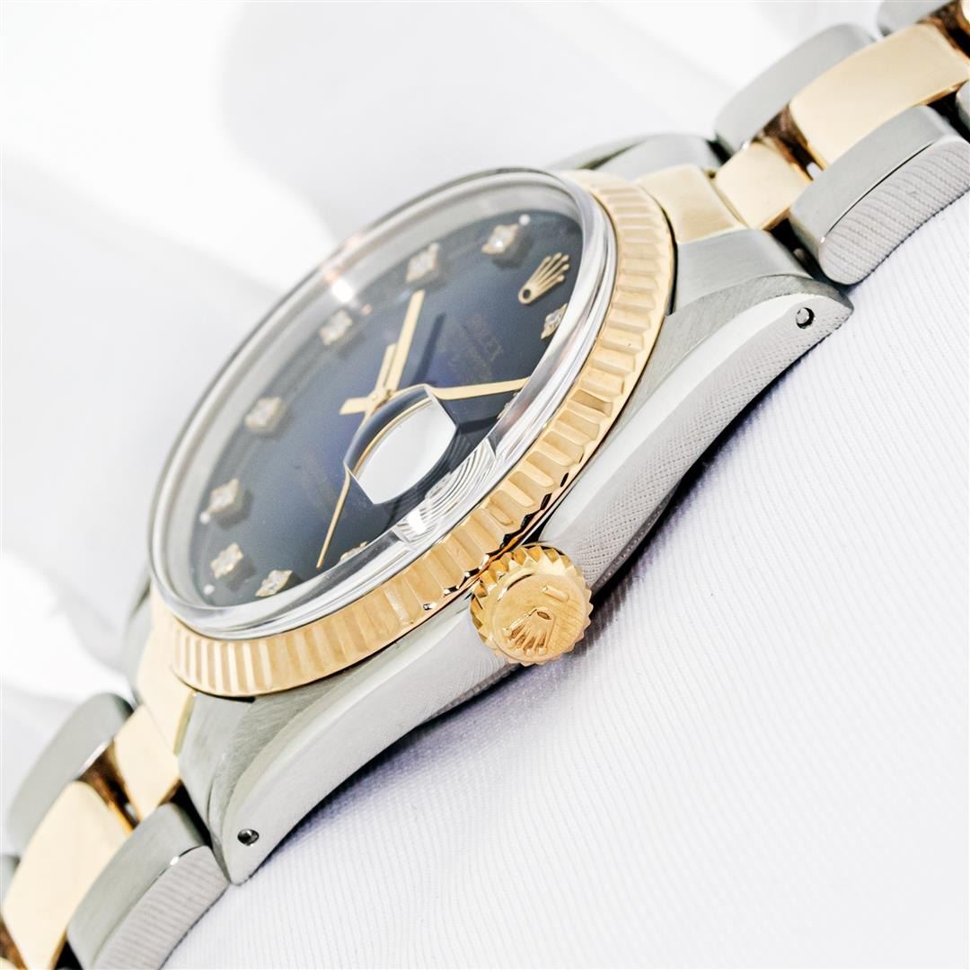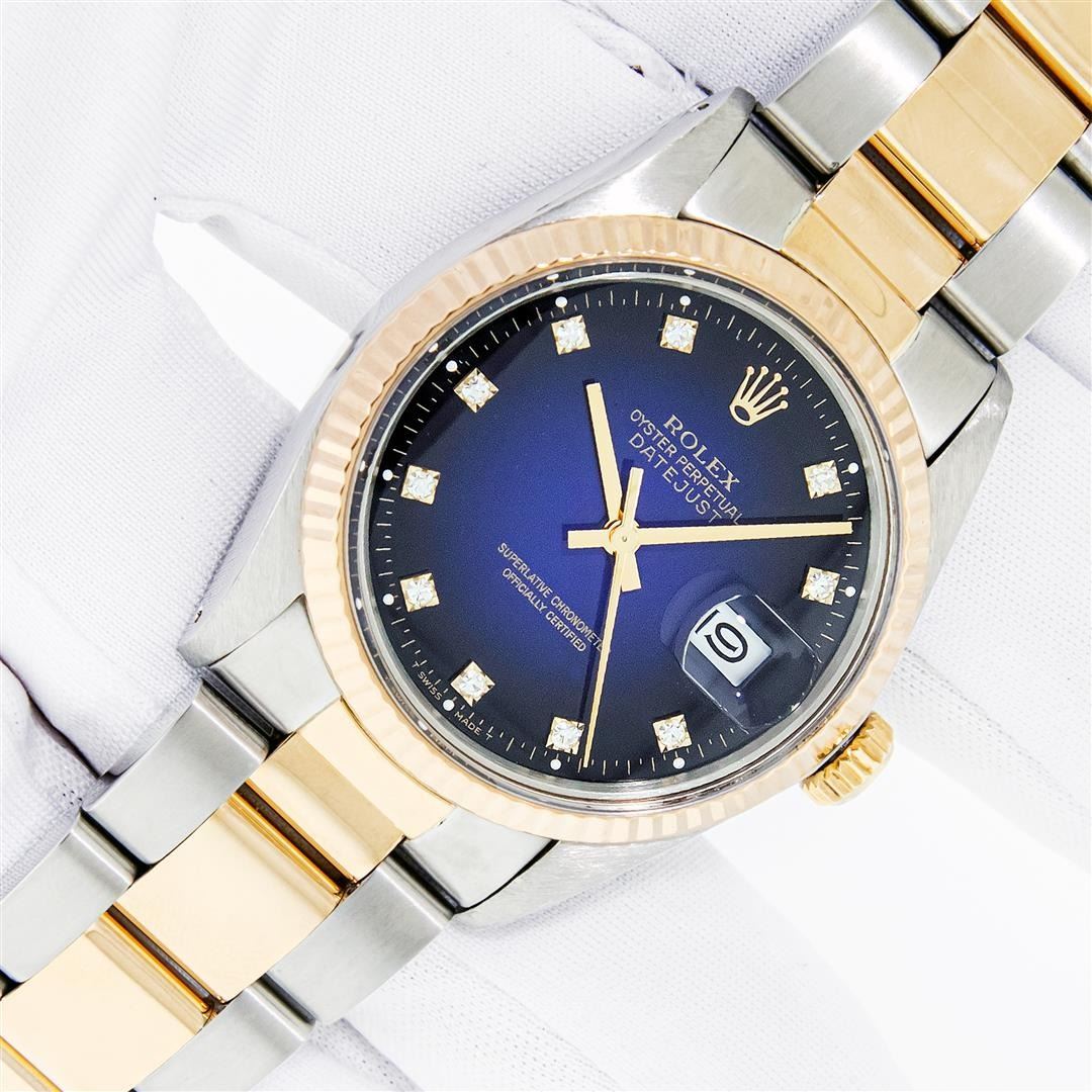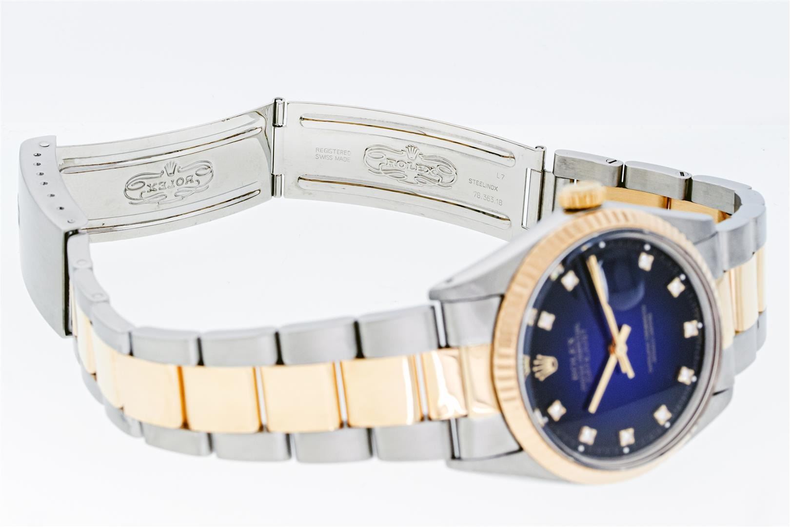 One Mens Pre Owned Yellow Gold And Stainless Steel Two Tone Rolex Datejust Polished, Serviced & Electronically Tested, Rolex Yellow Gold & Stainless Steel Case: 36mm, Rolex Yellow Gold Crown, Rolex Bezel: Yellow Gold Fluted Bezel. Custom Crystal: New Plastic With Magnified Date Window. Custom Hands: New Solid Hands. Rolex Movement: Automatic Winding Movement 3035. Custom Dial: Custom Blue Vignette Dial With Aftermarket Added Diamonds, Diamond Count: 10 Diamonds On Dial, Color: G to H. Date Window: 3 O'Clock Position Date Display, Quickset, Model: Datejust. Condition: G-6 Extra Fine. Rolex Bracelet: Two Tone Yellow Gold & Stainless Steel Oyster Band. Bright Polish. 7.0 Inch Length, Adjustable. Standard Clasp, With Rolex Logo. This Watch Has Been Serviced Time Tested And Is In Excellent Condition It Is Free Of All Scratches And Dents.