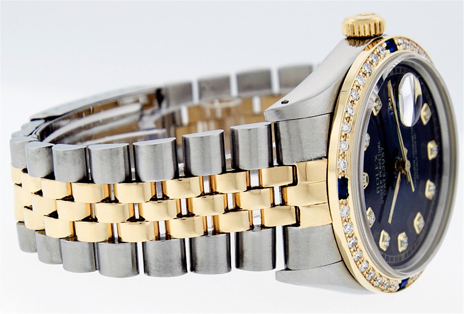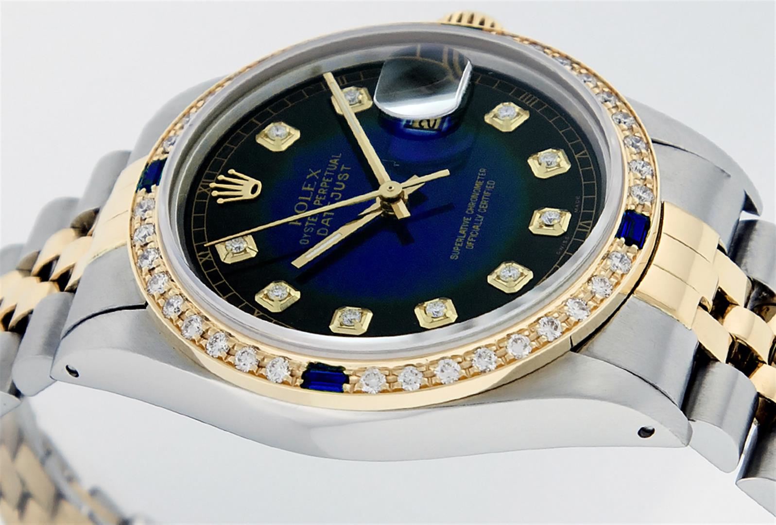 One Gents Two Tone Rolex Datejust Polished, Fully Serviced & Electronically Tested, 14K Yellow Gold & Stainless Steel Case:36mm, 14K Yellow Gold Crown, Custom Bezel: 18K Yellow Gold Sapphire Beadset Diamond Bezel, Diamond Count: 36 Diamonds + 4 Sapphires, Total Weight 1.0 Carat, Clarity: Si-VS, Color: G to H. Custom Crystal: Synthetic Sapphire Cyclops Lens. Movement: Automatic Winding Movement Caliber 3035. Custom Dial: Blue Vignette Diamond Dial With Square Roman Track. Diamond Count: 10 Diamonds In Dial, Color: G to H, Clarity: SI-VS. Date Window: 3 O'Clock Position Date Display, Quickset, Model: Datejust Condition: G-6 Extra Fine. Bracelet: Two Tone 14K Yellow Gold & Stainless Steel Jubilee. Bright Polish. 7.0 Inch Length, Adjustable. Standard Clasp, With Rolex Logo.