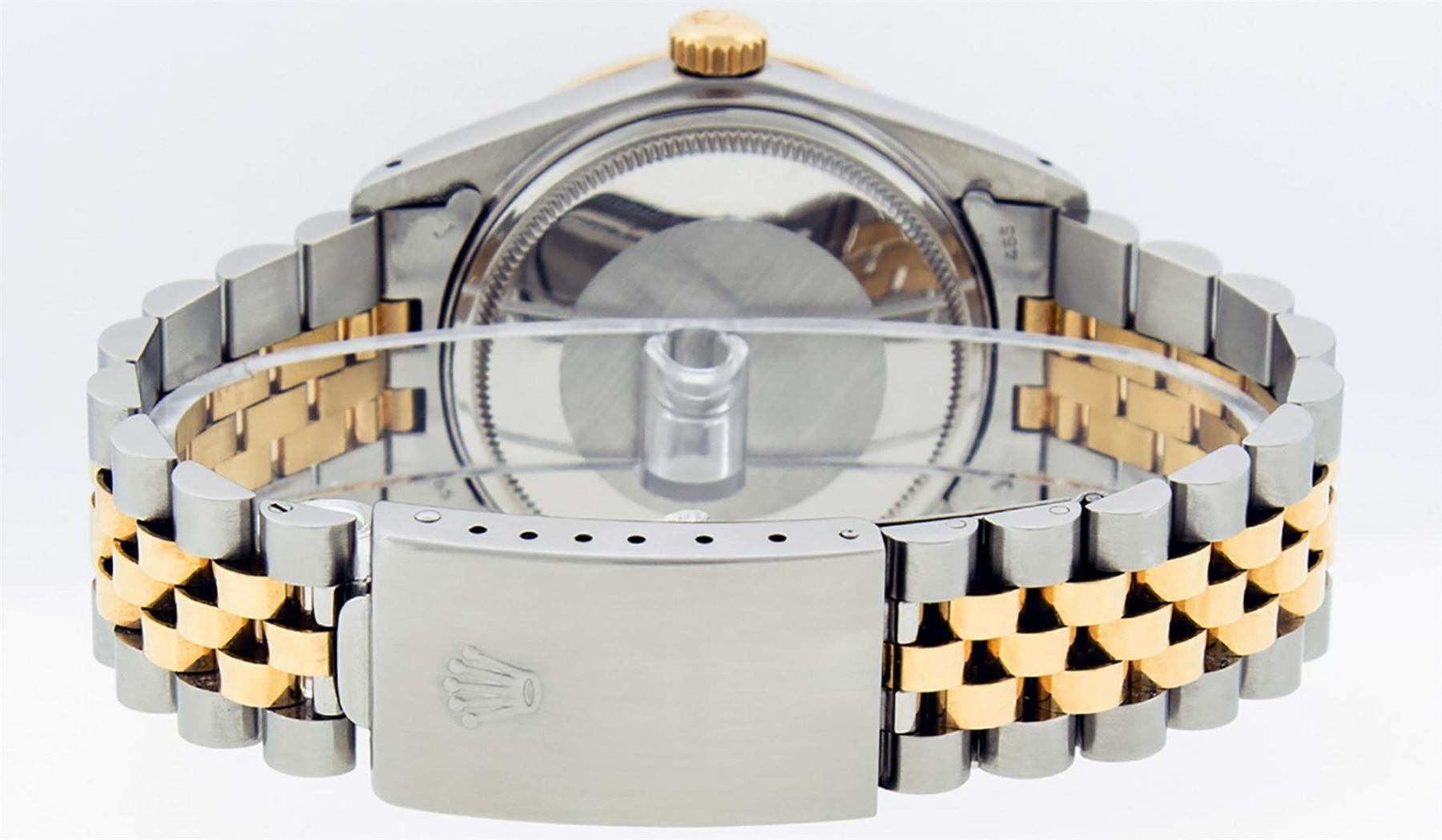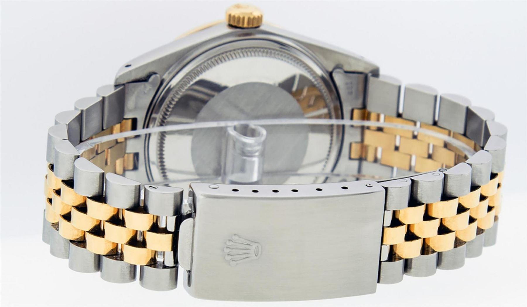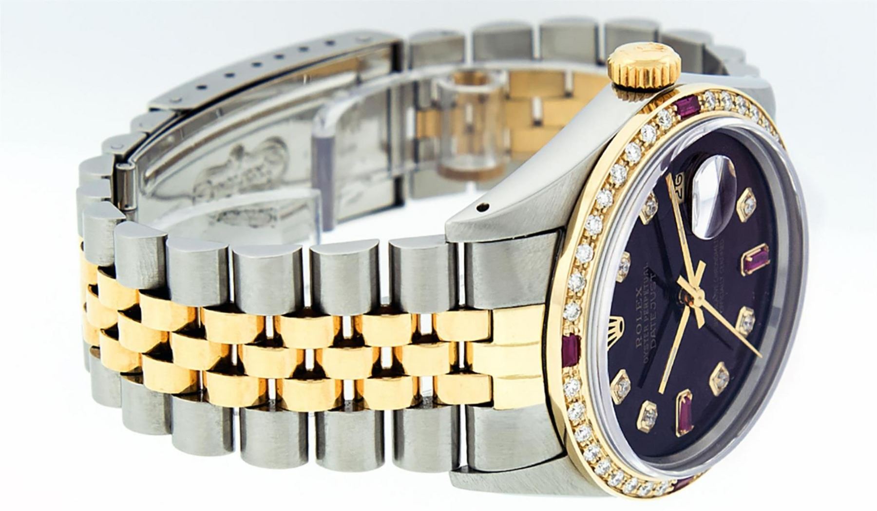 One Mens Yellow Gold Two Tone Rolex Datejust Polished, Serviced & Electronically Tested, Yellow Gold & Stainless Steel Case: 36mm, Yellow Gold Crown, Custom Bezel: New 18K Yellow Gold Ruby Beadset Diamond Bezel, Diamond Count: 36 Diamonds + 4 Ruby, Total Weight 1.00 Carat, Clarity: SI-VS, Color: G to H. Custom Crystal: New Scratch Resistant Synthetic Sapphire Cyclops Lens. Movement: Automatic Winding Movement. Custom Dial: Brown Dial With Diamond Hour Markers and Synthetic Ruby Baguette Markers On 6 and 9, Stone Count: 8 Diamonds + 2 Synthetic Bagguette Rubies In Dial. Date Window: 3 O'Clock Position Date Display, Quickset, Model: Condition: G-6 Extra Fine. Bracelet: Two Tone Yellow Gold & Stainless Steel Jubilee. Bright Polish. 7.0 Inch Length, Adjustable. Standard Clasp, With Rolex Logo. This Watch Has Been Serviced Time Tested And Is In Excellent Condition It Is Free Of All Scratches And Dents.