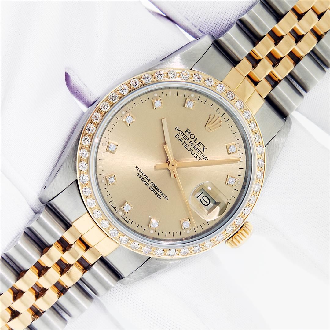 One Mens Pre Owned Two Tone Yellow Gold & Stainless Steel Rolex Datejust Polished, Serviced & Electronically Tested, Yellow Gold & Stainless Steel Case: 36mm, Rolex Yellow Gold Crown, Custom Bezel: New 18K Yellow Gold Beadset Diamond Bezel, Diamond Count: 44 Diamonds, Clarity: SI-VS, Color: G to H. Custom Crystal: New Sapphire With Magnified Date Window. Custom Hands: New Hands. Rolex Movement: Automatic Winding Movement. Rolex Factory Dial: Champagne Dial With Diamond Hour Markers. Diamond Count: 10 Diamonds In Dial. Date Window: 3 O'Clock Position Date Display, Quickset, Model: Datejust. Condition: G-6 Extra Fine. Rolex Bracelet: Two Tone Yellow Gold & Stainless Steel Jubilee Band. Bright Polish. 7.0 Inch Length, Adjustable. Standard Clasp, With Rolex Logo. This Watch Has Been Serviced Time Tested And Is In Excellent Condition It Is Free Of All Scratches And Dents.
