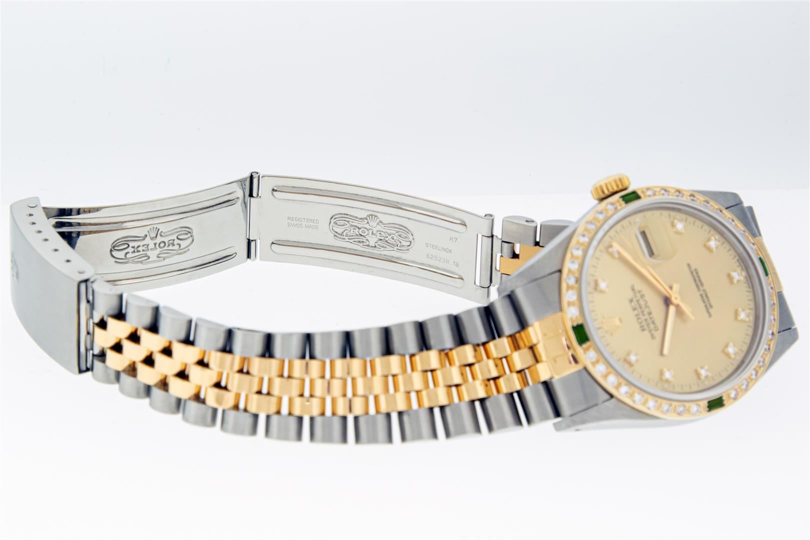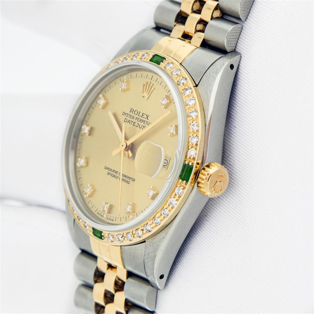 One Mens Pre owned Two Tone Yellow Gold & Stainless Steel Rolex Datejust Polished, Serviced & Electronically Tested, Yellow Gold & Stainless Steel Case: 36mm, Rolex Yellow Gold Crown, Custom Bezel: New 18K Yellow Gold Emerald Beadset Diamond Bezel, Diamond Count: 36 Diamonds + 4 Emeralds, Clarity: SI-VS, Color: G to H. Custom Crystal: New Sapphire With Magnified Date Window. Custom Hands: New Hands. Rolex Movement: Automatic Winding Movement. Rolex Factory Dial: Champagne Dial With Diamond Hour Markers. Diamond Count: 10 Diamonds In Dial. Date Window: 3 O'Clock Position Date Display, Quickset, Model: Datejust. Condition: G-6 Extra Fine. Rolex Bracelet: Two Tone Yellow Gold & Stainless Steel Jubilee Band. Bright Polish. 7.0 Inch Length, Adjustable. Standard Clasp, With Rolex Logo. This Pre Owned Watch Has Been Serviced Time Tested And Is In Excellent Condition It Is Free Of All Scratches And Dents.