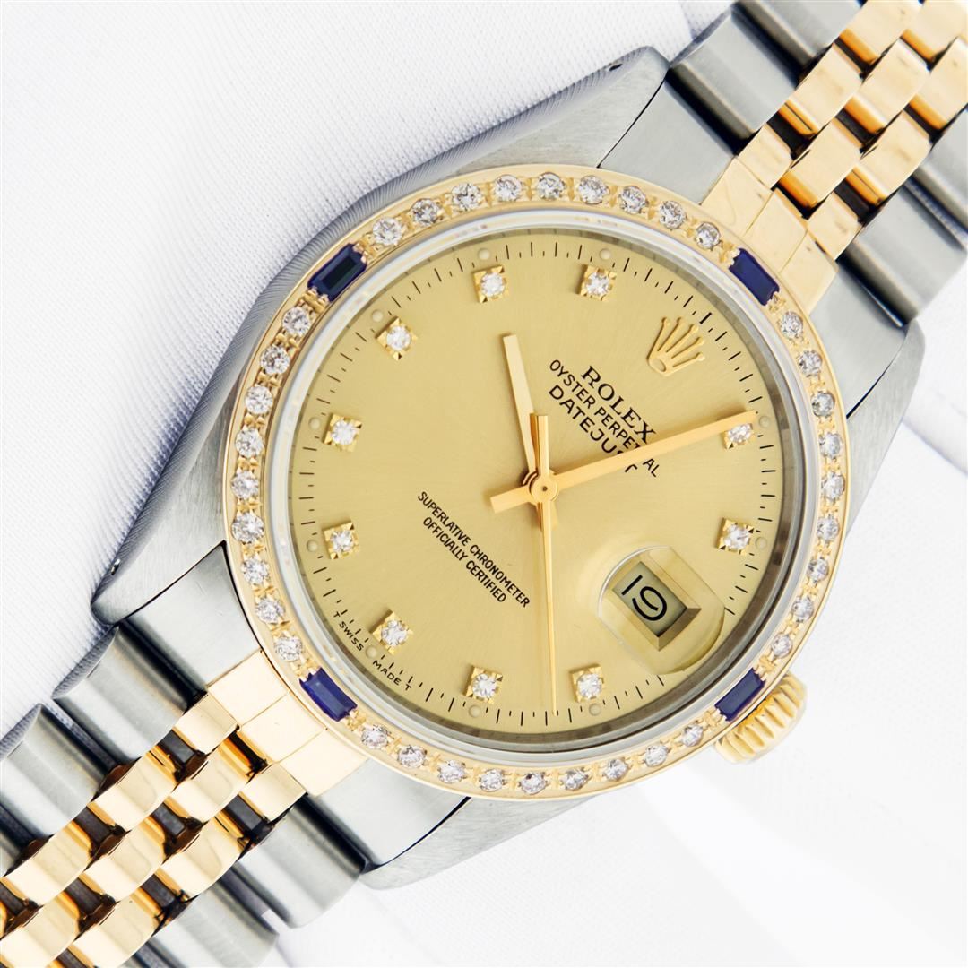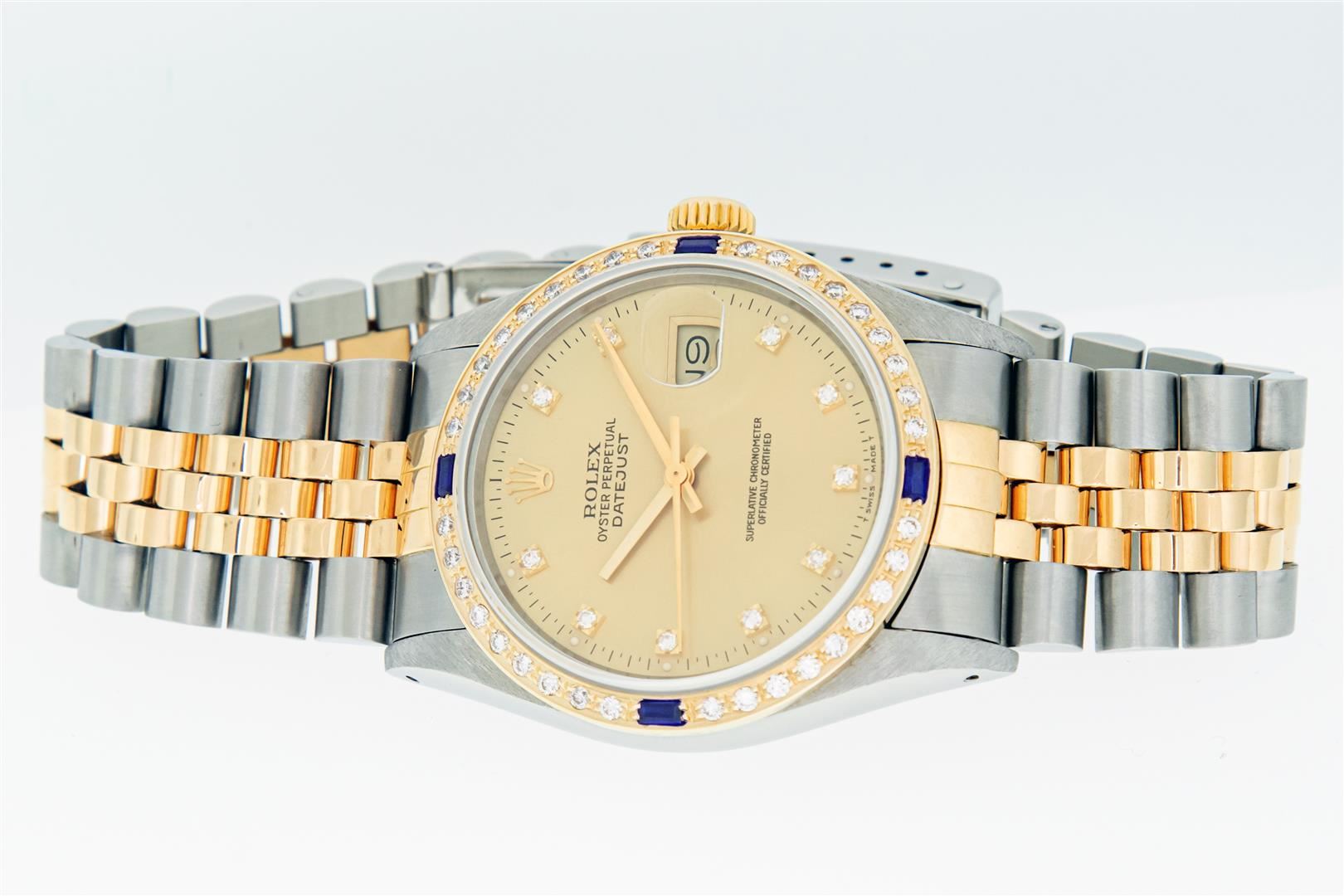 One Mens Pre owned Two Tone Yellow Gold & Stainless Steel Rolex Datejust Polished, Serviced & Electronically Tested, Yellow Gold & Stainless Steel Case: 36mm, Rolex Yellow Gold Crown, Custom Bezel: New 18K Yellow Gold Sapphire Beadset Diamond Bezel, Diamond Count: 36 Diamonds + 4 Sapphires, Clarity: SI-VS, Color: G to H. Custom Crystal: New Sapphire With Magnified Date Window. Custom Hands: New Hands. Rolex Movement: Automatic Winding Movement. Rolex Factory Dial: Champagne Dial With Diamond Hour Markers. Diamond Count: 10 Diamonds In Dial. Date Window: 3 O'Clock Position Date Display, Quickset, Model: Datejust. Condition: G-6 Extra Fine. Rolex Bracelet: Two Tone Yellow Gold & Stainless Steel Jubilee Band. Bright Polish. 7.0 Inch Length, Adjustable. Standard Clasp, With Rolex Logo. This Pre Owned Watch Has Been Serviced Time Tested And Is In Excellent Condition It Is Free Of All Scratches And Dents.