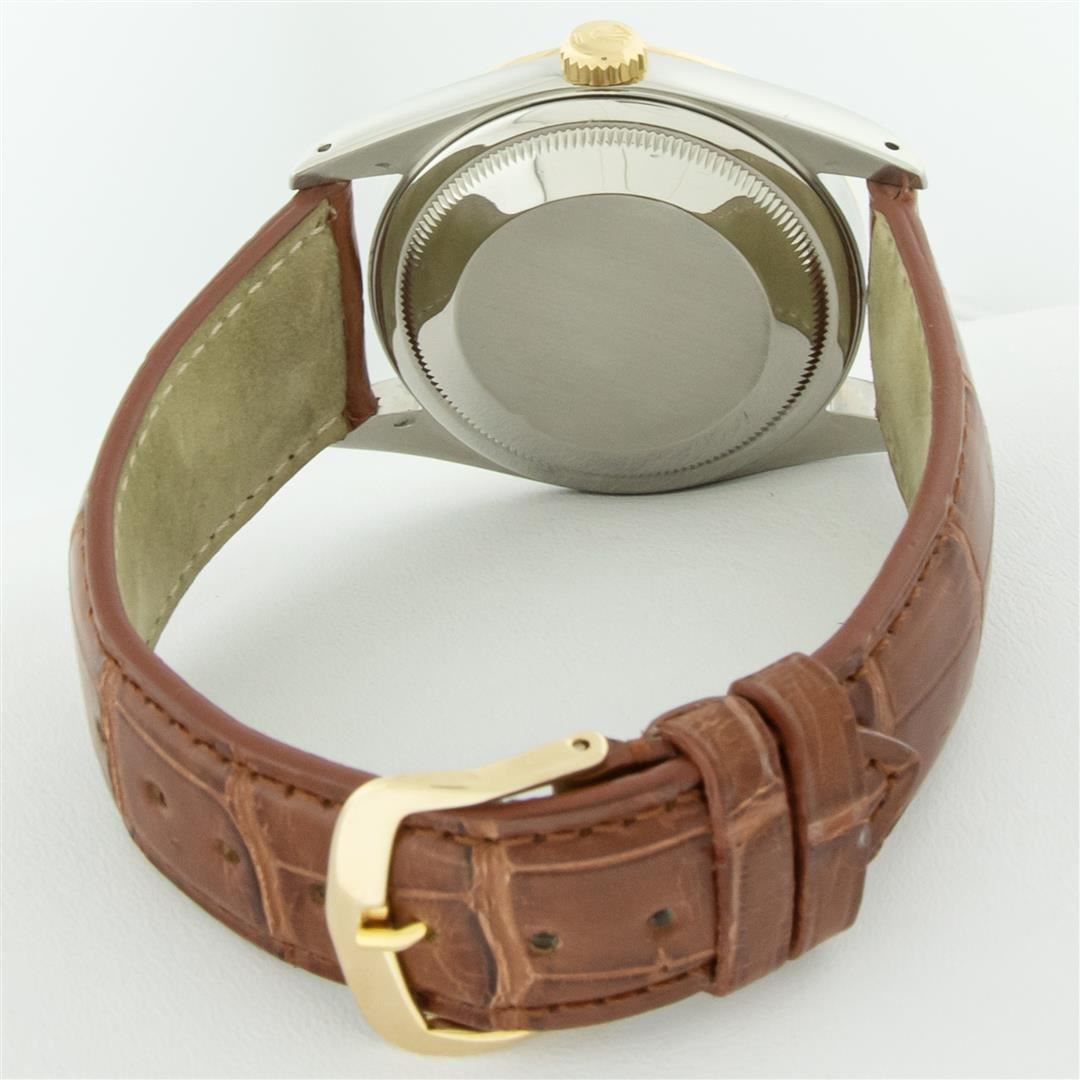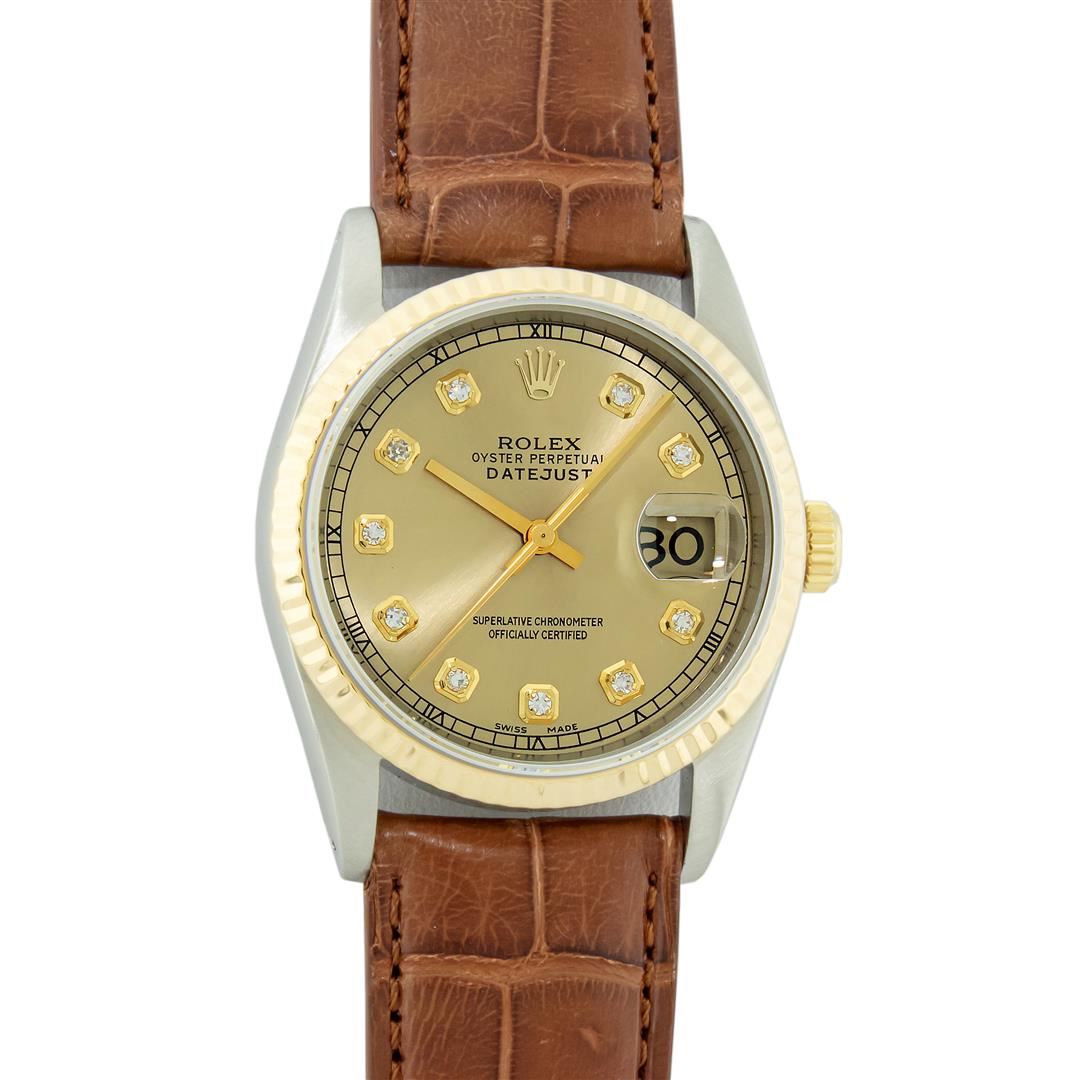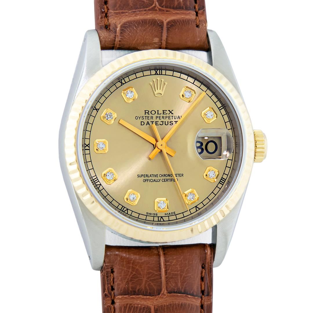 One Mens Pre Owned Yellow Gold Two Tone Rolex Datejust Polished, Serviced & Electronically Tested, Rolex Yellow Gold & Stainless Steel Case: 36mm, Rolex Yellow Gold Crown, Rolex Bezel: Yellow Gold Fluted Bezel. Custom Crystal: New Acrylic Cyclops Lens. Cu