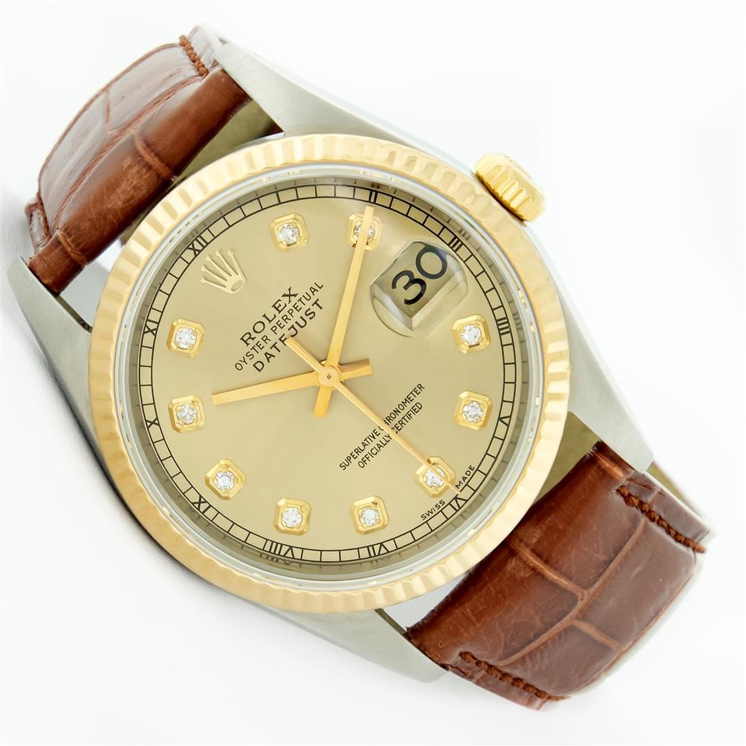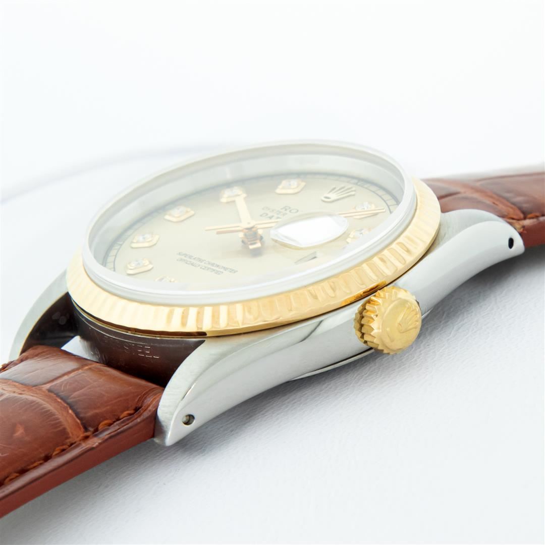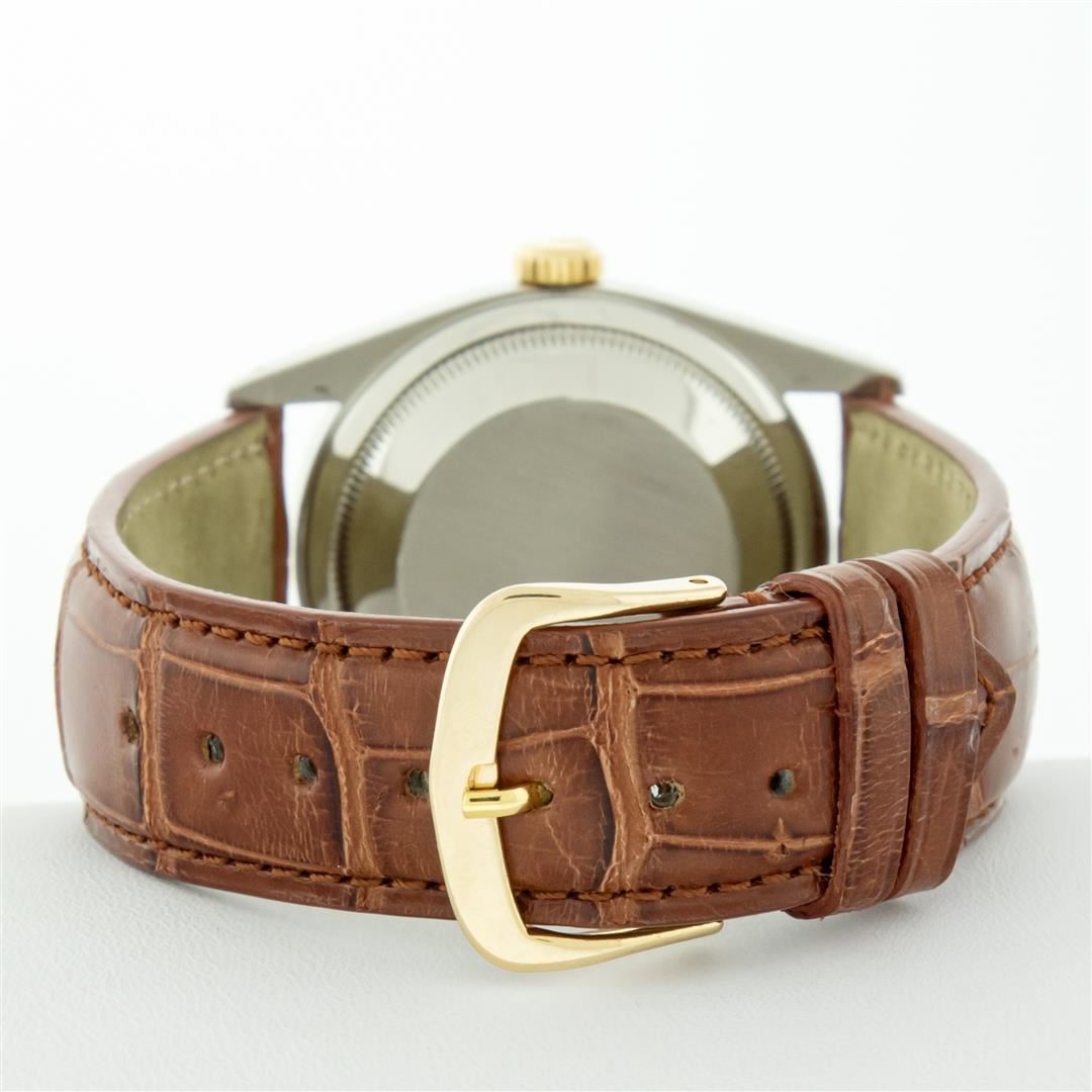 One Mens Pre Owned Yellow Gold Two Tone Rolex Datejust Polished, Serviced & Electronically Tested, Rolex Yellow Gold & Stainless Steel Case: 36mm, Rolex Yellow Gold Crown, Rolex Bezel: Yellow Gold Fluted Bezel. Custom Crystal: New Acrylic Cyclops Lens. Cu