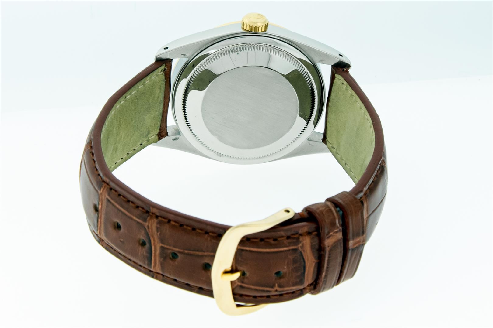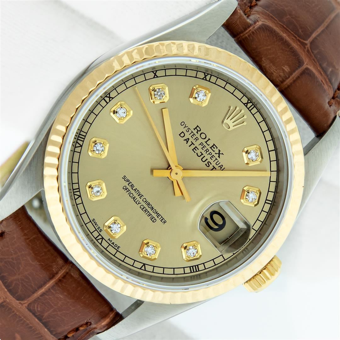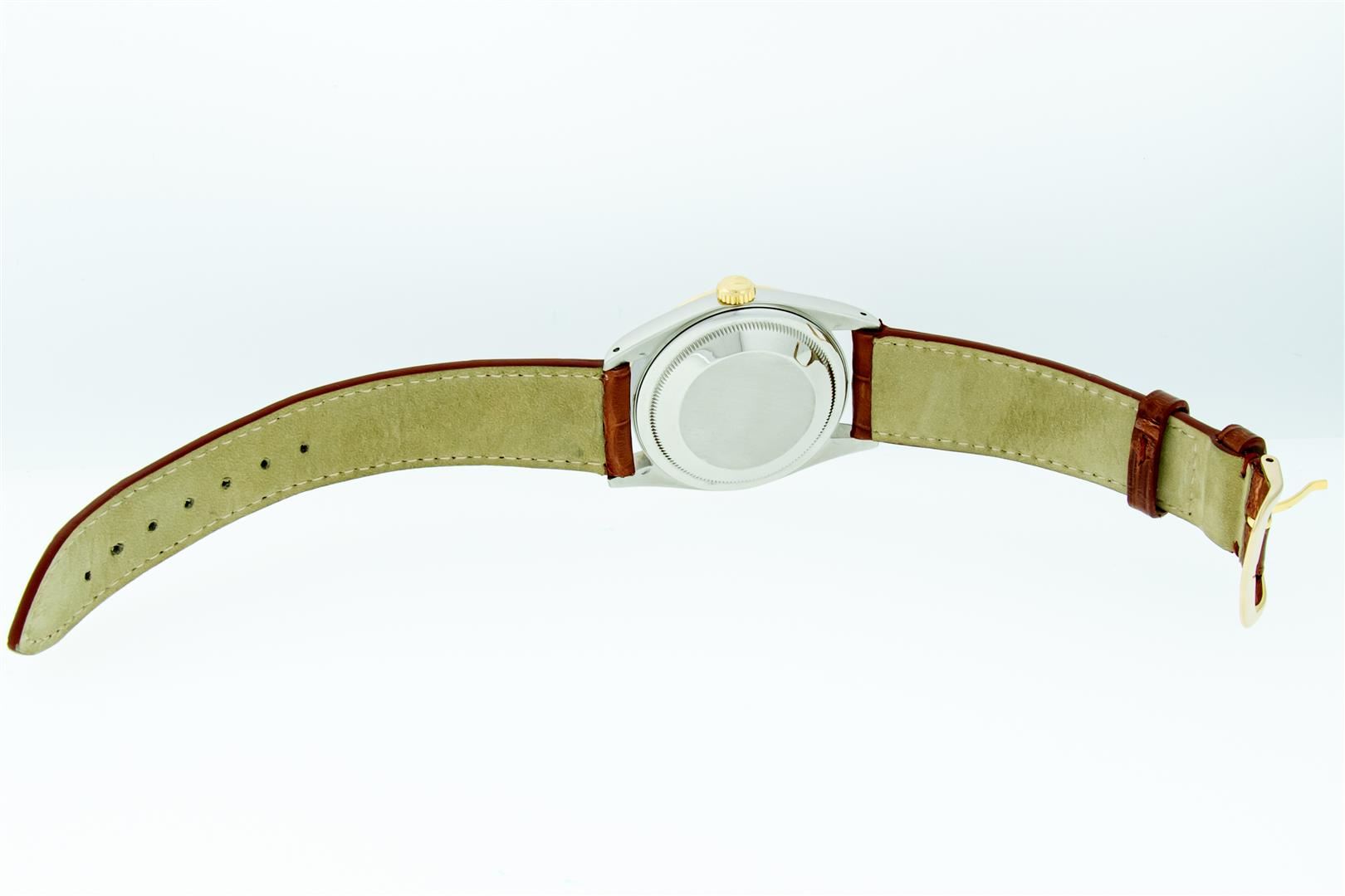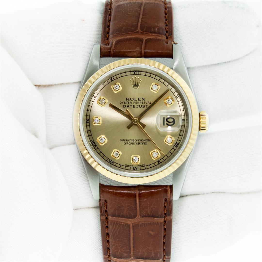 One Mens Pre Owned Yellow Gold Two Tone Rolex Datejust Polished, Serviced & Electronically Tested, Rolex Yellow Gold & Stainless Steel Case: 36mm, Rolex Yellow Gold Crown, Rolex Bezel: Yellow Gold Fluted Bezel. Custom Crystal: New Acrylic Cyclops Lens. Cu
