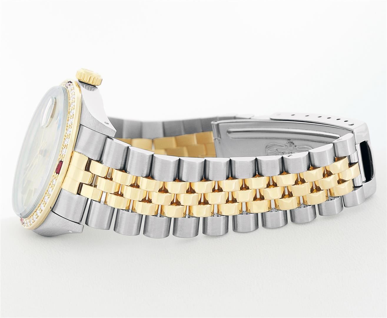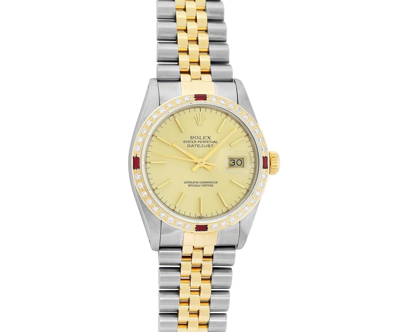 One Mens Rolex Quickset Pre Owned Two Tone 14K Yellow Gold And Stainless Steel Datejust Polished, Serviced & Electronically Tested, Rolex Yellow Gold & Stainless Steel Case: 36mm, Rolex 14K Yellow Gold Crown, Custom Bezel: New 18K Yellow Diamond + Ruby Beadset Bezel, Stone Count: 36 Diamonds + 4 Rubies, Total Weight .75 Carat, Clarity: SI-VS, Color: G to H. Custom Crystal: New Sapphire With Magnified Date Window. Custom Hands: New Luminecent Hands. Rolex Movement: Automatic Winding Movement 3035. Rolex Dial: Champagne Dial With Index Hour Markers Dash Track And Lumi Dots. Date Window: 3 O'Clock Position Date Display, Quickset, Model: Datejust. Condition: G-6 Extra Fine. Rolex Bracelet: Two Tone 14K Yellow Gold & Stainless Steel Jubilee Band. Bright Polish. 7.0 Inch Length, Adjustable. Standard Clasp, With Rolex Logo. This Watch Has Been Serviced Time Tested And Is In Excellent Condition It Is Free Of All Scratches And Dents.