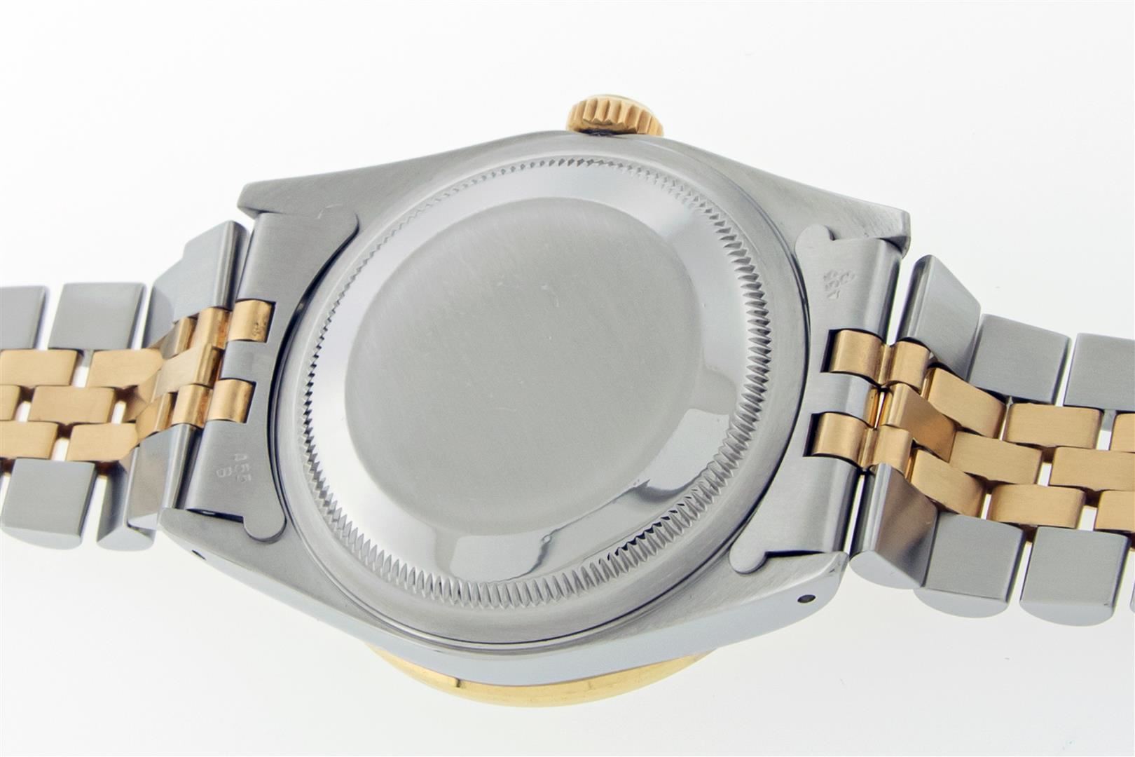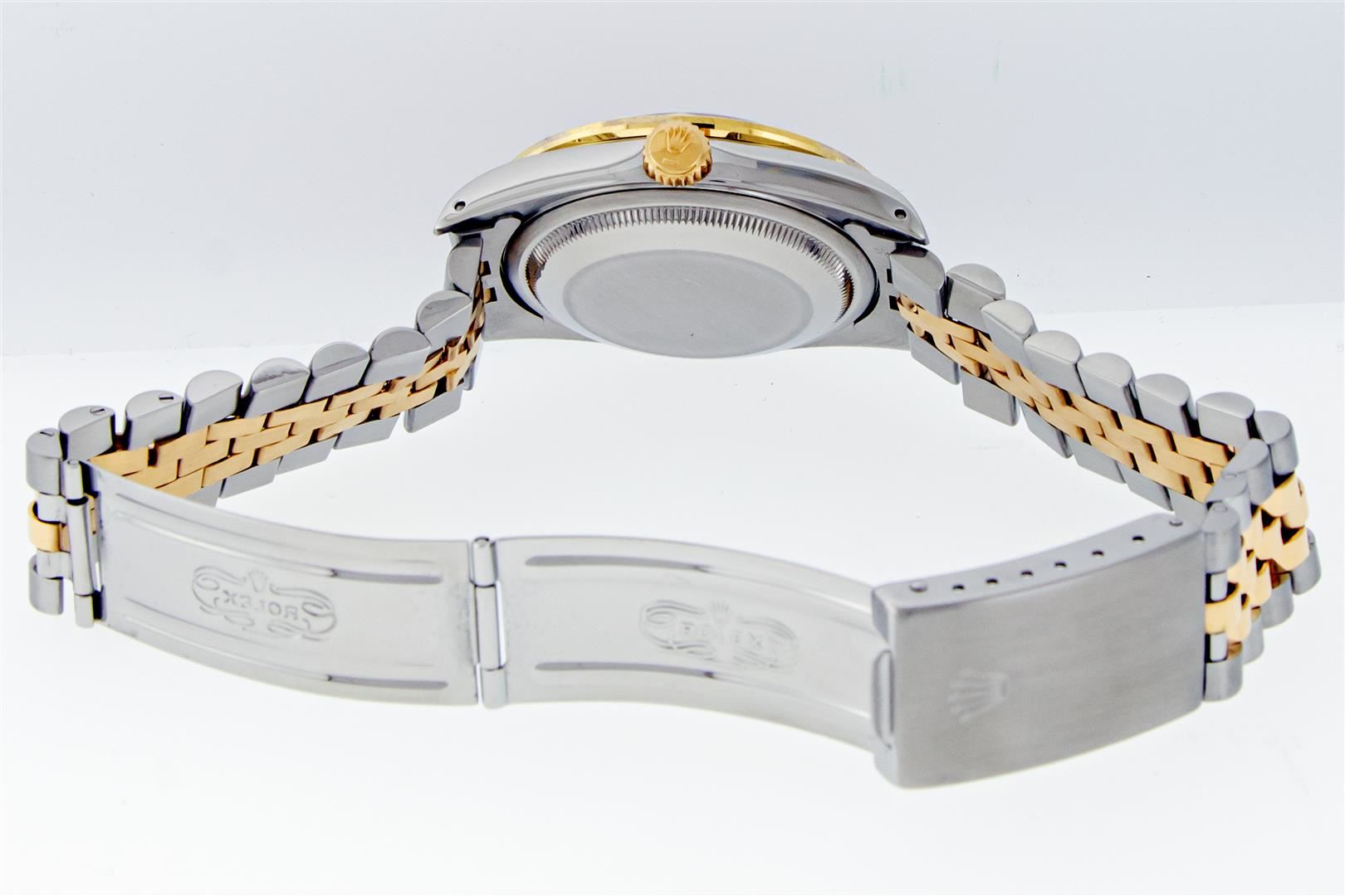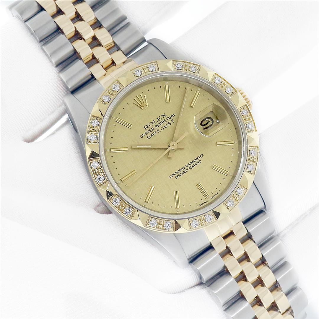One Mens Pre Owned Yellow Gold Two Tone Rolex Datejust Polished, Serviced & Electronically Tested, Rolex Yellow Gold & Stainless Steel Case: 36mm, Rolex 14K Yellow Gold Crown, Custom Bezel: New 18K Yellow Gold Pyramid Diamond Bezel, Diamond Count On Bezel: 24 Diamonds, Total Weight .75 Carat, Clarity: SI-VS, Color: G to H. Custom Crystal: New Sapphire With Magnified Date Window. Custom Hands: New Luminecent Hands. Rolex Movement: Automatic Winding Movement. Rolex Dial: Champagne Jubilee Dial With Index Hour Markers and Small Track With Lumi Dots. Date Window: 3 O'Clock Position Date Display, Quickset, Model: Datejust. Condition: G-6 Extra Fine. Rolex Bracelet: Two Tone Yellow Gold & Stainless Steel Jubilee Band. Bright Polish. 7.0 Inch Length, Adjustable. Standard Clasp, With Rolex Logo. This Pre Owned Watch Has Been Serviced Time Tested And Is In Excellent Condition It Is Free Of All Scratches And Dents. This Watch Comes With A Rolex Box and Booklets.