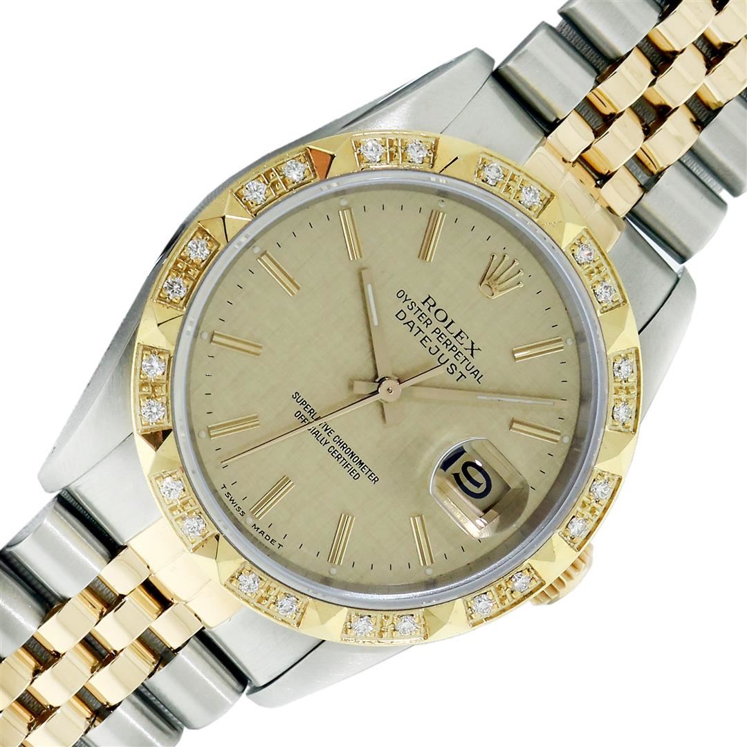 One Mens Pre Owned Yellow Gold Two Tone Rolex Datejust Polished, Serviced & Electronically Tested, Rolex Yellow Gold & Stainless Steel Case: 36mm, Rolex 14K Yellow Gold Crown, Custom Bezel: New 18K Yellow Gold Pyramid Diamond Bezel, Diamond Count On Bezel: 24 Diamonds, Total Weight .75 Carat, Clarity: SI-VS, Color: G to H. Custom Crystal: New Sapphire With Magnified Date Window. Custom Hands: New Luminecent Hands. Rolex Movement: Automatic Winding Movement. Rolex Dial: Champagne Jubilee Dial With Index Hour Markers and Small Track With Lumi Dots. Date Window: 3 O'Clock Position Date Display, Quickset, Model: Datejust. Condition: G-6 Extra Fine. Rolex Bracelet: Two Tone Yellow Gold & Stainless Steel Jubilee Band. Bright Polish. 7.0 Inch Length, Adjustable. Standard Clasp, With Rolex Logo. This Pre Owned Watch Has Been Serviced Time Tested And Is In Excellent Condition It Is Free Of All Scratches And Dents. This Watch Comes With A Rolex Box and Booklets.