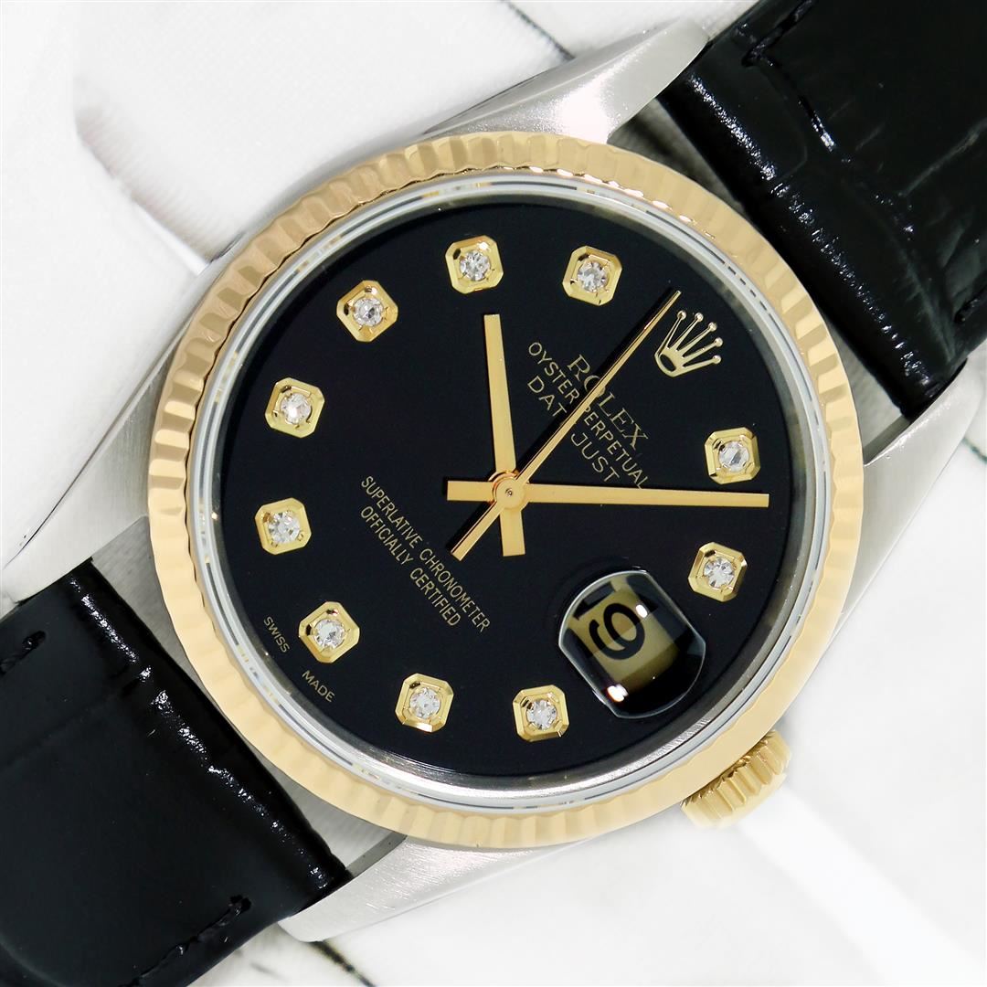 One Mens Pre Owned Yellow Gold Two Tone Rolex Datejust Polished, Serviced & Electronically Tested, Rolex Yellow Gold & Stainless Steel Case: 36mm, Rolex Yellow Gold Crown, Rolex Bezel: 18K Yellow Gold Fluted Bezel. Custom Crystal: New Acrylic Cyclops Lens. Custom Hands: New Gold Hands. Rolex Movement: Automatic Winding Movement. Custom Dial: Refinished To Black Dial With Custom Added Genuine VS Diamond Hour Markers, Diamond Count: 10 Diamonds in Dial G To H In Color, SI-VS Clarity. Date Window: 3 O'Clock Position Date Display, Quickset, Model: Datejust. Condition: G-6 Extra Fine. Custom Band: New Black Leather Band 7.0 Inch Length with New Custom Pin Buckle Clasp. This Watch Has Been Serviced And Polished It Is Free Of All Scratches And Dents.