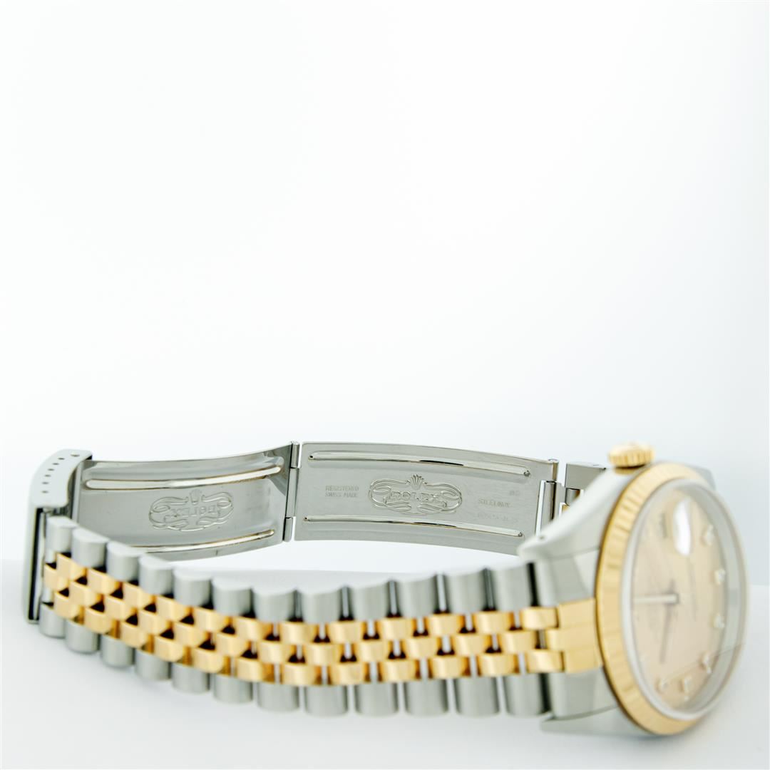 One Mens Quickset Pre Owned Two Tone 14K Yellow Gold And Stainless Steel Rolex Datejust Polished, Serviced & Electronically Tested, Yellow Gold & Stainless Steel Case: 36mm, Yellow Gold Crown, Rolex Bezel: Original Rolex 14K Yellow Gold Fluted Bezel, Custom Crystal: New Acrylic Crystal Lens With Magnified Date Window. Hands: Luminescent Hands. Rolex Movement: Automatic Winding Movement 3035. Rolex Dial: Rolex Factory Champagne Diamond Dial With Dash Track & Lumi Dots, Diamond Count: 10 Diamonds In Dial, Clarity: VVS,Date Window: 3 O'Clock Position Date Display, Quickset, Model: Quickset Datejust. Condition: G-6 Extra Fine. Rolex Bracelet: Two Tone 14K Yellow Gold & Stainless Steel Jubilee Band. Bright Polish. 7.0 Inch Length, Adjustable. Standard Clasp, With Rolex Logo. This Watch Has Been Serviced Time Tested And Is In Excellent Condition It Is Free Of All Scratches And Dents.