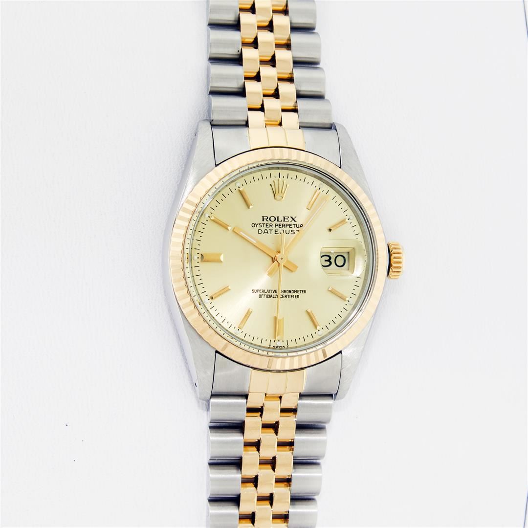 One Mens Rolex Pre Owned 14K Two Tone Yellow Gold And Stainless Steel Datejust Polished, Serviced & Electronically Tested, Yellow Gold & Stainless Steel Case: 36mm, Yellow Gold Crown, Rolex Bezel: 14K Yellow Gold Fluted Bezel. Custom Crystal: New Acrylic With Magnified Date Window. Custom Hands: New Luminescent Hands. Rolex Movement: Automatic Winding Movement 3035. Rolex Dial: Champagne Index Dial With Dash Track & Lumi Dots. Date Window: 3 O'Clock Position Date Display, Quickset, Model: Datejust. Condition: G-6 Extra Fine. Rolex Bracelet: Two Tone 14K Yellow Gold And Stainless Steel Jubilee Band. Bright Polish. 7.0 Inch Length, Adjustable. Standard Clasp, With Rolex Logo. This Watch Has Been Serviced Time Tested And Is In Excellent Condition It Is Free Of All Scratches And Dents.