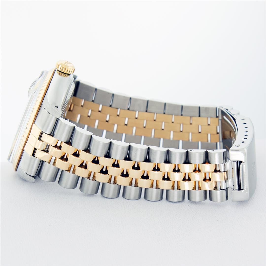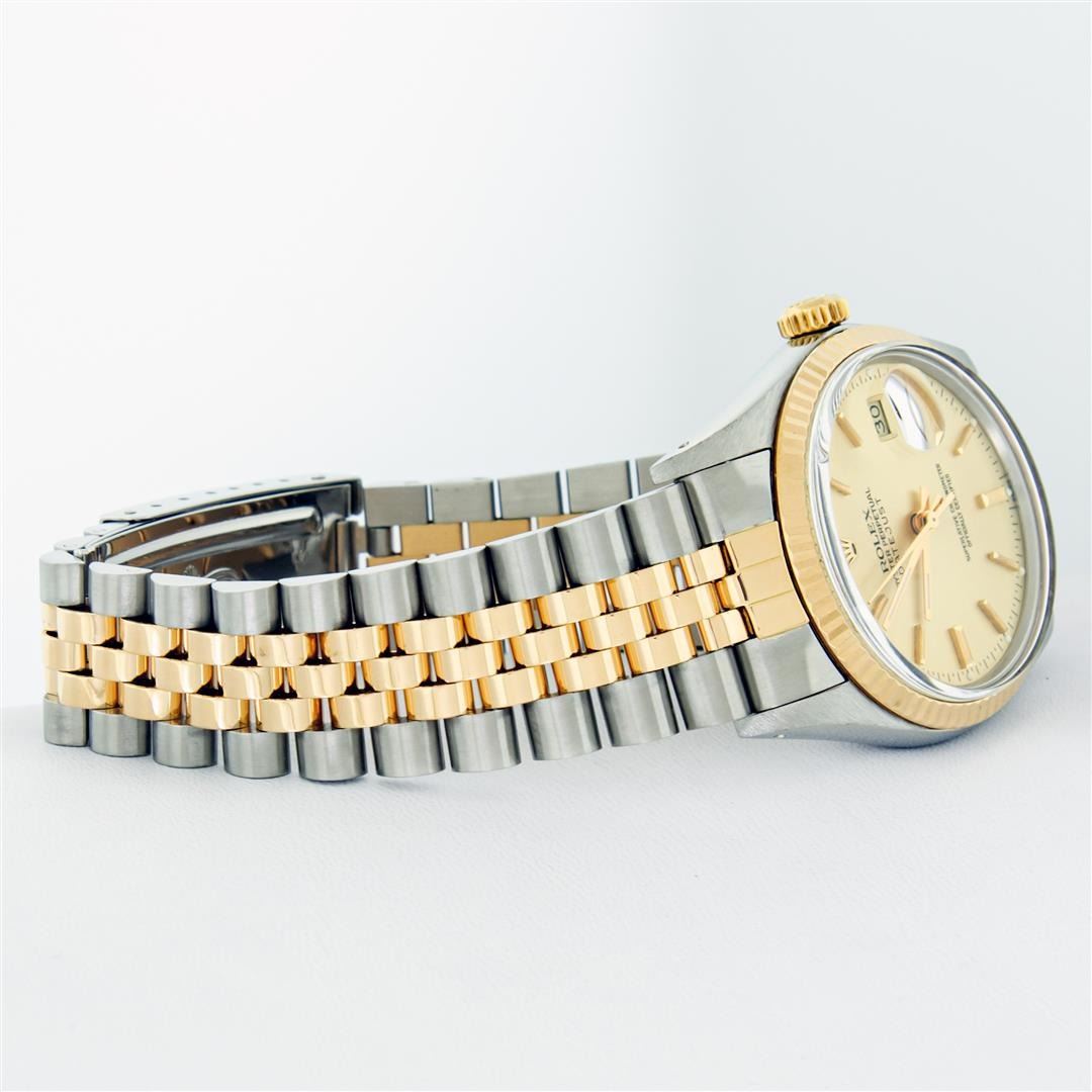 One Mens Rolex Pre Owned 14K Two Tone Yellow Gold And Stainless Steel Datejust Polished, Serviced & Electronically Tested, Yellow Gold & Stainless Steel Case: 36mm, Yellow Gold Crown, Rolex Bezel: 14K Yellow Gold Fluted Bezel. Custom Crystal: New Acrylic With Magnified Date Window. Custom Hands: New Luminescent Hands. Rolex Movement: Automatic Winding Movement 3035. Rolex Dial: Champagne Index Dial With Dash Track & Lumi Dots. Date Window: 3 O'Clock Position Date Display, Quickset, Model: Datejust. Condition: G-6 Extra Fine. Rolex Bracelet: Two Tone 14K Yellow Gold And Stainless Steel Jubilee Band. Bright Polish. 7.0 Inch Length, Adjustable. Standard Clasp, With Rolex Logo. This Watch Has Been Serviced Time Tested And Is In Excellent Condition It Is Free Of All Scratches And Dents.