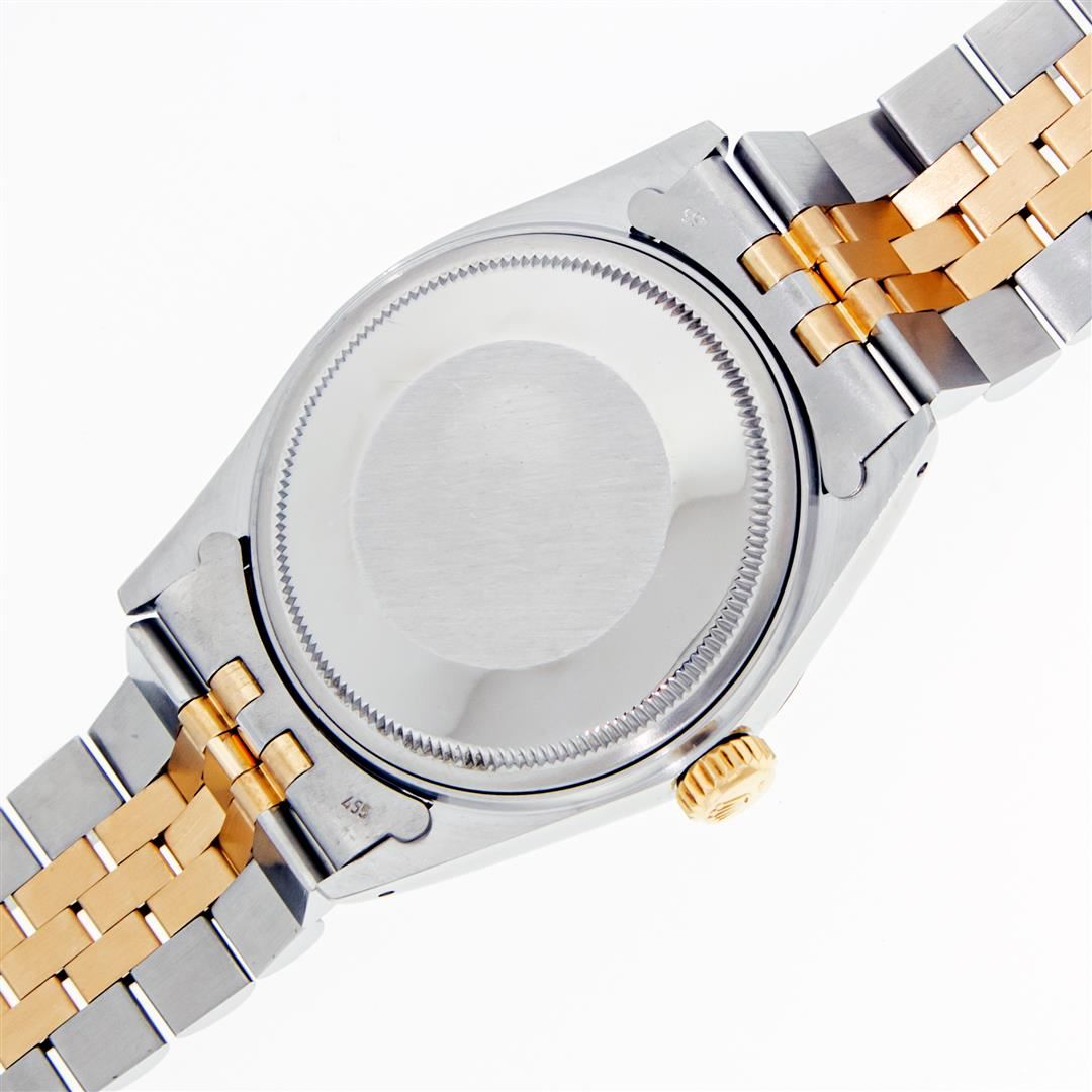 One Mens Rolex Pre Owned 14K Two Tone Yellow Gold And Stainless Steel Datejust Polished, Serviced & Electronically Tested, Yellow Gold & Stainless Steel Case: 36mm, Yellow Gold Crown, Rolex Bezel: 14K Yellow Gold Fluted Bezel. Custom Crystal: New Acrylic With Magnified Date Window. Custom Hands: New Luminescent Hands. Rolex Movement: Automatic Winding Movement 3035. Rolex Dial: Champagne Index Dial With Dash Track & Lumi Dots. Date Window: 3 O'Clock Position Date Display, Quickset, Model: Datejust. Condition: G-6 Extra Fine. Rolex Bracelet: Two Tone 14K Yellow Gold And Stainless Steel Jubilee Band. Bright Polish. 7.0 Inch Length, Adjustable. Standard Clasp, With Rolex Logo. This Watch Has Been Serviced Time Tested And Is In Excellent Condition It Is Free Of All Scratches And Dents.