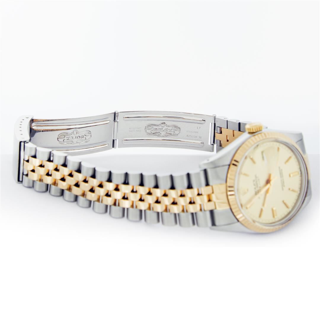 One Mens Rolex Pre Owned 14K Two Tone Yellow Gold And Stainless Steel Datejust Polished, Serviced & Electronically Tested, Yellow Gold & Stainless Steel Case: 36mm, Yellow Gold Crown, Rolex Bezel: 14K Yellow Gold Fluted Bezel. Custom Crystal: New Acrylic With Magnified Date Window. Custom Hands: New Luminescent Hands. Rolex Movement: Automatic Winding Movement 3035. Rolex Dial: Champagne Index Dial With Dash Track & Lumi Dots. Date Window: 3 O'Clock Position Date Display, Quickset, Model: Datejust. Condition: G-6 Extra Fine. Rolex Bracelet: Two Tone 14K Yellow Gold And Stainless Steel Jubilee Band. Bright Polish. 7.0 Inch Length, Adjustable. Standard Clasp, With Rolex Logo. This Watch Has Been Serviced Time Tested And Is In Excellent Condition It Is Free Of All Scratches And Dents.