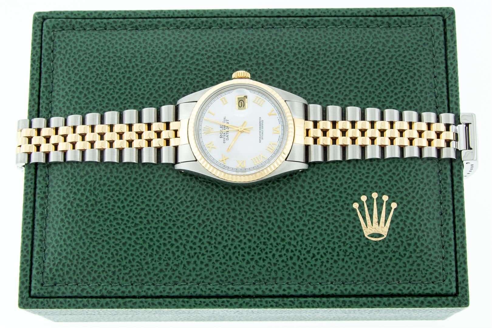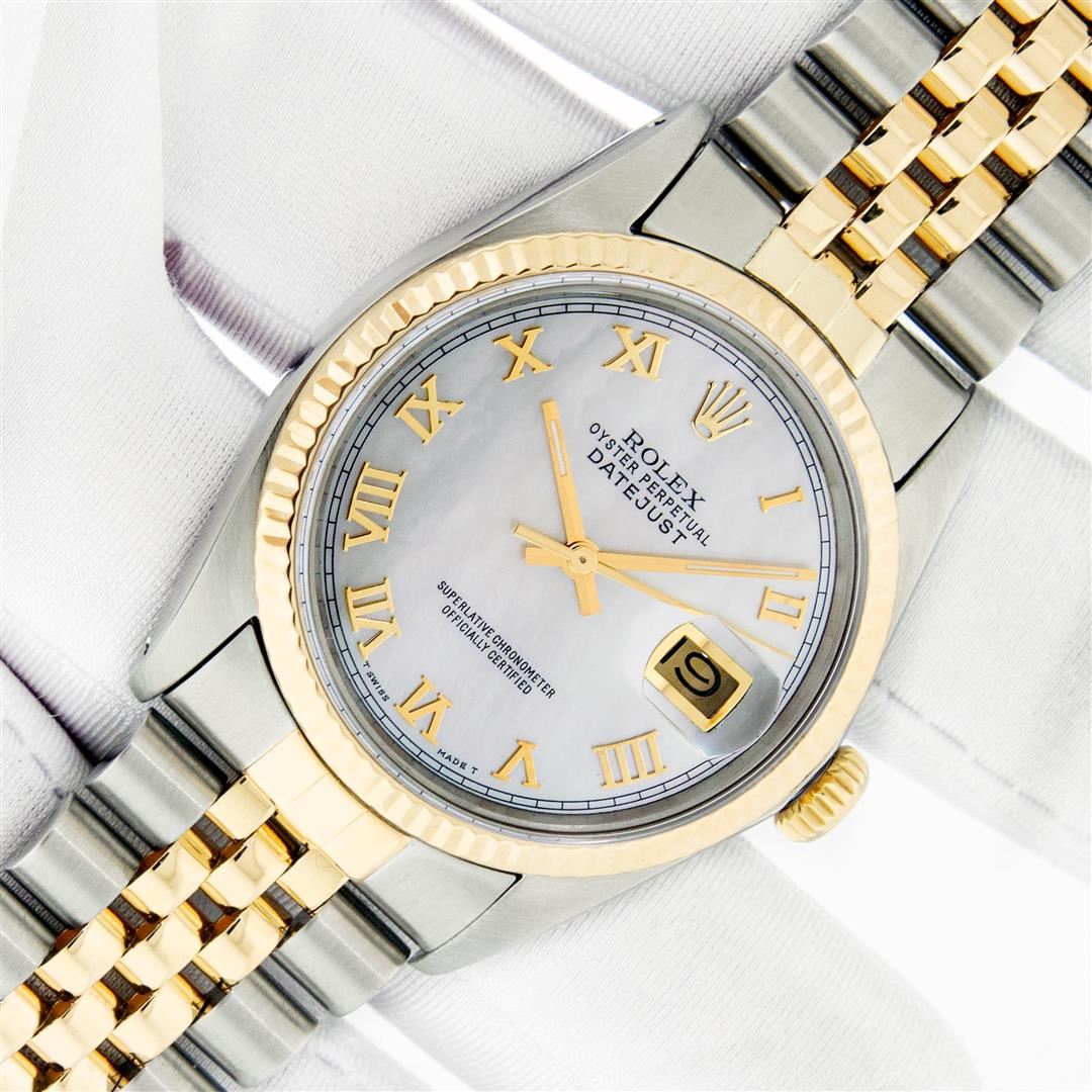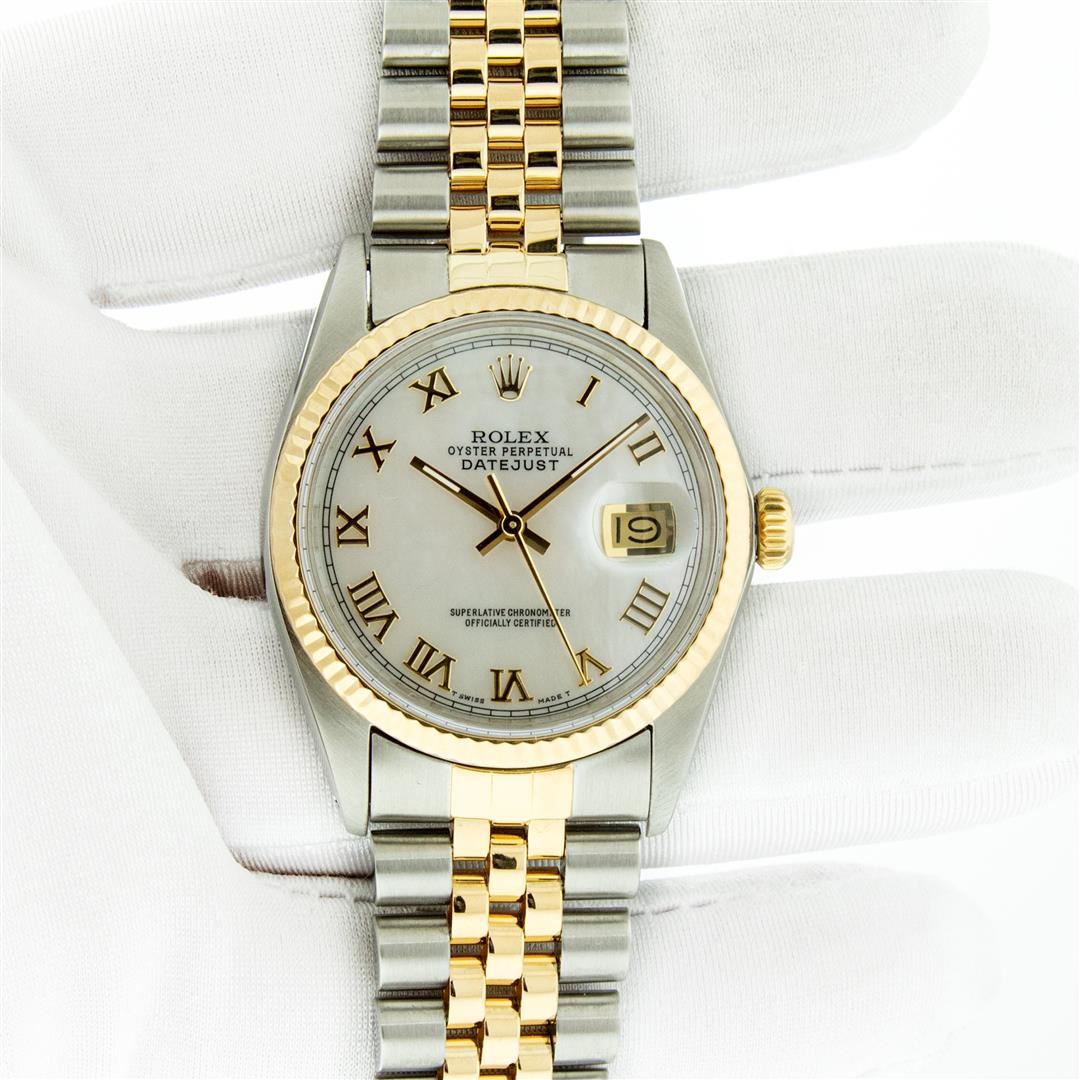 One Mens Pre Owned Yellow Gold Two Tone Rolex Datejust Polished, Serviced & Electronically Tested, Rolex Yellow Gold & Stainless Steel Case: 36mm, Rolex Yellow Gold Crown, Rolex Bezel: Yellow Gold Fluted Bezel. Custom Crystal: New Acrylic Cyclops Lens. Custom Hands: New Luminescent Hands. Rolex Movement: Automatic Winding Movement. Custom Dial: Refinished To Mother Of Pearl Roman With Square Track. Date Window: 3 O'Clock Position Date Display, Quickset, Model: Datejust. Condition: G-6 Extra Fine. Rolex Bracelet: Two Tone Yellow Gold & Stainless Steel Jubilee Band. Bright Polish. 7.0 Inch Length, Adjustable. Standard Clasp, With Rolex Logo. This Watch Has Been Serviced Time Tested And Is In Excellent Condition It Is Free Of All Scratches And Dents.