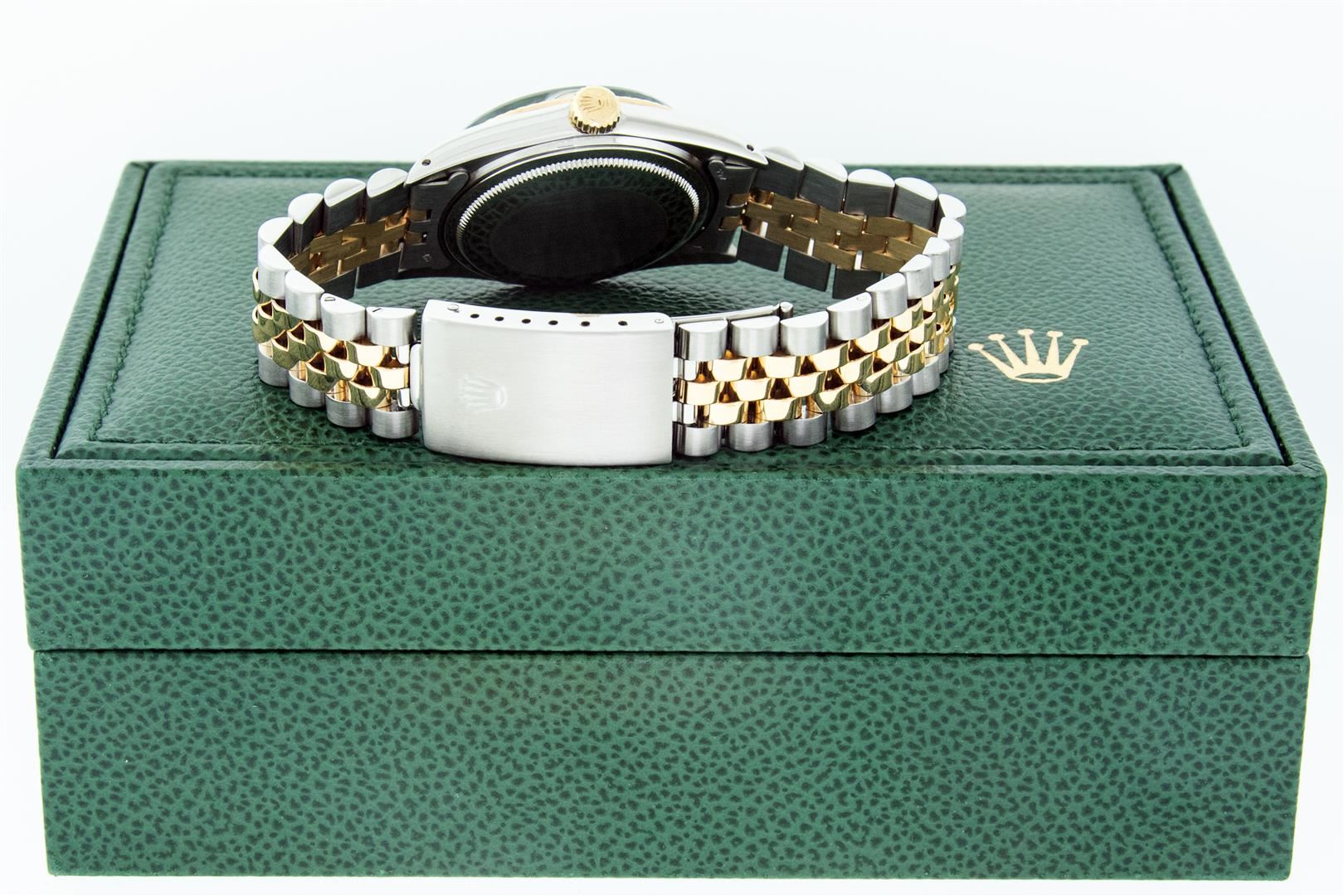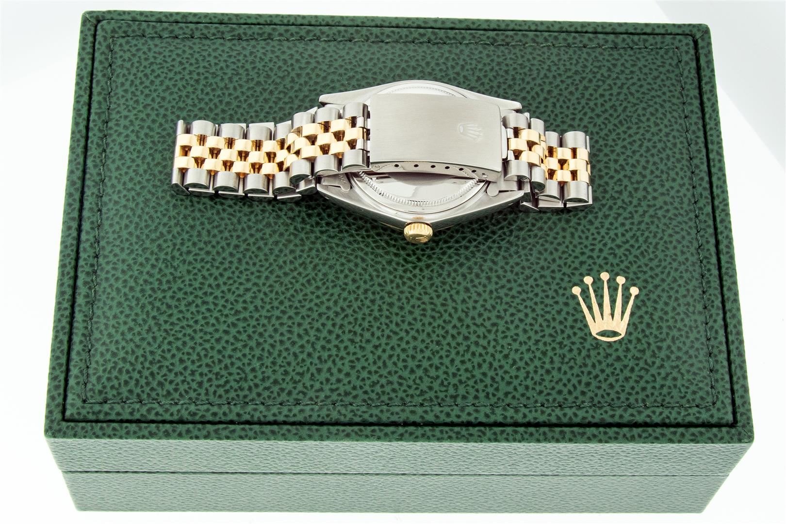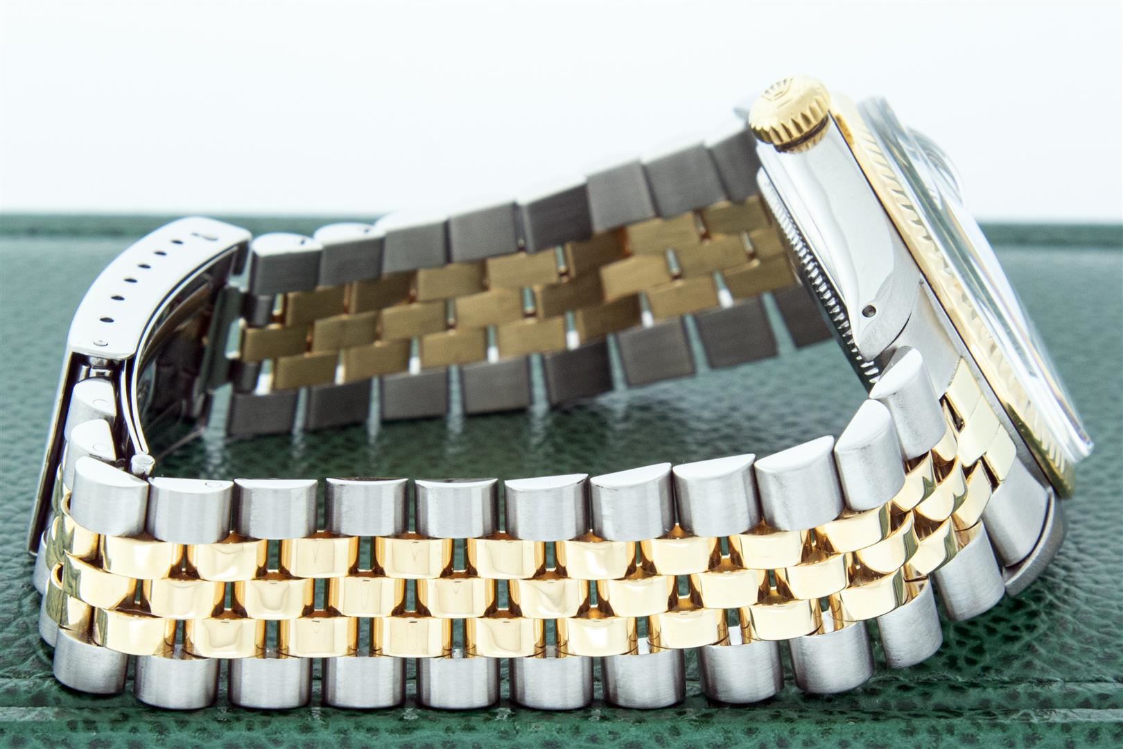 One Mens Pre Owned Yellow Gold Two Tone Rolex Datejust Polished, Serviced & Electronically Tested, Rolex Yellow Gold & Stainless Steel Case: 36mm, Rolex Yellow Gold Crown, Rolex Bezel: Yellow Gold Fluted Bezel. Custom Crystal: New Acrylic Cyclops Lens. Custom Hands: New Luminescent Hands. Rolex Movement: Automatic Winding Movement. Custom Dial: Refinished To Mother Of Pearl Roman With Square Track. Date Window: 3 O'Clock Position Date Display, Quickset, Model: Datejust. Condition: G-6 Extra Fine. Rolex Bracelet: Two Tone Yellow Gold & Stainless Steel Jubilee Band. Bright Polish. 7.0 Inch Length, Adjustable. Standard Clasp, With Rolex Logo. This Watch Has Been Serviced Time Tested And Is In Excellent Condition It Is Free Of All Scratches And Dents.