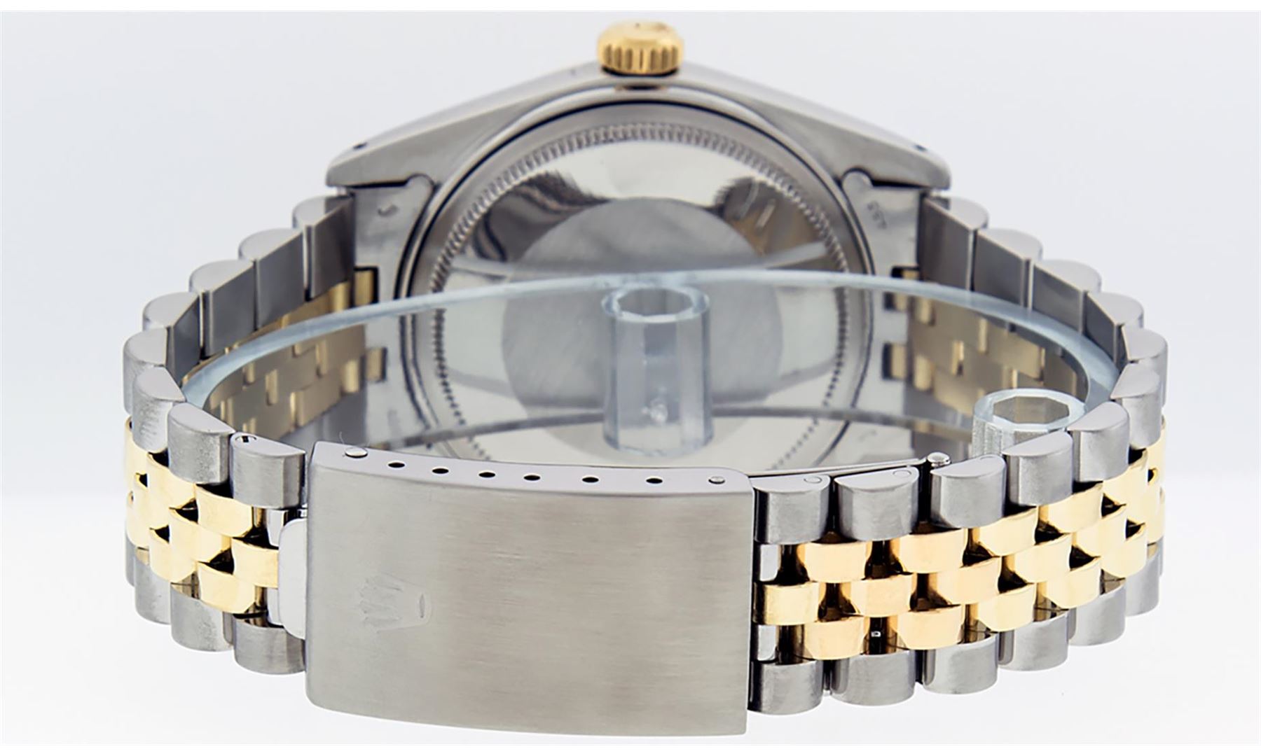 One Mens Pre Owned Yellow Gold Two Tone Rolex Datejust Polished, Serviced & Electronically Tested, Rolex Yellow Gold & Stainless Steel Case: 36mm, Rolex Yellow Gold Crown, Rolex Bezel: Yellow Gold Fluted Bezel. Custom Crystal: New Acrylic Cyclops Lens. Custom Hands: New Luminescent Hands. Rolex Movement: Automatic Winding Movement. Custom Dial: Refinished To Mother Of Pearl Roman With Square Track. Date Window: 3 O'Clock Position Date Display, Quickset, Model: Datejust. Condition: G-6 Extra Fine. Rolex Bracelet: Two Tone Yellow Gold & Stainless Steel Jubilee Band. Bright Polish. 7.0 Inch Length, Adjustable. Standard Clasp, With Rolex Logo. This Watch Has Been Serviced Time Tested And Is In Excellent Condition It Is Free Of All Scratches And Dents.