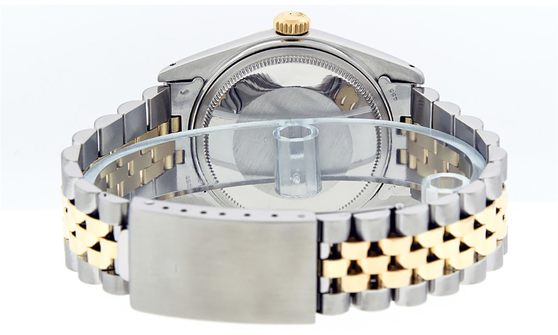One Mens Pre Owned Yellow Gold Two Tone Rolex Datejust Polished, Serviced & Electronically Tested, Rolex Yellow Gold & Stainless Steel Case: 36mm, Rolex Yellow Gold Crown, Rolex Bezel: Yellow Gold Fluted Bezel. Custom Crystal: New Acrylic Cyclops Lens. Custom Hands: New Luminescent Hands. Rolex Movement: Automatic Winding Movement. Custom Dial: Refinished To Mother Of Pearl Roman With Square Track. Date Window: 3 O'Clock Position Date Display, Quickset, Model: Datejust. Condition: G-6 Extra Fine. Rolex Bracelet: Two Tone Yellow Gold & Stainless Steel Jubilee Band. Bright Polish. 7.0 Inch Length, Adjustable. Standard Clasp, With Rolex Logo. This Watch Has Been Serviced Time Tested And Is In Excellent Condition It Is Free Of All Scratches And Dents.