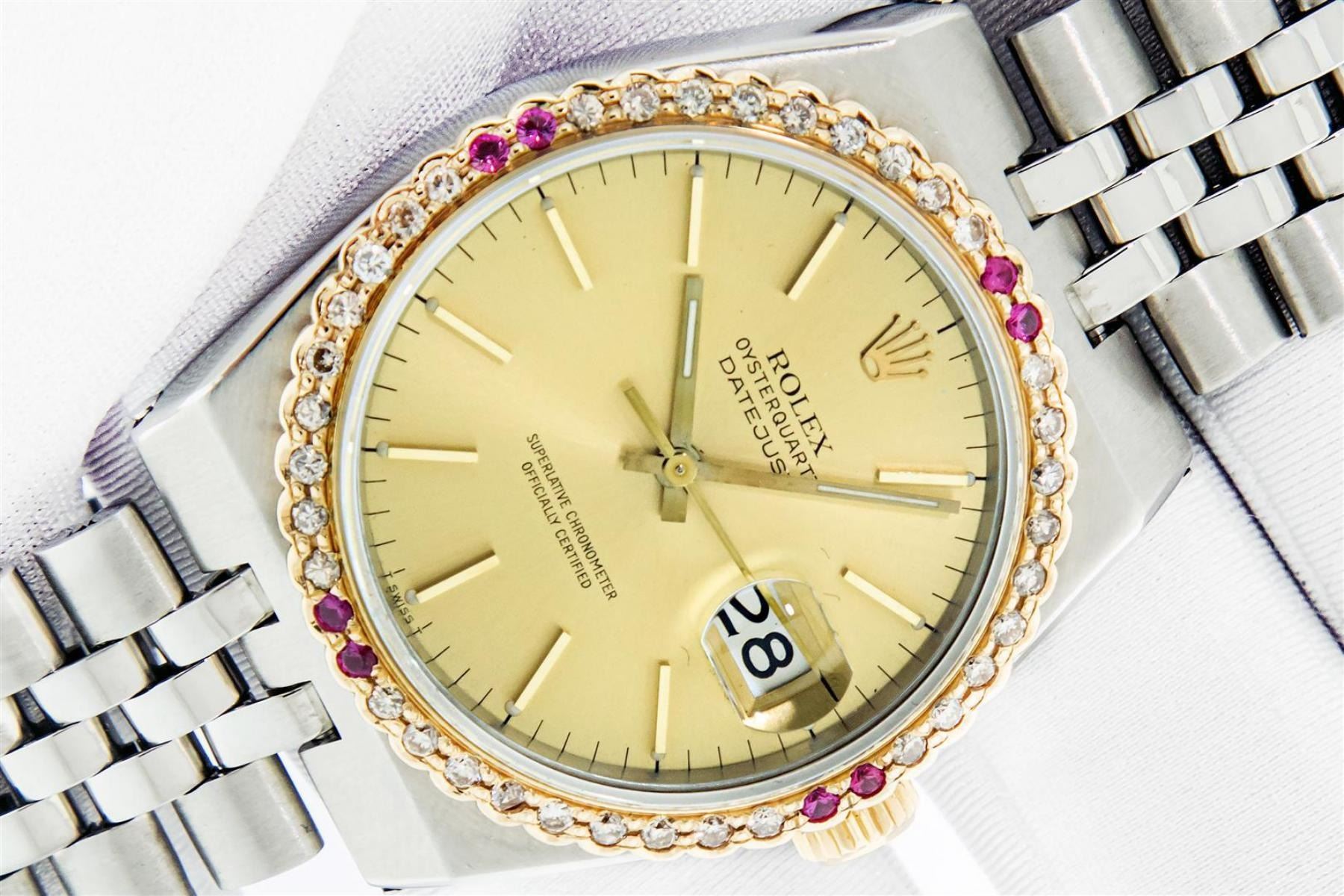One Mens Stainless Steel Rolex Oysterquartz Datejust Polished, Serviced & Electronically Tested, Stainless Steel Case: 36mm, Original 18K Yellow Gold Crown, Custom Bezel: 14K Yellow Gold Beadset Diamond Bezel, Diamond Count: 36 Diamonds + 8 Rubies, Clarity: SI-VS, Color: G to H. Custom Crystal: New Scratch Resistant Sappphire Crystal Lens. Hands: Genuine Rolex Luminecent Hands. Movement: Quartz Movement 5035. Original Dial: Rolex Champagne Dial with Index Hour Markers And Lumi Dots, Date Window: 3 O'Clock Position Date Display, Quickset, Model: Datejust, Condition: G-6 Extra Fine. Bracelet: Stainless Steel Jubilee Band. Bright Polish. 7.0 Inch Length, Adjustable. Standard Clasp, With Rolex Logo. This Watch Has Been Serviced And Polished It Is Free Of All Scratches And Dents.