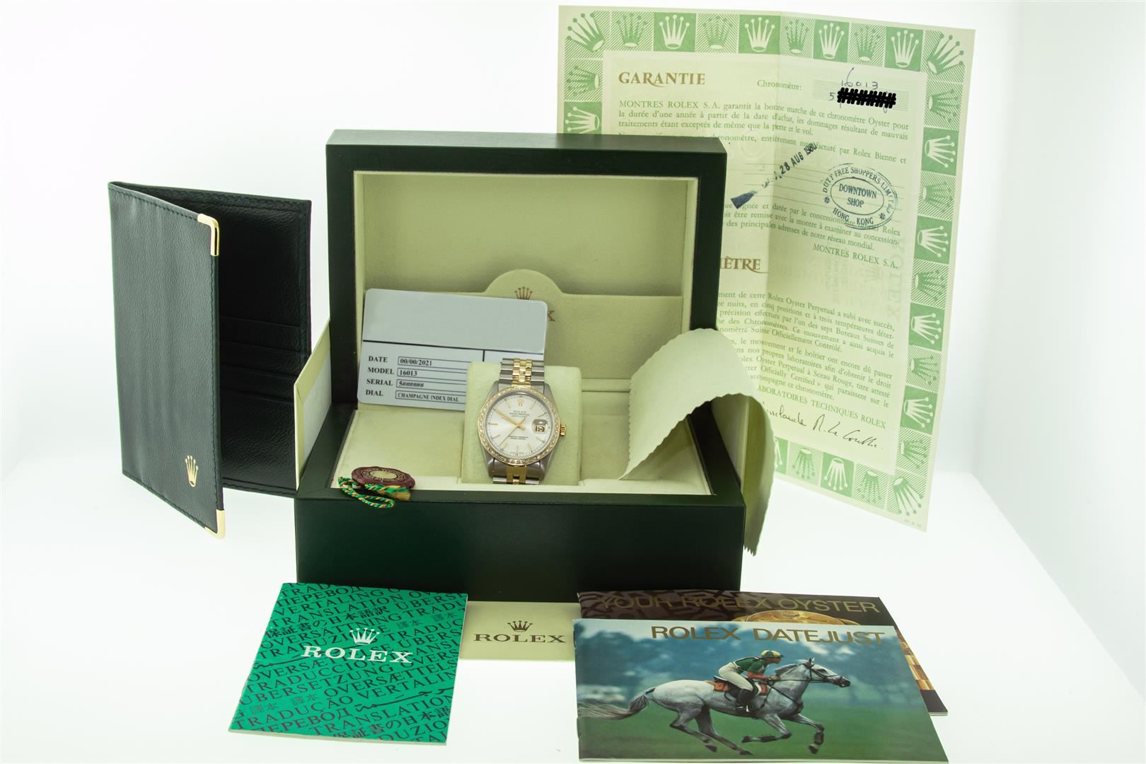 One Mens 18K Yellow Gold & Stainless Steel Two Tone Rolex Oyster Perpetual Datejust Polished, Serviced & Electronically Tested, 18K Yellow Gold & Stainless Steel Case: 36mm, Original 18K Yellow Gold Crown, Custom Bezel: New 18K Yellow Gold Beadset Diamond Bezel, Diamond Count: 44 Diamonds, Total Bezel Weight 1.00 Carat, Clarity: SI-VS, Color: G to H. Custom Crystal: New Scratch Resistant Sappphire Crystal Lens. Hands: Genuine Rolex Luminecent Hands. Movement: Automatic Winding Movement 3035. Original Dial: Original Rolex Factory Silver Index Dial with Roman Track & Lumi Dots, Date Window: 3 O'Clock Position Date Display, Quickset, Model: Datejust, Condition: G-6 Extra Fine. Bracelet: Tight Two Tone 18K Yellow Gold & Stainless Steel Jubilee Showing Little To No Stretch. Bright Polish. 7.0 Inch Length, Adjustable. Standard Clasp, With Rolex Logo. This Watch Has Been Serviced And Polished It Is Free Of All Scratches And Dents. This Watch Comes With The Following Accessories: Rolex Box, Rolex Booklets, Rolex Tag, and Rolex Wallet