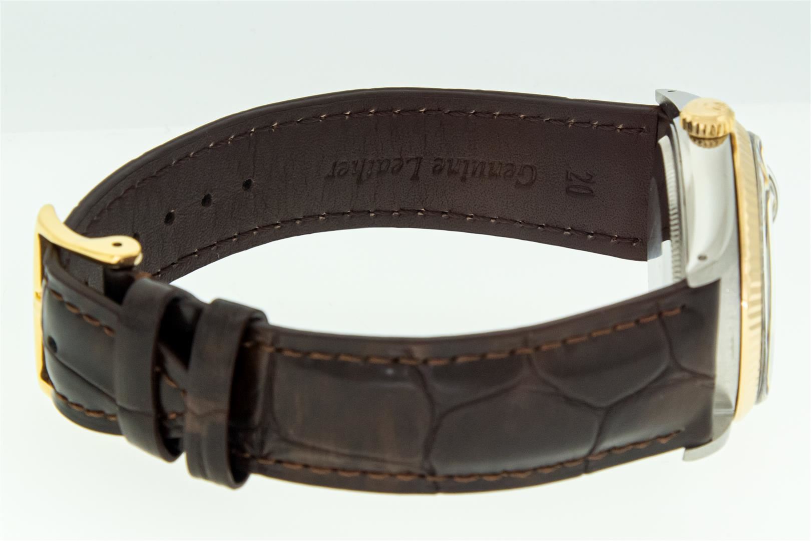 One Mens Pre Owned Two Tone Yellow Gold And Stainless Steel Rolex Datejust Polished, Serviced & Electronically Tested, Rolex Yellow Gold & Stainless Steel Case: 36mm, Rolex Yellow Gold Crown, Rolex Bezel: Yellow Gold Fluted Bezel. Custom Crystal: New Plastic With Date Window. Custom Hands: New Hands. Rolex Movement: Automatic Winding Movement. Rolex Dial: Champagne With Index Hour Markers And Dash Track. Date Window: 3 O'Clock Position Date Display, Quickset, Model: Datejust. Condition: G-6 Extra Fine. Custom Band: New Brown Leather Band 7.0 Inch Length with New Custom Pin Buckle Clasp. This Watch Has Been Serviced And Polished It Is Free Of All Scratches And Dents.