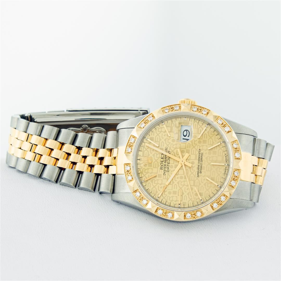 One Mens Quickset Pre Owned Two Tone 14K Yellow Gold And Stainless Steel Datejust Polished, Serviced & Electronically Tested, Rolex Yellow Gold & Stainless Steel Case: 36mm, Rolex 14K Yellow Gold Crown, Custom Bezel: New 18K Yellow Gold Pyramid Diamond Bezel, Diamond Count: 24 Diamonds, Total Weight .75 Carat, Clarity: SI-VS, Color: G to H. Custom Crystal: New Sapphire With Magnified Date Window. Custom Hands: New Luminecent Hands. Rolex Movement: Automatic Winding Movement 3035. Rolex Dial: Champagne Jubilee Dial With Index Hour Markers and Small Track With Lumi Dots. Date Window: 3 O'Clock Position Date Display, Quickset, Model: Datejust. Condition: G-6 Extra Fine. Rolex Bracelet: Two Tone 14K Yellow Gold & Stainless Steel Jubilee Band. Bright Polish. 7.0 Inch Length, Adjustable. Standard Clasp, With Rolex Logo. This Watch Has Been Serviced Time Tested And Is In Excellent Condition It Is Free Of All Scratches And Dents.