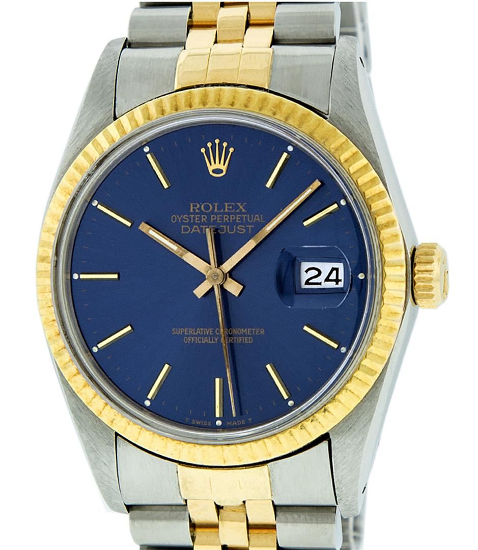 One Mens Rolex Pre Owned Two Tone 14K Yellow Gold And Stainless Steel Datejust Polished, Serviced & Electronically Tested, Rolex Yellow Gold & Stainless Steel Case: 36mm, Rolex Yellow Gold Crown, Rolex Bezel: 14K Yellow Gold Fluted Bezel. Custom Crystal: New Acrylic With Magnified Date Window. Rolex Hands: Luminecent Hands. Rolex Movement: Automatic Winding Movement 3035. Rolex Dial: Blue Index Dial With Index Track. Date Window: 3 O'Clock Position Date Display, Quickset, Model: Datejust. Condition: G-6 Extra Fine. Rolex Bracelet: Two Tone 14K Yellow Gold & Stainless Steel Jubilee Band. Bright Polish. 7.0 Inch Length, Adjustable. Standard Clasp, With Rolex Logo. This Watch Has Been Serviced Time Tested And Is In Excellent Condition It Is Free Of All Scratches And Dents.