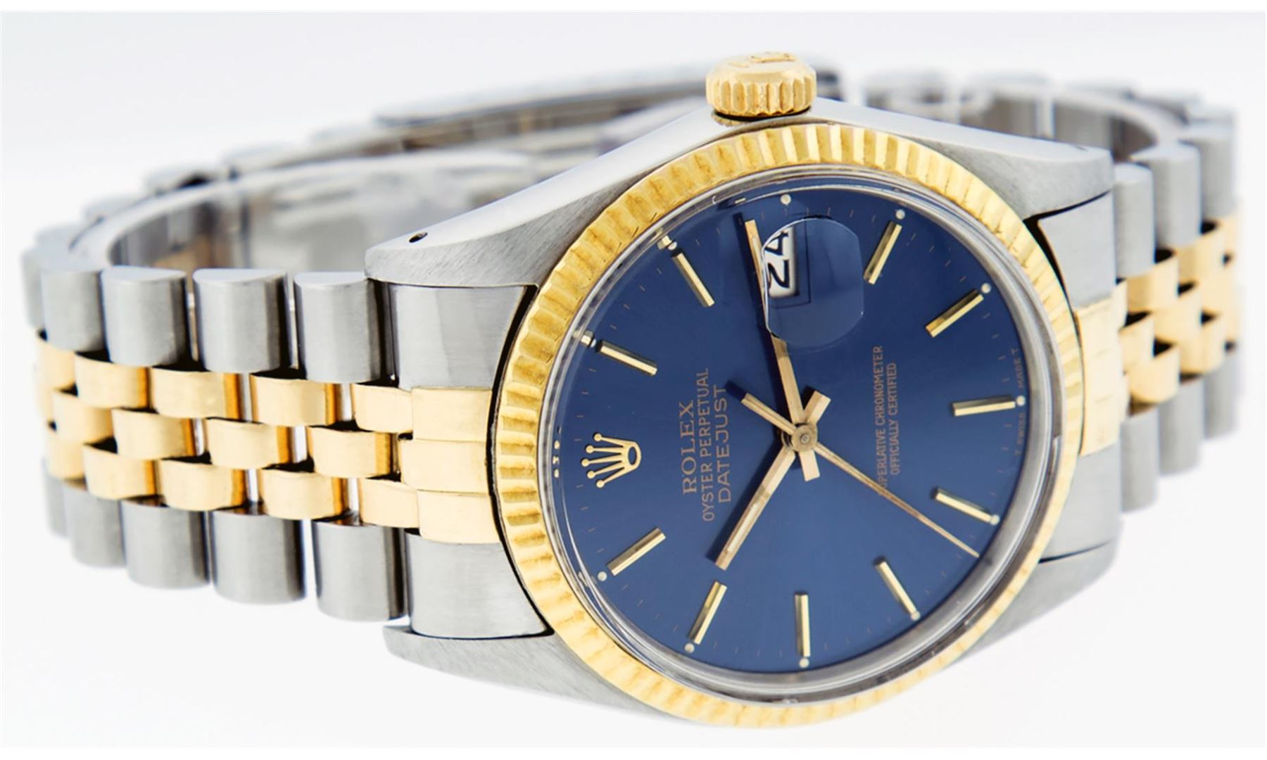 One Mens Rolex Pre Owned Two Tone 14K Yellow Gold And Stainless Steel Datejust Polished, Serviced & Electronically Tested, Rolex Yellow Gold & Stainless Steel Case: 36mm, Rolex Yellow Gold Crown, Rolex Bezel: 14K Yellow Gold Fluted Bezel. Custom Crystal: New Acrylic With Magnified Date Window. Rolex Hands: Luminecent Hands. Rolex Movement: Automatic Winding Movement 3035. Rolex Dial: Blue Index Dial With Index Track. Date Window: 3 O'Clock Position Date Display, Quickset, Model: Datejust. Condition: G-6 Extra Fine. Rolex Bracelet: Two Tone 14K Yellow Gold & Stainless Steel Jubilee Band. Bright Polish. 7.0 Inch Length, Adjustable. Standard Clasp, With Rolex Logo. This Watch Has Been Serviced Time Tested And Is In Excellent Condition It Is Free Of All Scratches And Dents.
