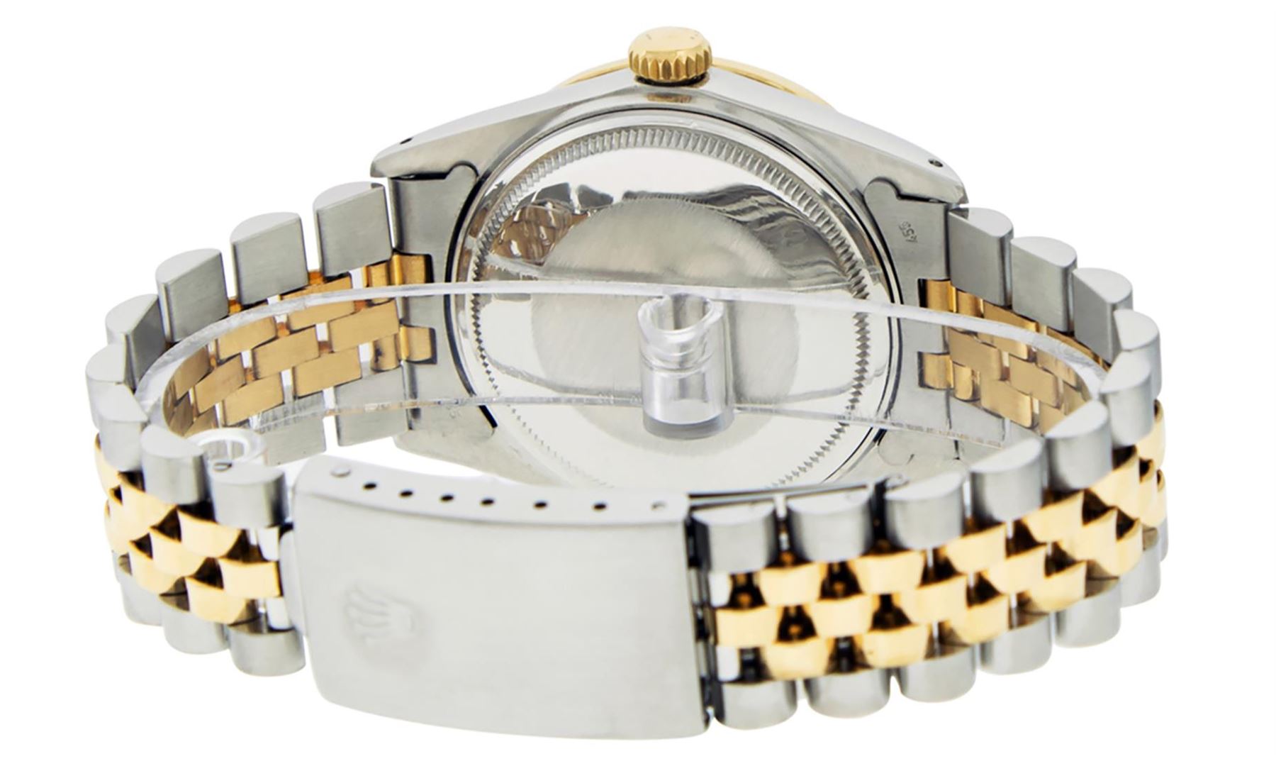 One Mens Rolex Pre Owned 14K Yellow Gold and Stainless Steel Two Tone Datejust Polished, Serviced & Electronically Tested, Rolex Yellow Gold & Stainless Steel Case: 36mm, Rolex Yellow Gold Crown, Custom Bezel: New 18K Yellow Gold Beadset Diamond Bezel, Diamond Count: 44 Diamonds, Total Weight 1.00 Carat, Clarity: SI-VS, Color: G to H. Custom Crystal: New Sapphire With Magnified Lens. Custom Hands: New Luminecent Hands. Rolex Movement: Automatic Winding Movement 3035. Rolex Dial: White Roman With Square Track. Date Window: 3 O'Clock Position Date Display, Quickset, Model: Condition: G-6 Extra Fine. Rolex Bracelet: Two Tone 14K Yellow Gold & Stainless Steel Jubilee Band. Bright Polish. 7.0 Inch Length, Adjustable. Standard Clasp, With Rolex Logo. This Watch Has Been Serviced Time Tested And Is In Excellent Condition It Is Free Of All Scratches And Dents.