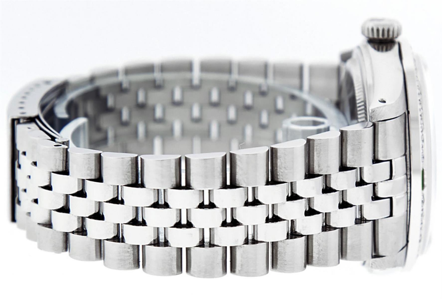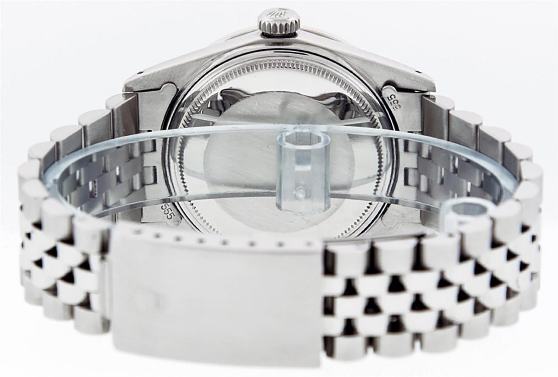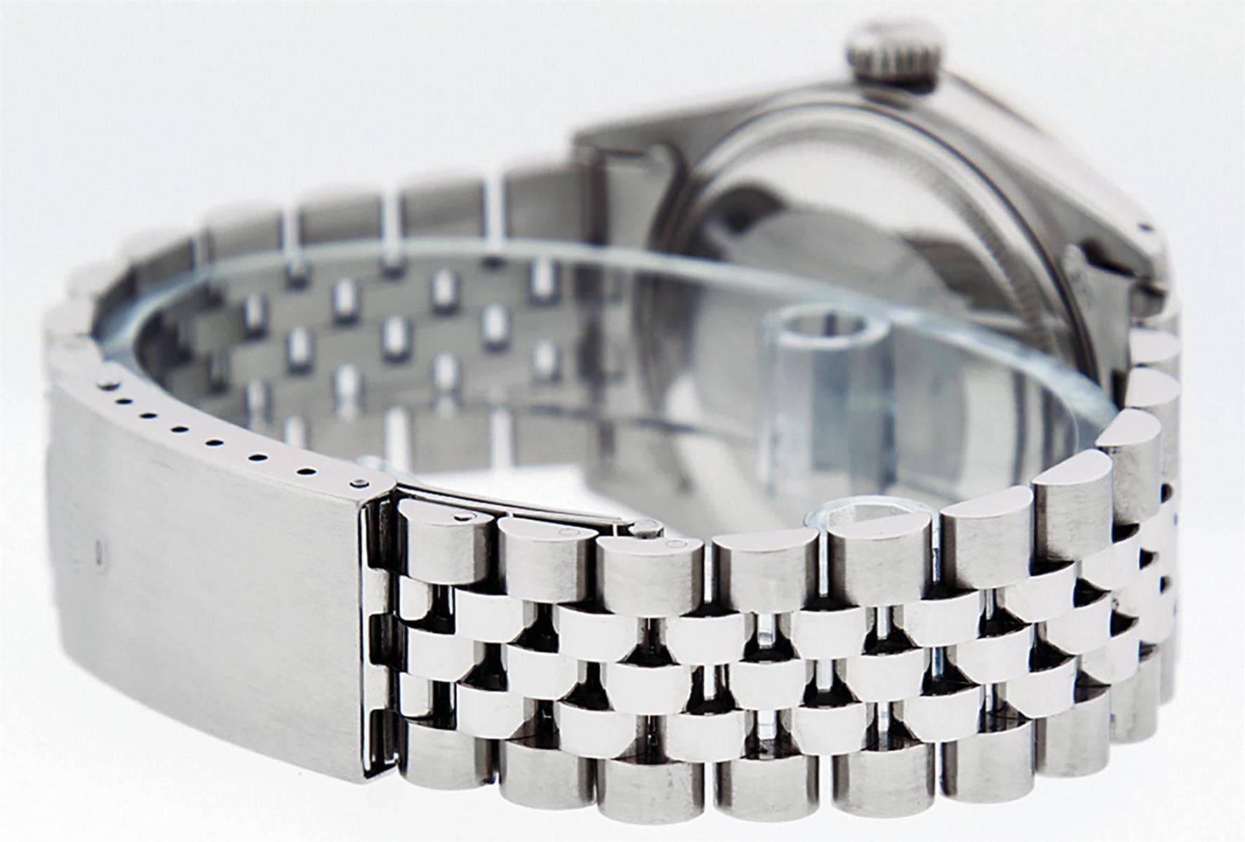 One Mens Stainless Steel Rolex Datejust Polished, Serviced & Electronically Tested, Stainless Steel Case: 36mm, Stainless Steel Crown, Custom Bezel: New 18K White Gold Emerald Beadset Diamond Bezel, Diamond + Gem Count: 36 Diamonds + 4 Emeralds, Total Weight 1.00 Carat, Clarity: SI-VS, Color: G to H. Custom Crystal: New Scratch Resistant Synthetic Sapphire Cyclops Lens. Custom Hands: New Luminescent Hands. Movement: Automatic Winding Movement. Custom Dial: Black Diamond Dial, 10 Diamonds in Dial, G To H In Color, Clarity: SI-VS. Date Window: 3 O'Clock Position Date Display, Quickset, Model: Datejust. Condition: G-6 Extra Fine. Bracelet: Stainless Steel Jubilee Band. Bright Polish & Satin Finish. 7.0 Inch Length, Adjustable. Standard Clasp, With Rolex Logo. This Watch Has Been Serviced Time Tested And Is In Excellent Condition It Is Free Of All Scratches And Dents.