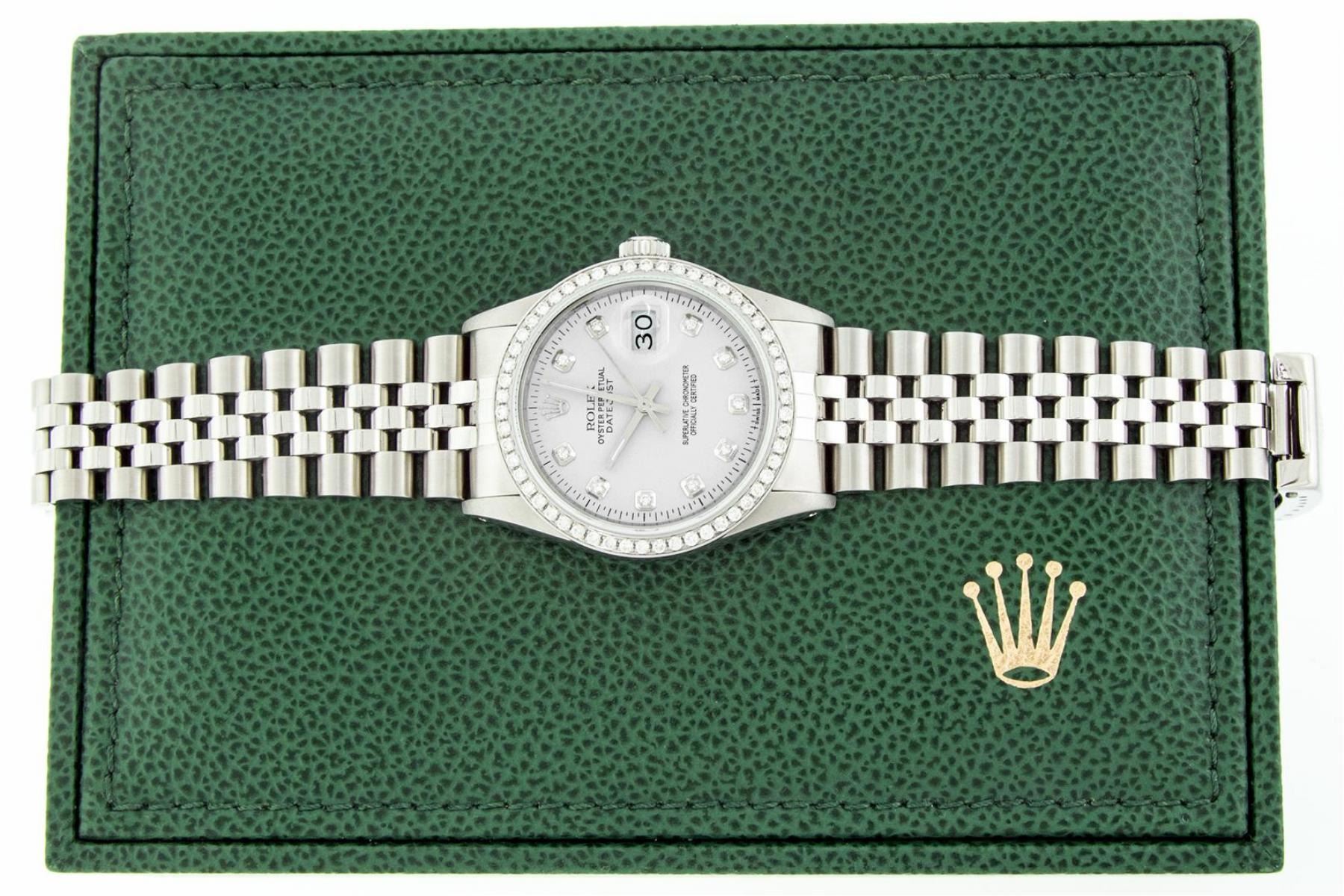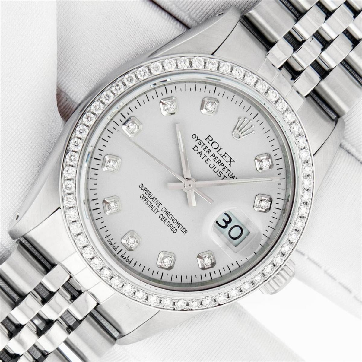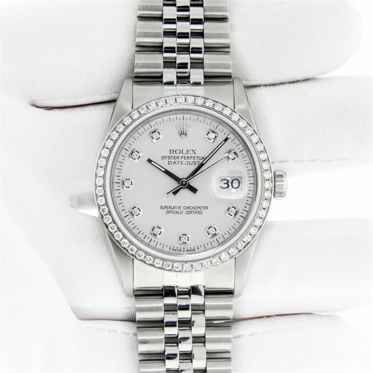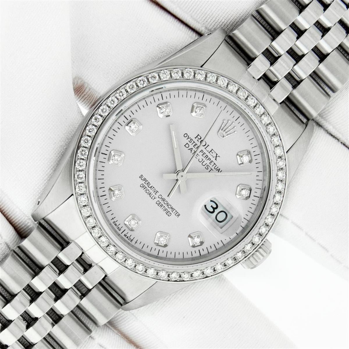 One Mens Rolex Stainless Steel Datejust Polished Bright with Satin Finish, This Watch Has Been Serviced & Electronically Tested, Stainless Steel Case: 36mm, Stainless Steel Crown, Custom Bezel: New Stainless Steel Beadset Diamond Bezel, Diamond Count: 54 Diamonds In Bezel, Total Weight 1.00 Carat, Clarity: SI-VS, Color: G to H. Custom Crystal: New Scratch Resistant Synthetic Sapphire Cyclops Lens. Custom Hands: New Luminescent Hands. Movement: Automatic Winding Movement. Custom Dial: Silver Diamond Dial, Diamond Count: 10 Diamonds In Dial, Color: G to H, Clarity: VS2-SI1. Date Window: 3 O'Clock Position Date Display, Quickset, Model: Datejust. Condition: G-6 Extra Fine. Bracelet: Stainless Steel Jubilee Band. Bright Polish & Satin Finish. 7.0 Inch Length, Adjustable. Standard Clasp, With Rolex Logo. This Watch Has Been Serviced Time Tested And Is In Excellent Condition It Is Free Of All Scratches And Dents.