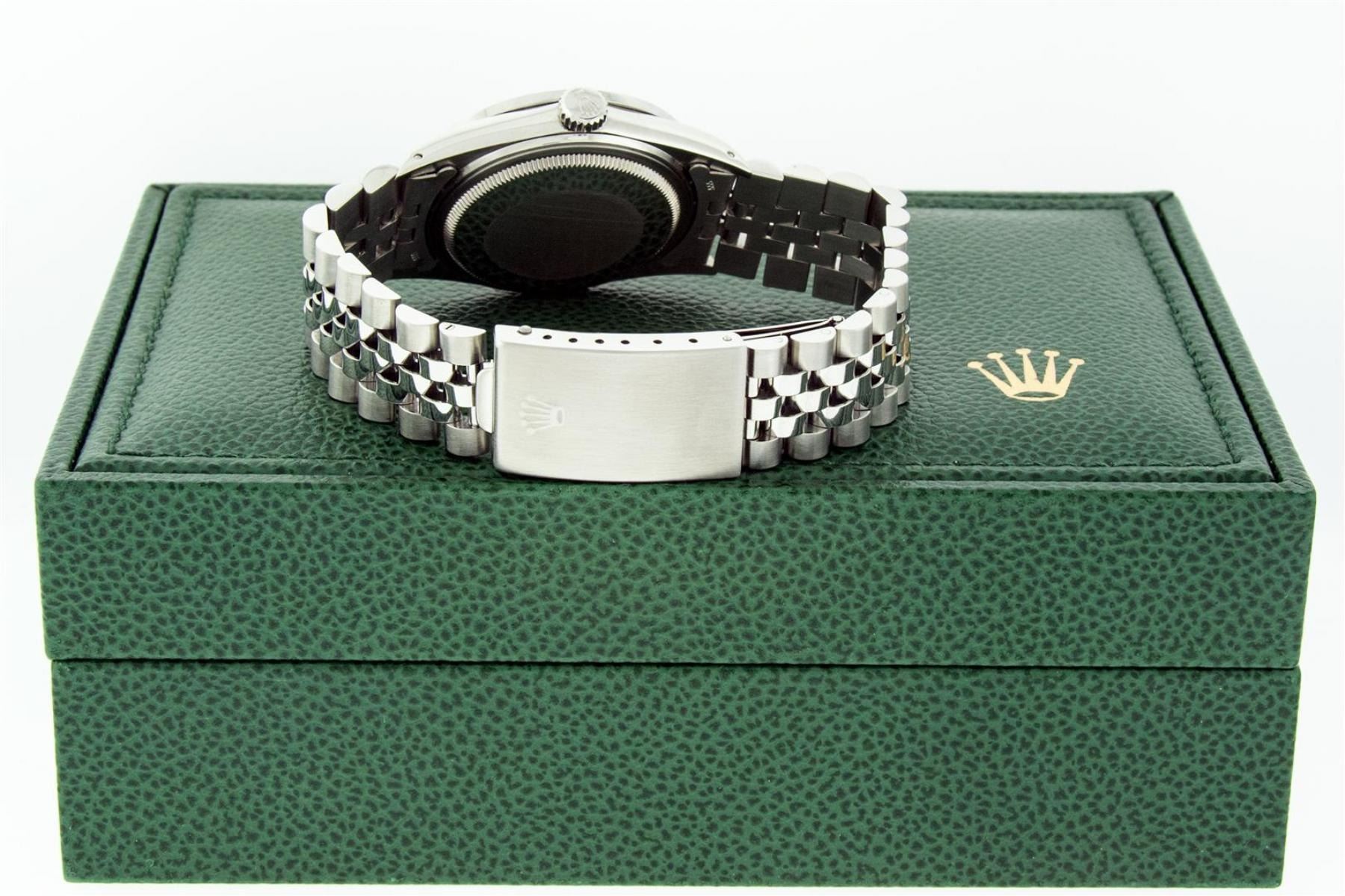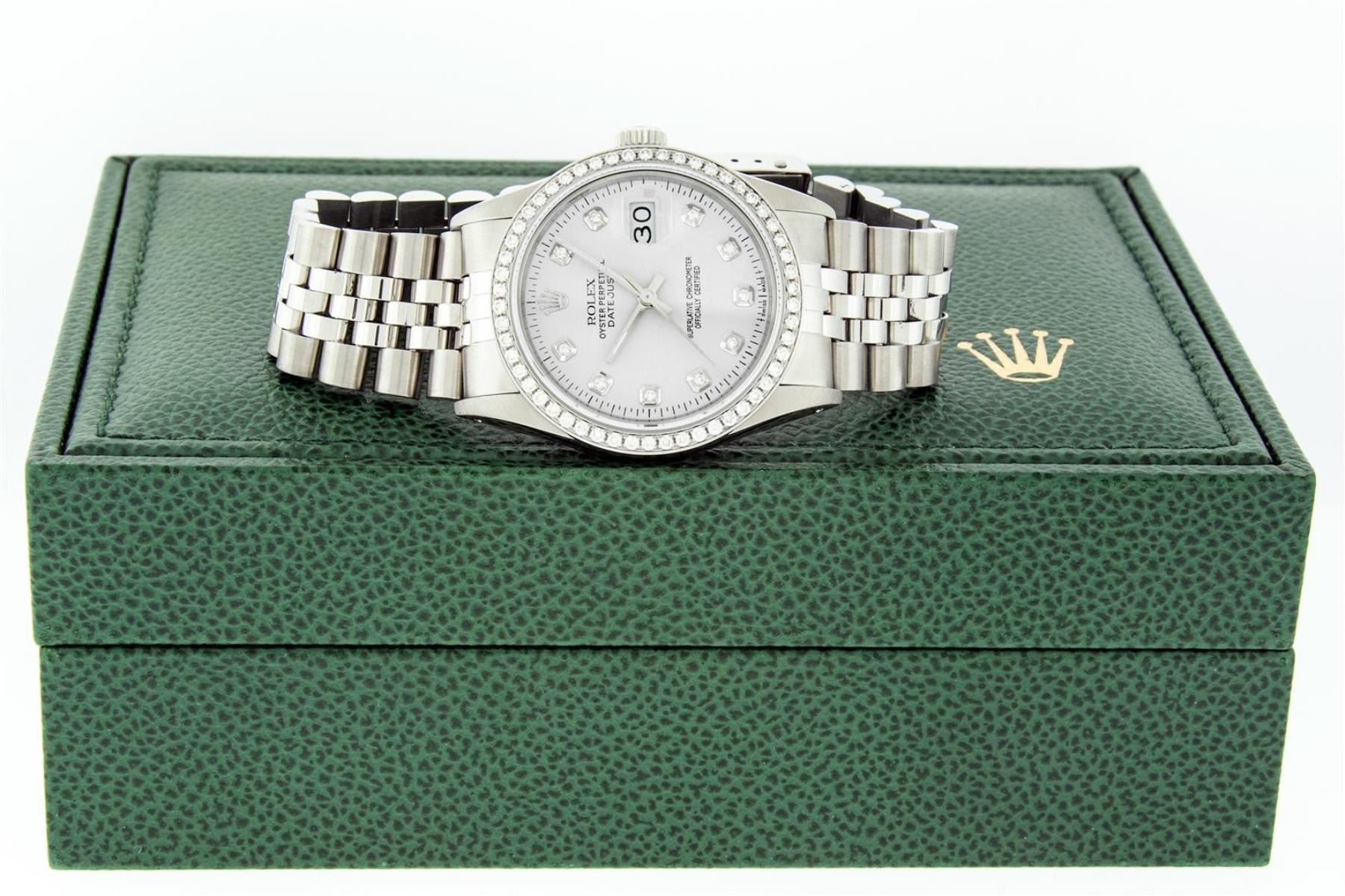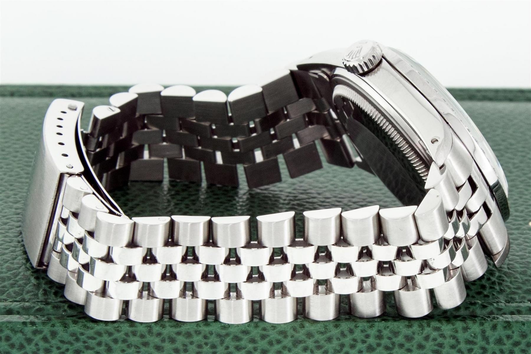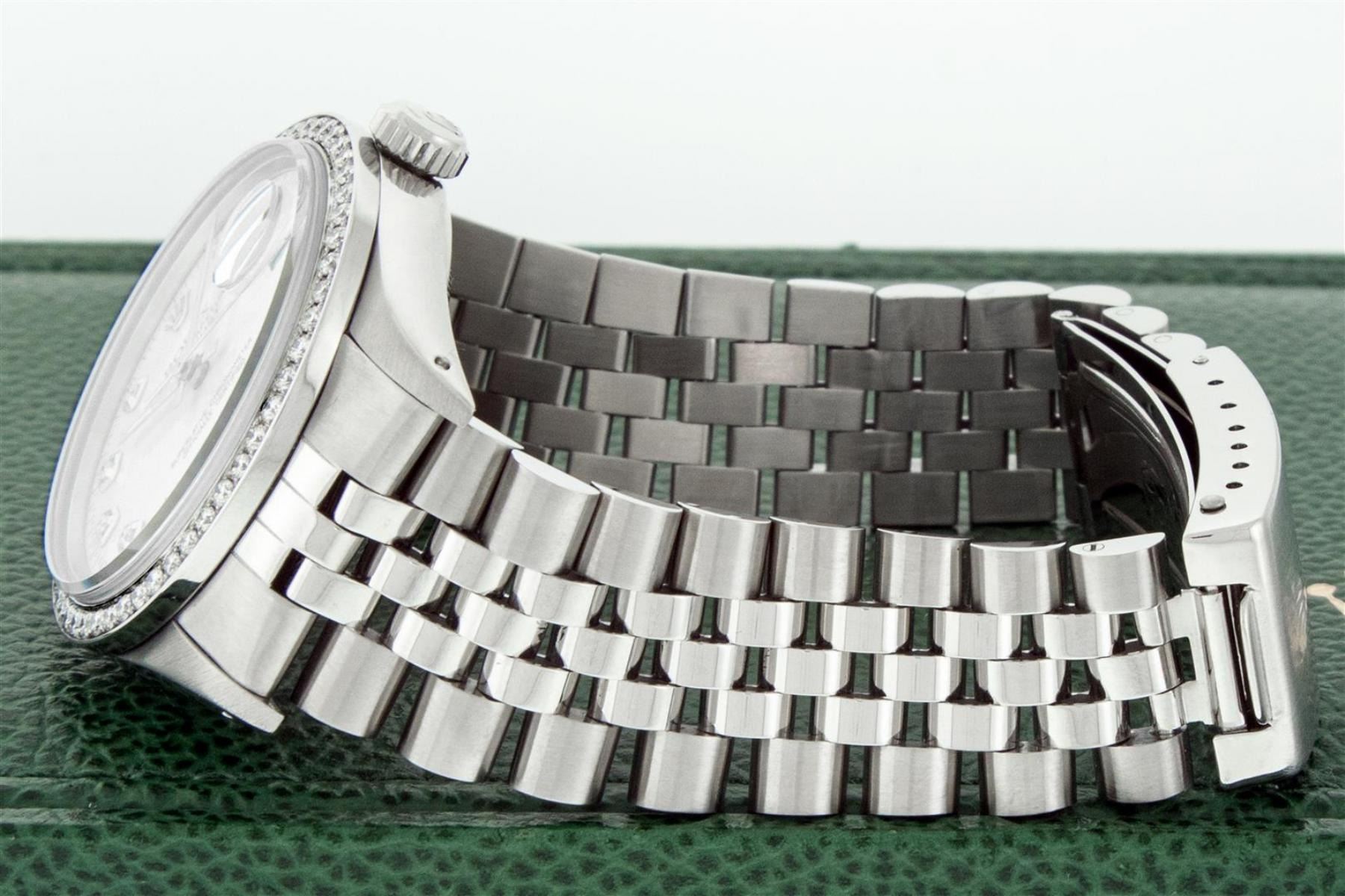 One Mens Rolex Stainless Steel Datejust Polished Bright with Satin Finish, This Watch Has Been Serviced & Electronically Tested, Stainless Steel Case: 36mm, Stainless Steel Crown, Custom Bezel: New Stainless Steel Beadset Diamond Bezel, Diamond Count: 54 Diamonds In Bezel, Total Weight 1.00 Carat, Clarity: SI-VS, Color: G to H. Custom Crystal: New Scratch Resistant Synthetic Sapphire Cyclops Lens. Custom Hands: New Luminescent Hands. Movement: Automatic Winding Movement. Custom Dial: Silver Diamond Dial, Diamond Count: 10 Diamonds In Dial, Color: G to H, Clarity: VS2-SI1. Date Window: 3 O'Clock Position Date Display, Quickset, Model: Datejust. Condition: G-6 Extra Fine. Bracelet: Stainless Steel Jubilee Band. Bright Polish & Satin Finish. 7.0 Inch Length, Adjustable. Standard Clasp, With Rolex Logo. This Watch Has Been Serviced Time Tested And Is In Excellent Condition It Is Free Of All Scratches And Dents.