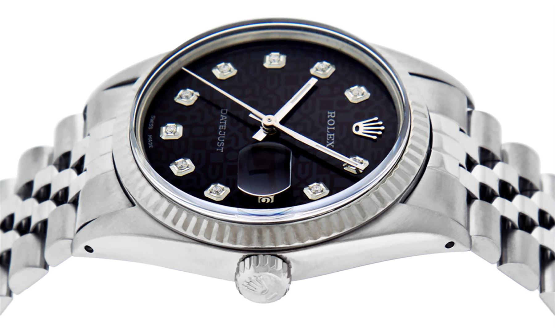 One Mens Stainless Steel Rolex Datejust Polished Bright with Satin Finish, This Watch Has Been Serviced & Electronically Tested, Stainless Steel Case: 36mm, Stainless Steel Crown, Bezel: 14K White Gold Fluted Bezel. Custom Crystal: New Acrylic Cyclops Lens. Custom Hands: New Luminescent Hands. Movement: Automatic Winding Movement. Custom Dial: Black Diamond Dial With Diamond Hour Markers, Diamond Count: 10 Diamonds in Dial G To H In Color, SI-VS Clarity. Date Window: 3 O'Clock Position Date Display, Quickset, Model: Datejust, Condition: G-6 Extra Fine. Bracelet: Stainless Steel Jubilee Band. Bright Polish & Satin Finish. 7.0 Inch Length, Adjustable. Standard Clasp, With Rolex Logo. This Watch Has Been Serviced Time Tested And Is In Excellent Condition It Is Free Of All Scratches And Dents.